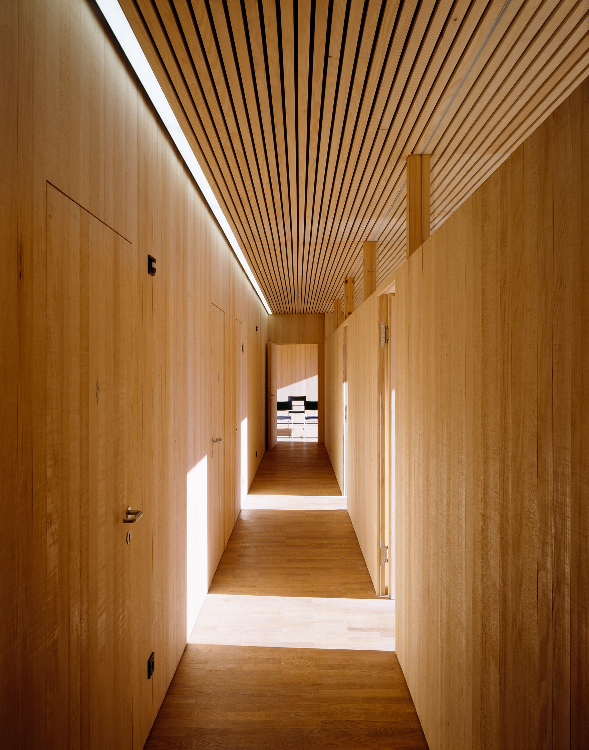 Both roofs feature cantilevered stringcourses which protect the natural timber facades, the large-format doors, and glazing from rain, wind and weather. Below these bitumen-clad timber slabs, adjustable, cable-mounted sunscreens shade the window areas. The lightly sloping terrain allows for skylights on the southeast side of the basement, providing daylight to the club rooms that are situated there. The universal application of silver fir, used on all surfaces, from walls to furniture, unifies the interior creating a harmonious atmosphere with appealing visual, acoustic and sensual qualities.