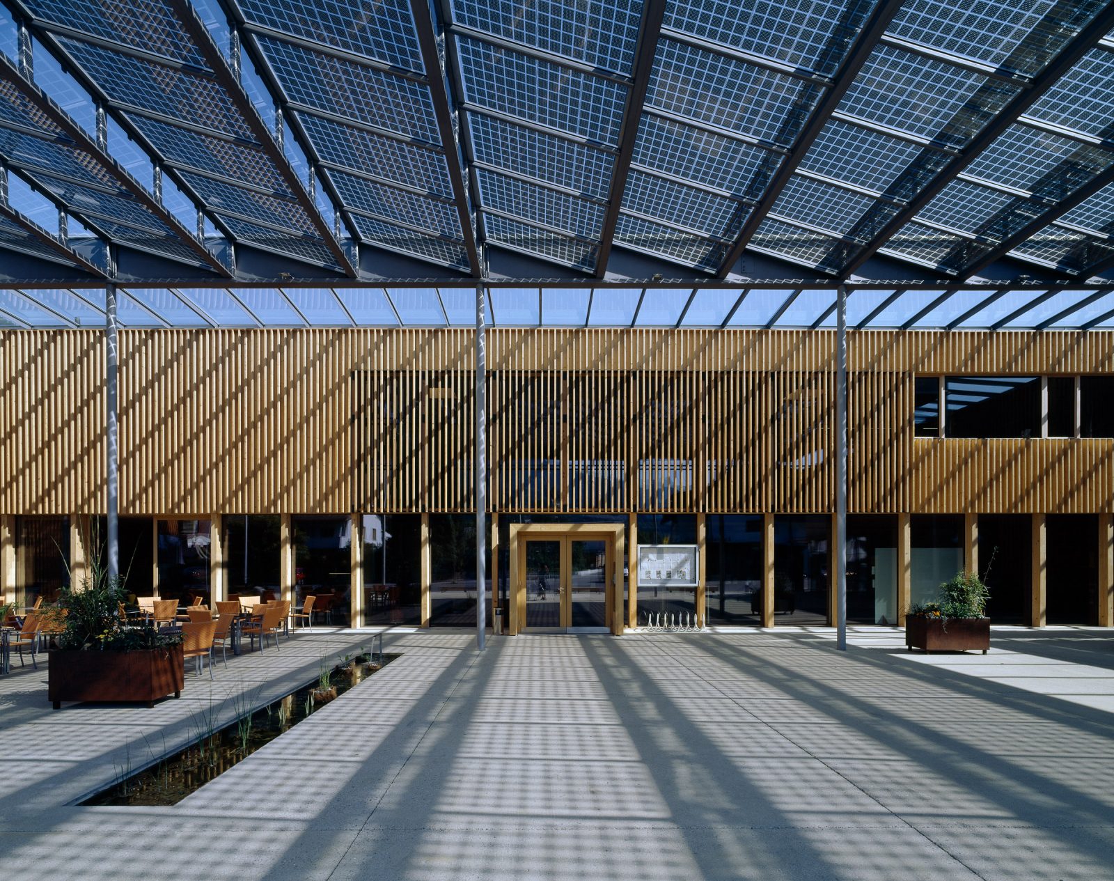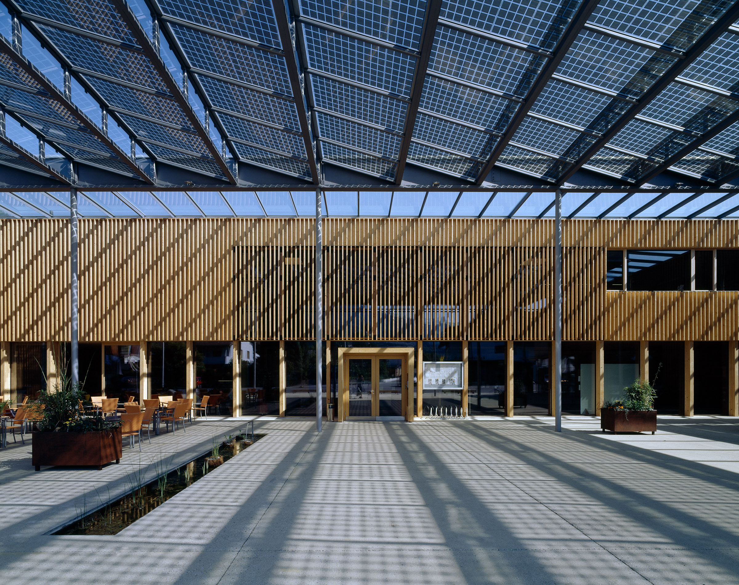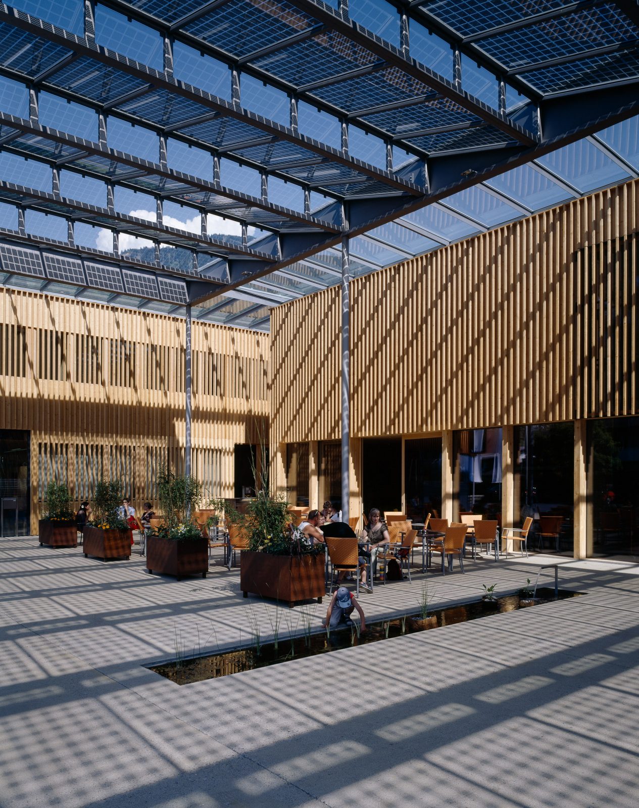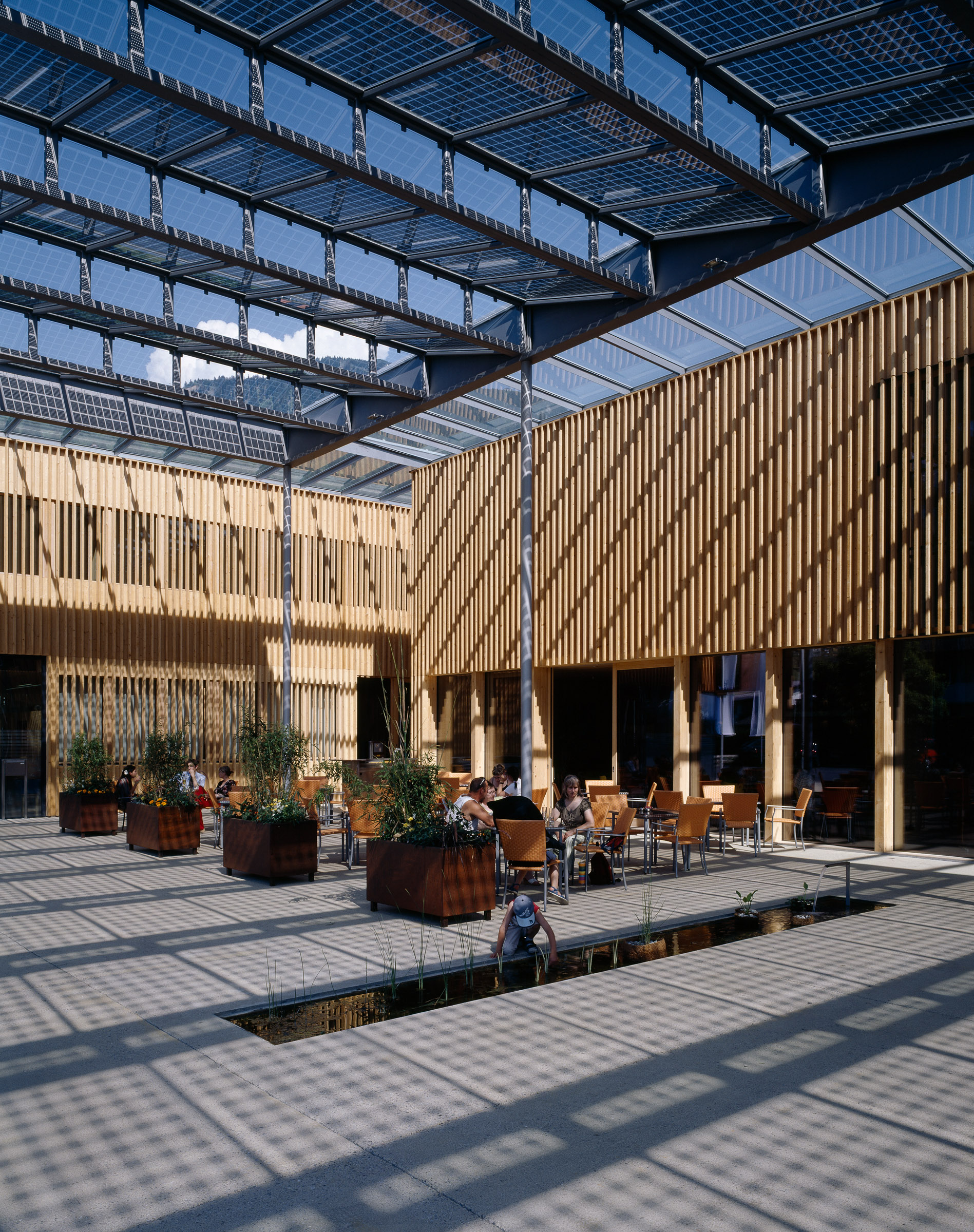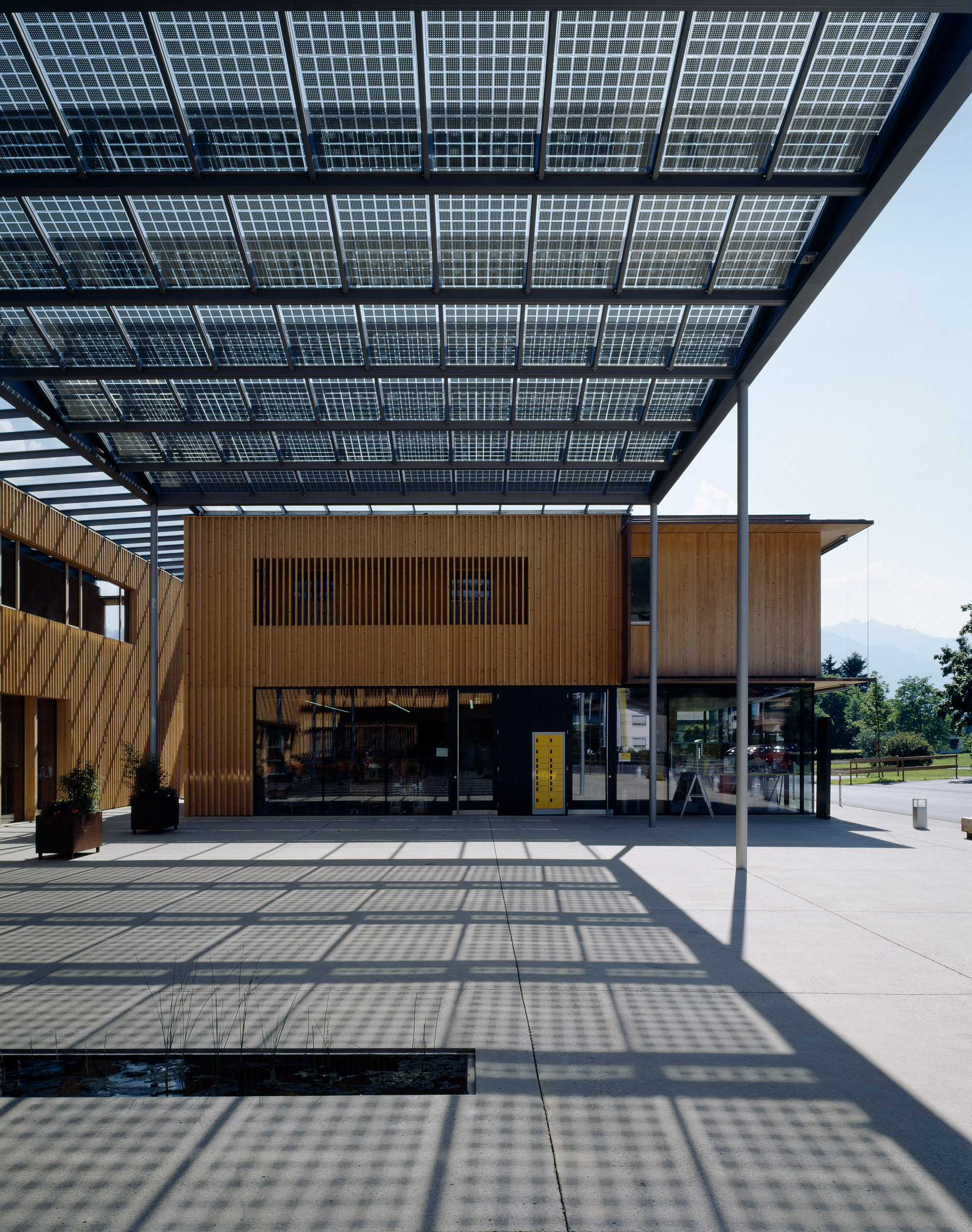 Early in the planning, the town council decided to cover the newly created town square to allow for a variety of uses in all weather. After conducting several preliminary studies, an innovative, environmentally friendly and multifunctional solution was created. The translucent photovoltaic panels, with a surface area of 350 m2, are not just a weather protection design for the covered square, the timber facade and the windows; they also generate 16,000 kWh of electricity each year. The power generated is fed into the grid of the Vorarlberg Kraftwerke (regional power plant) and supplies electricity to five households.