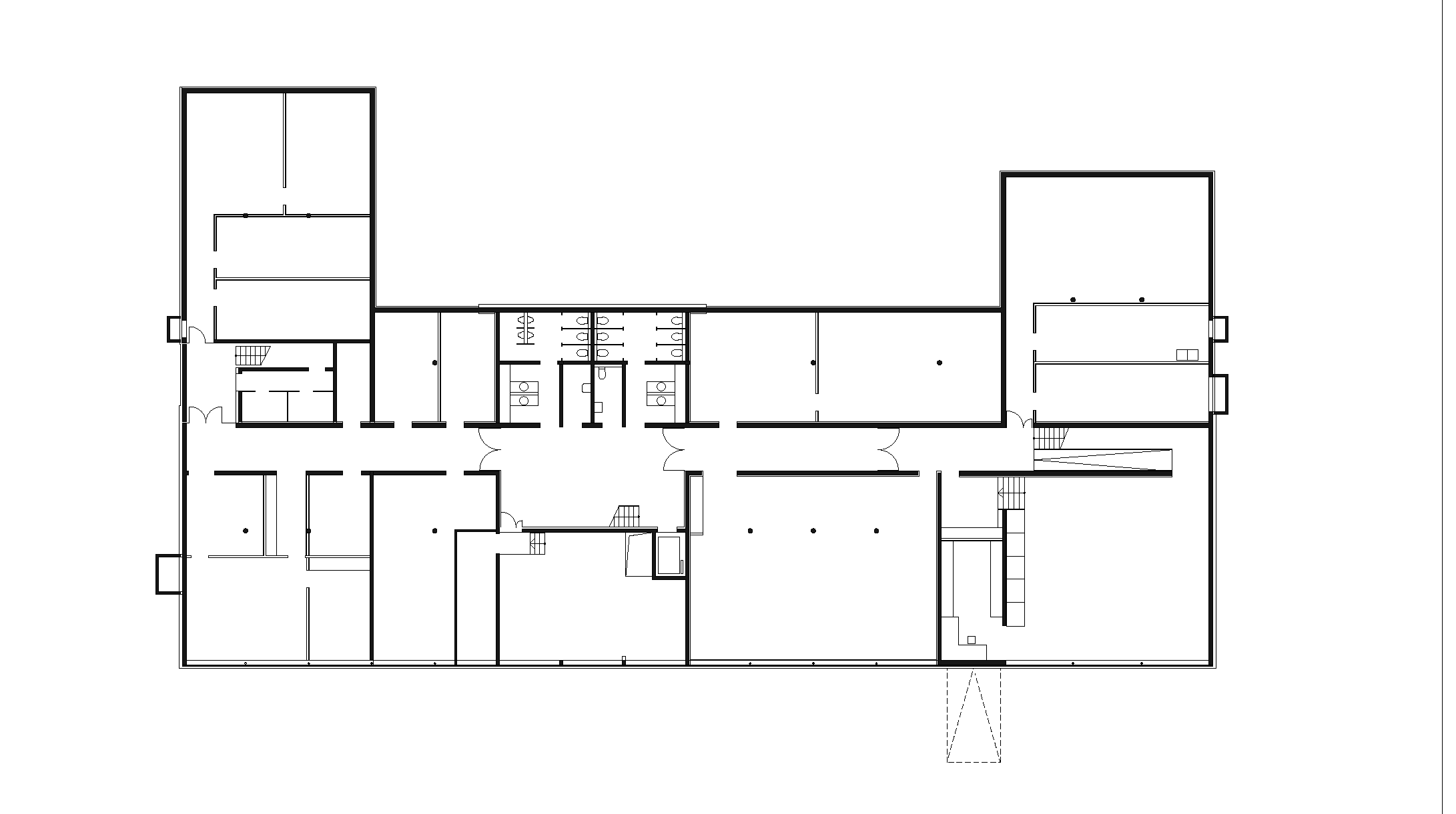 The three blocks of the community centre enclose and define a forecourt. Between each of the separate blocks, alleyways define the areas of the community centre and allow separate access routes to the forecourt. Each block is assigned a specific function: the ground level features a post office, a shop, the large foyer, the library, the café, the 100-person capacity hall, a physiotherapy practice and a day nursery; the upper floor houses offices, seminar rooms, the archives, the computer centre and toilet facilities; while the basement, with its adjoining rooms, contains rehearsal and club rooms and connects the various blocks of the community centre complex.