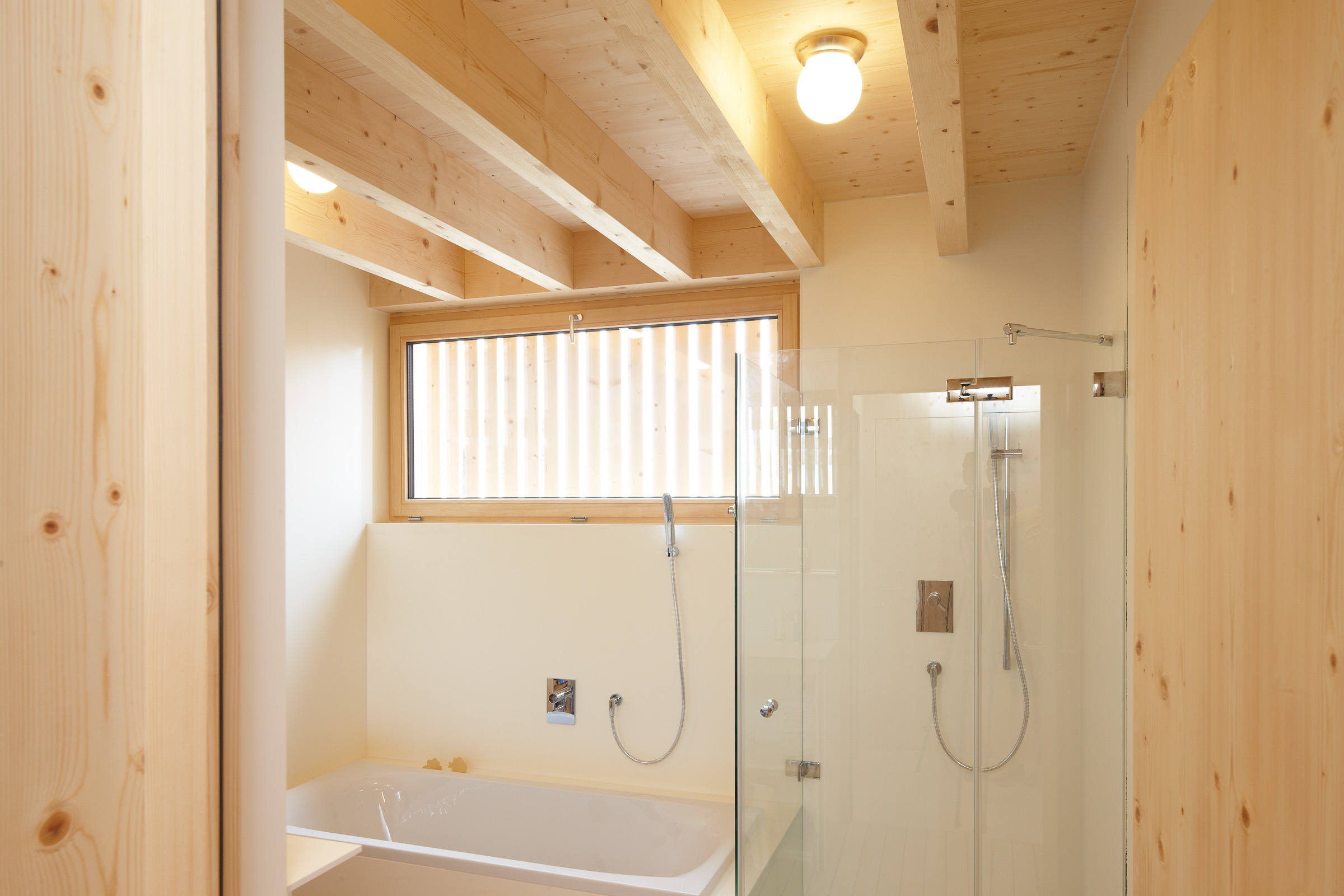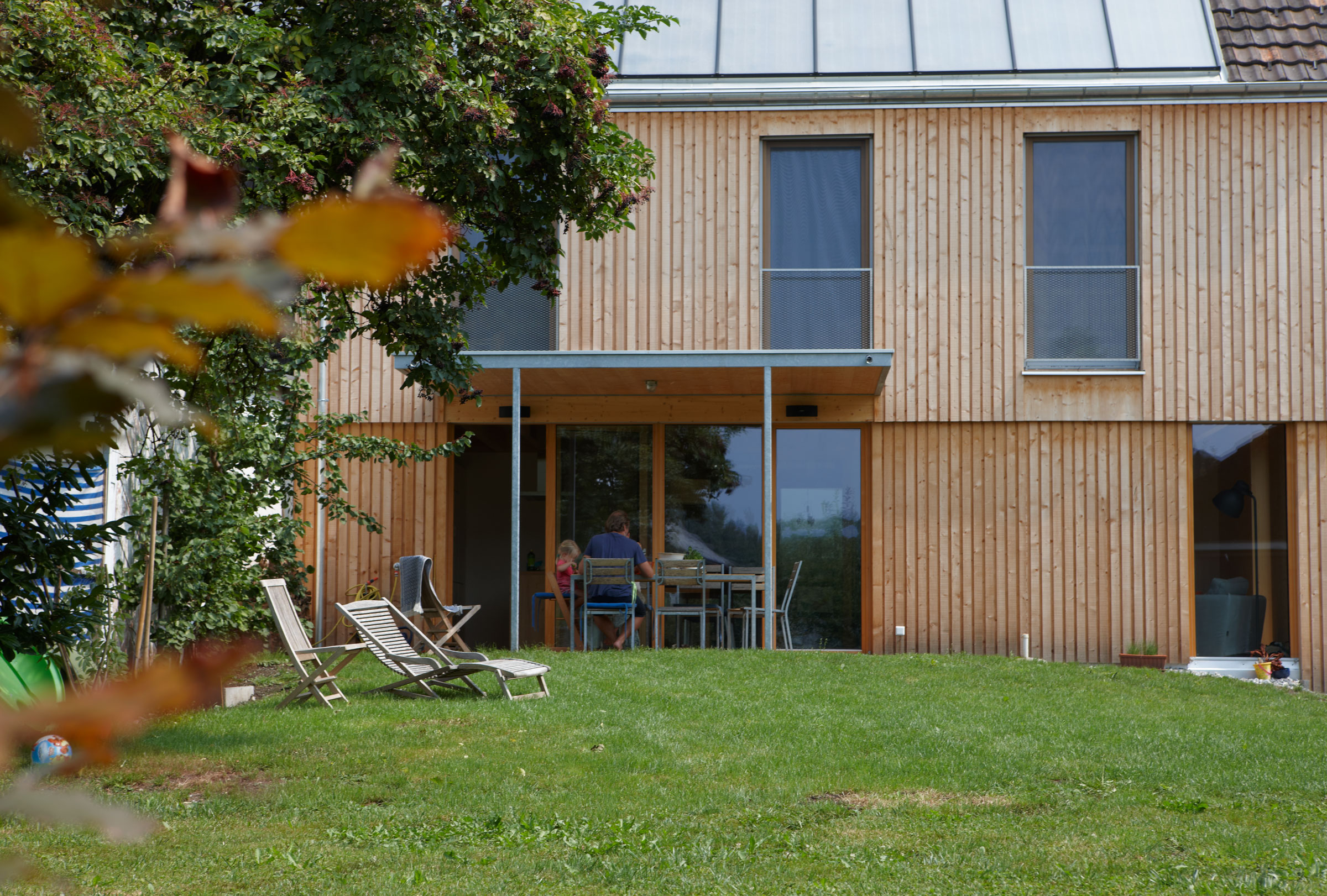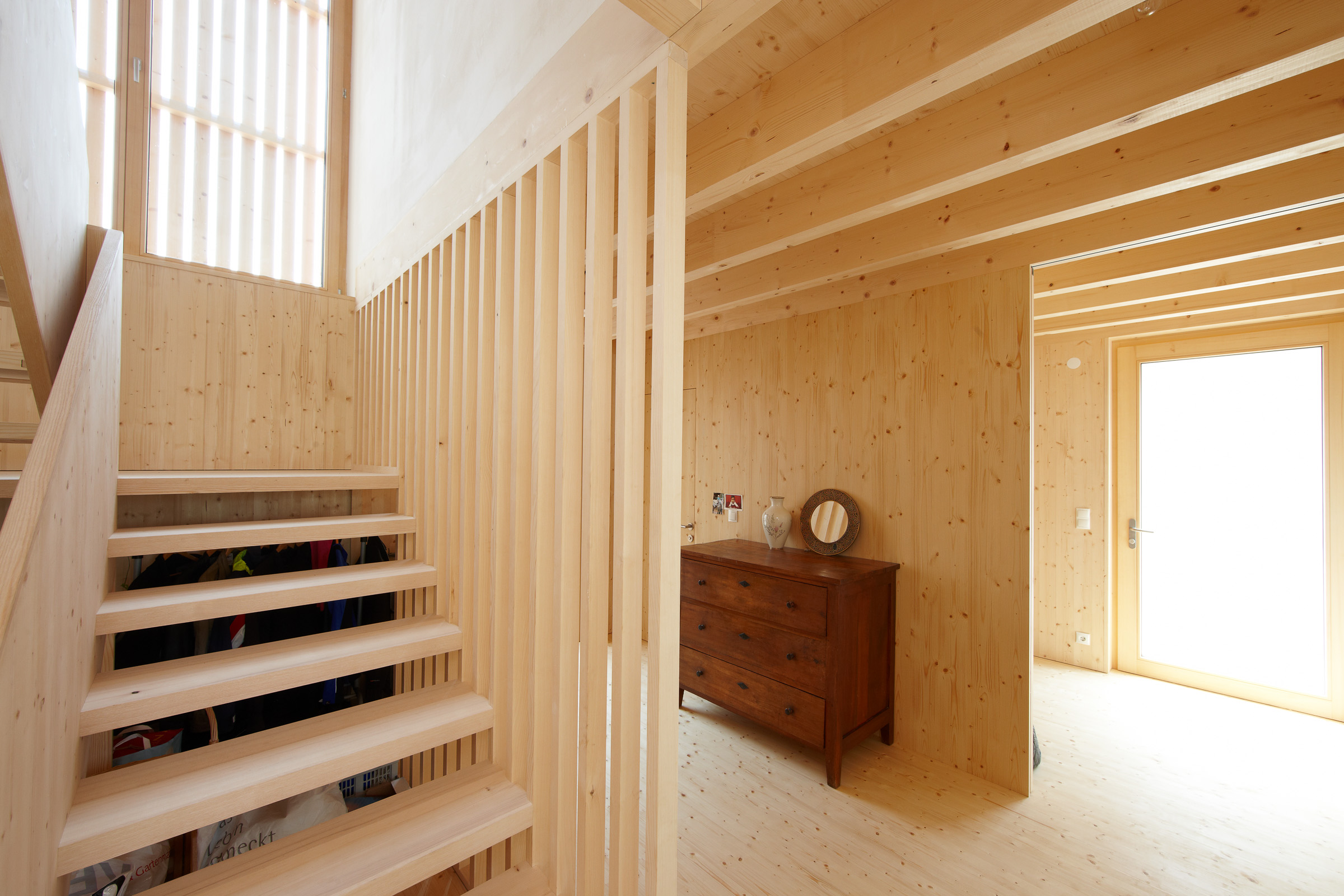 It is entirely made of prefabricated spruce timber elements. Open beam ceilings reduce disturbing flutter echoes with their geometry. The organisation of the living space is based on the rhythm of the load-bearing wall panels in the central axis of the building, which follow the logical pattern of the standing purlin roof. In the centre of the house is a wood burner; over this is the storage heater tank in the attic, so comfortable warmth is distributed throughout the entire building volume.