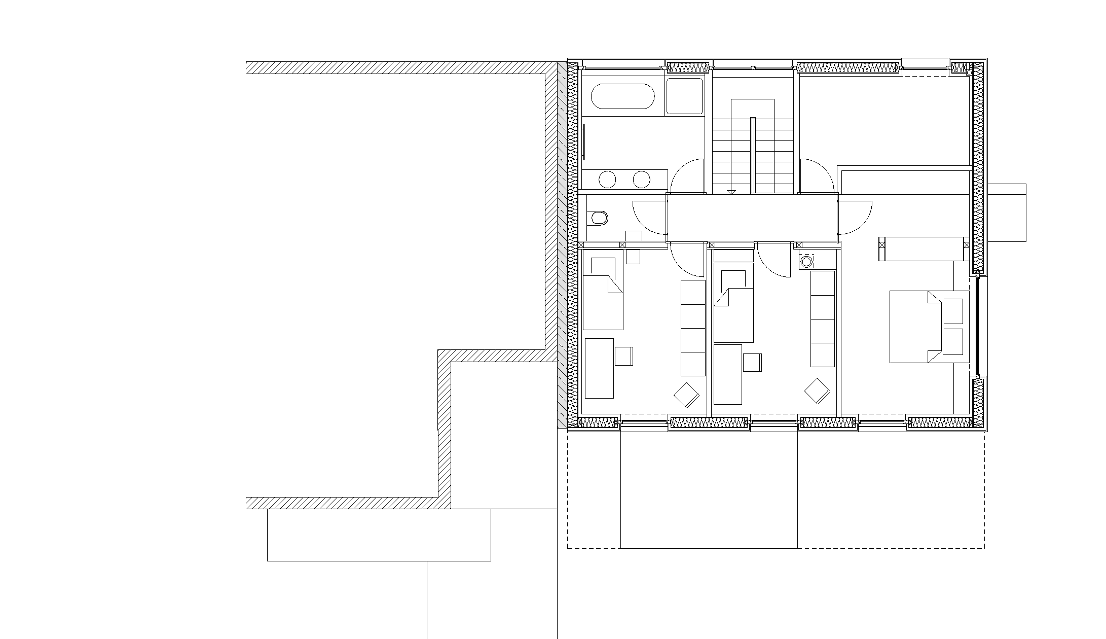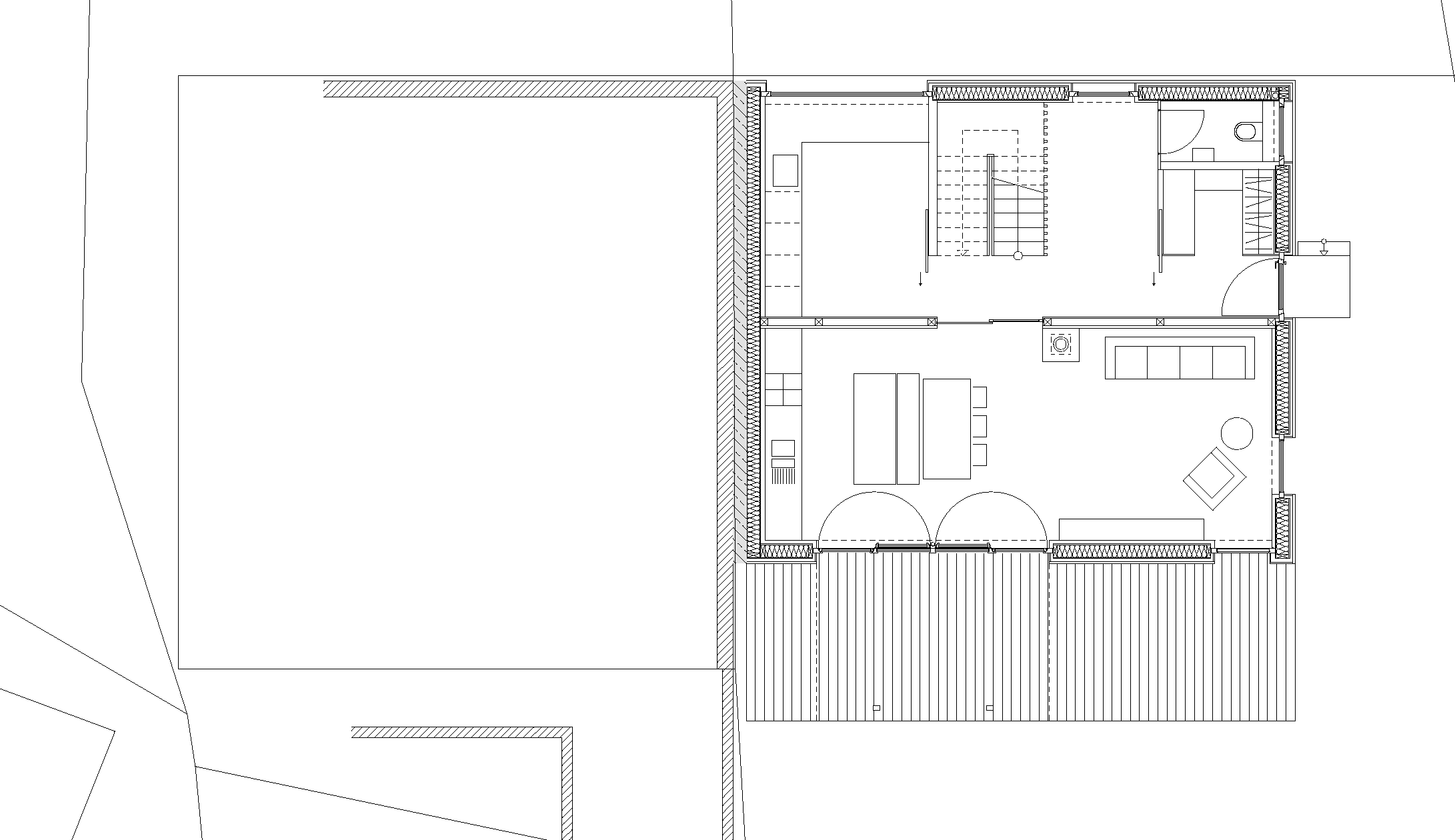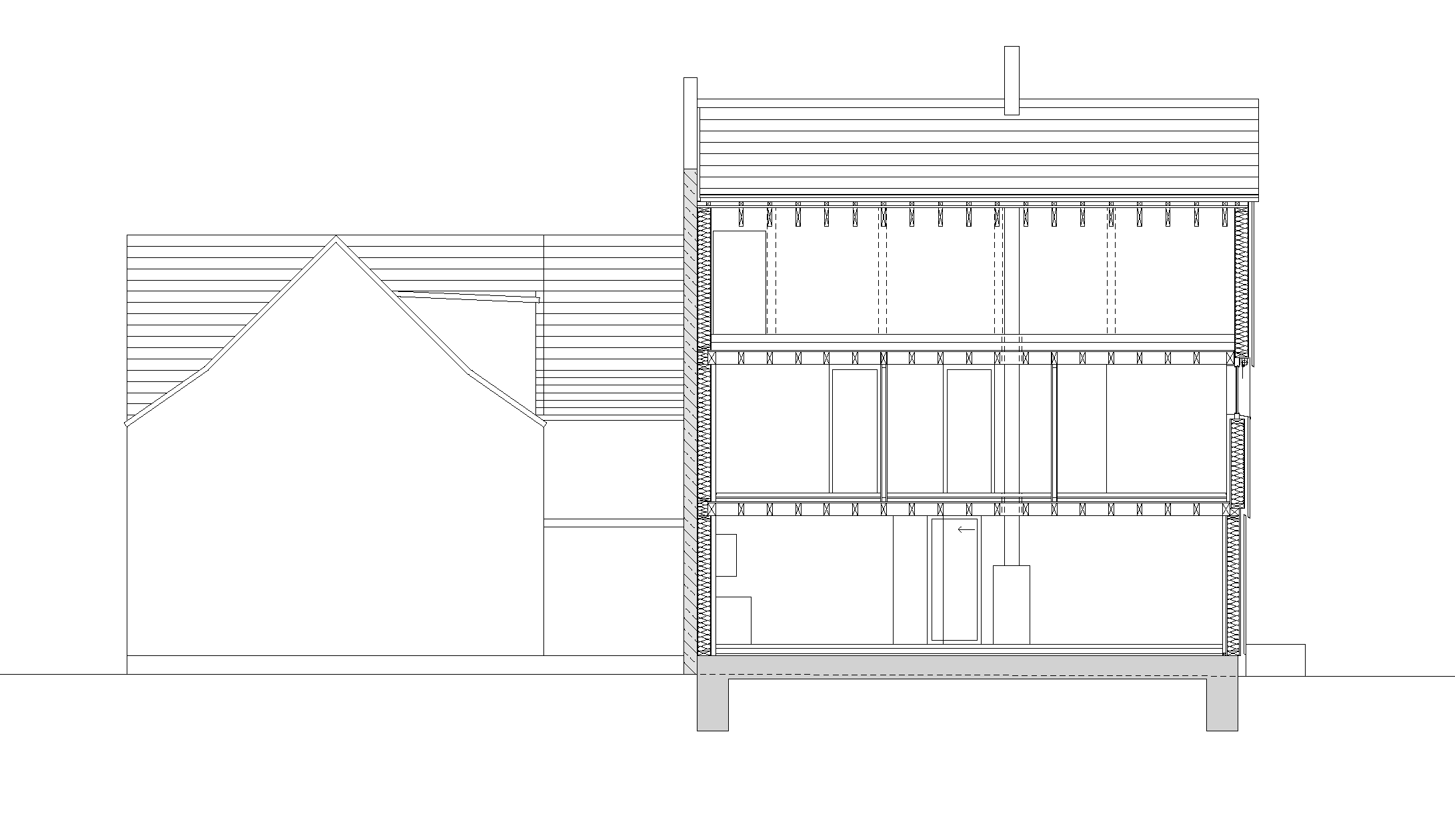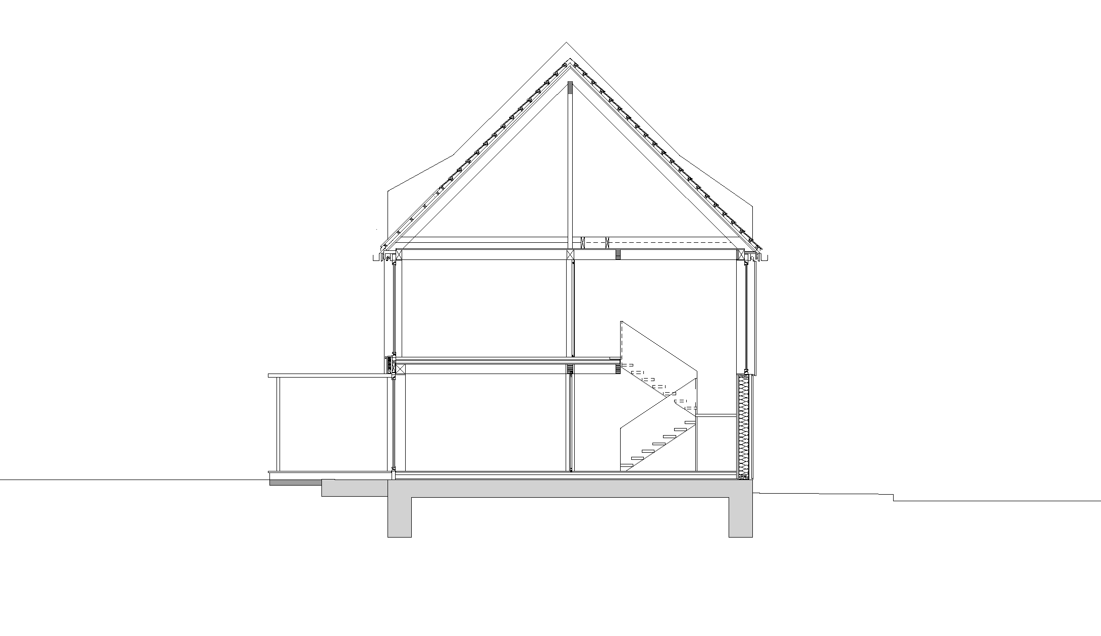 It is entirely made of prefabricated spruce timber elements. Open beam ceilings reduce disturbing flutter echoes with their geometry. The organisation of the living space is based on the rhythm of the load-bearing wall panels in the central axis of the building, which follow the logical pattern of the standing purlin roof. In the centre of the house is a wood burner; over this is the storage heater tank in the attic, so comfortable warmth is distributed throughout the entire building volume.