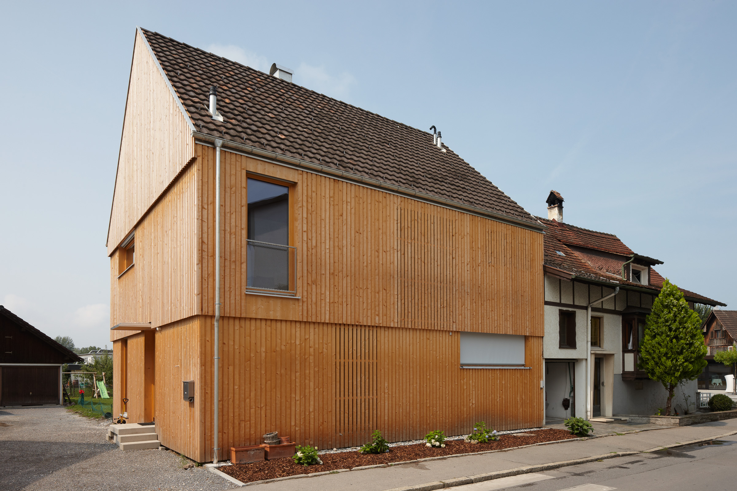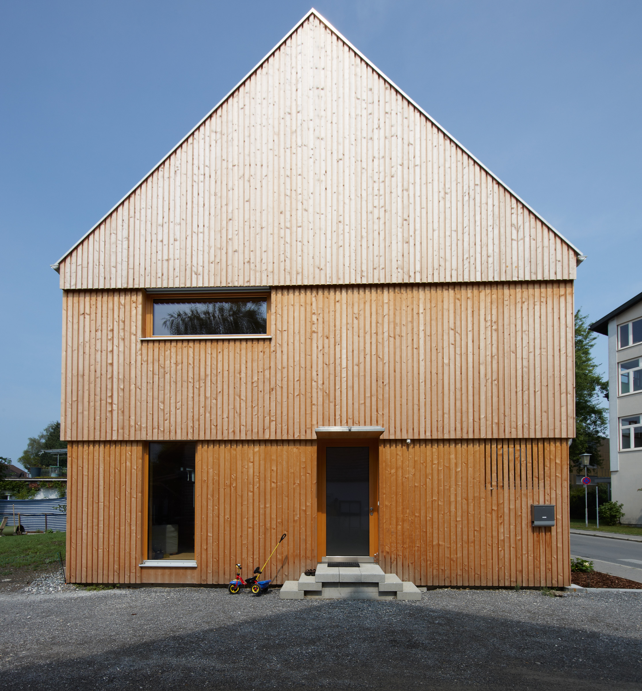 The house, for a family of musicians in the centre of Hard, Vorarlberg, is simple and pure in its formal language and yet full of warmth and sound. Its dimensions and orientation were set as it was built on the footprint of a demolished building to save on expensive foundations.