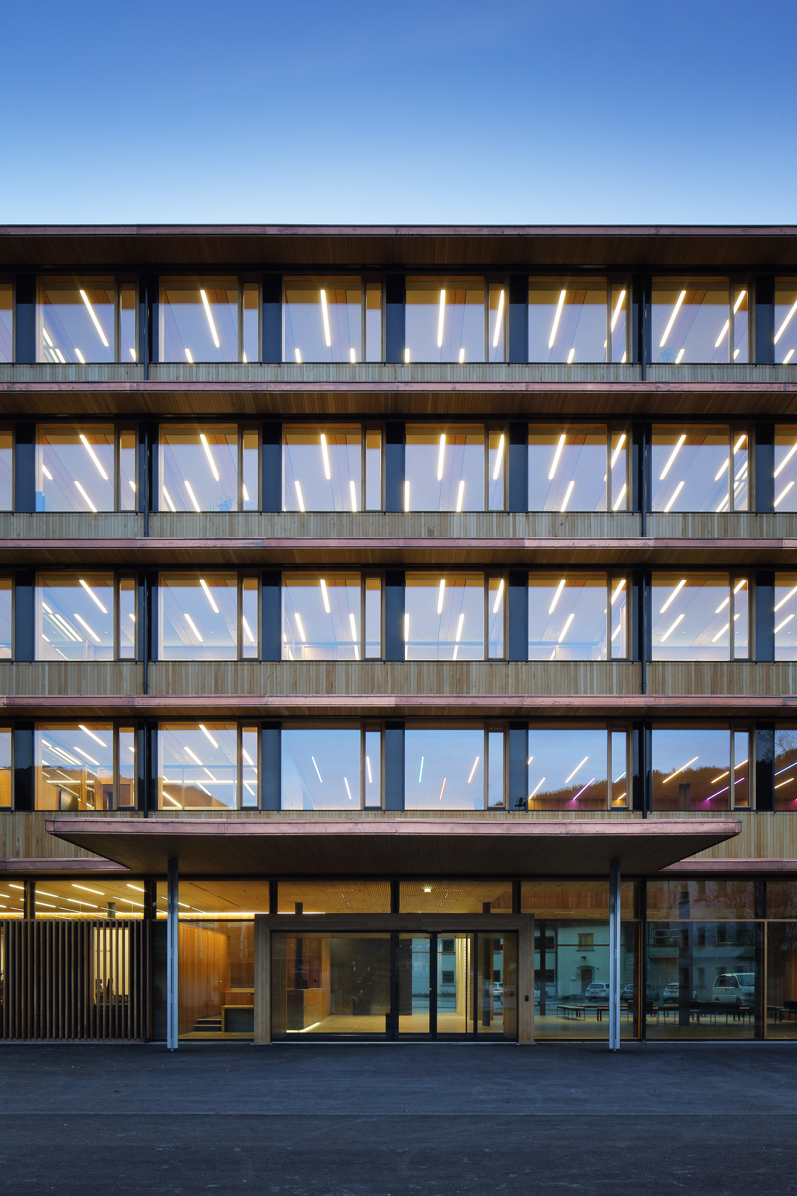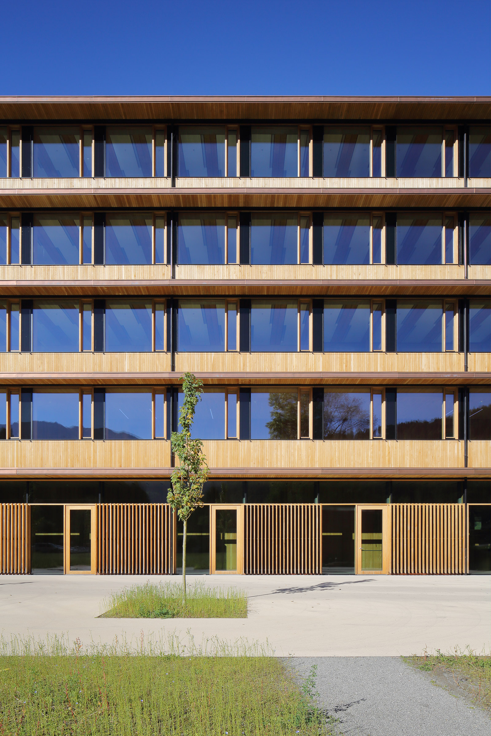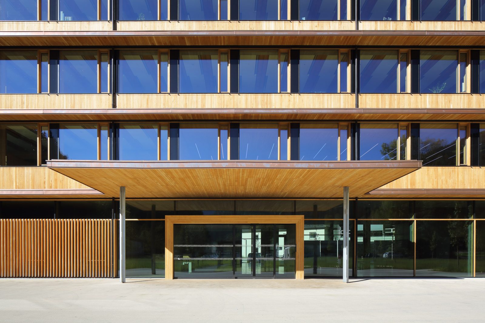 The simple shape and consistent skeleton construction, with very few reinforcement cores, is perfect for the future flexibility of the building. The timber façades are protected throughout by projecting roofs, which also allow ideal access for cleaning, thus reducing operating expenditure. It would be possible to extend the building by adding further stories. All the service installations remain accessible, and the envelope is perfectly energy-efficient, so that no thermodynamic improvements are expected to be necessary in the future.