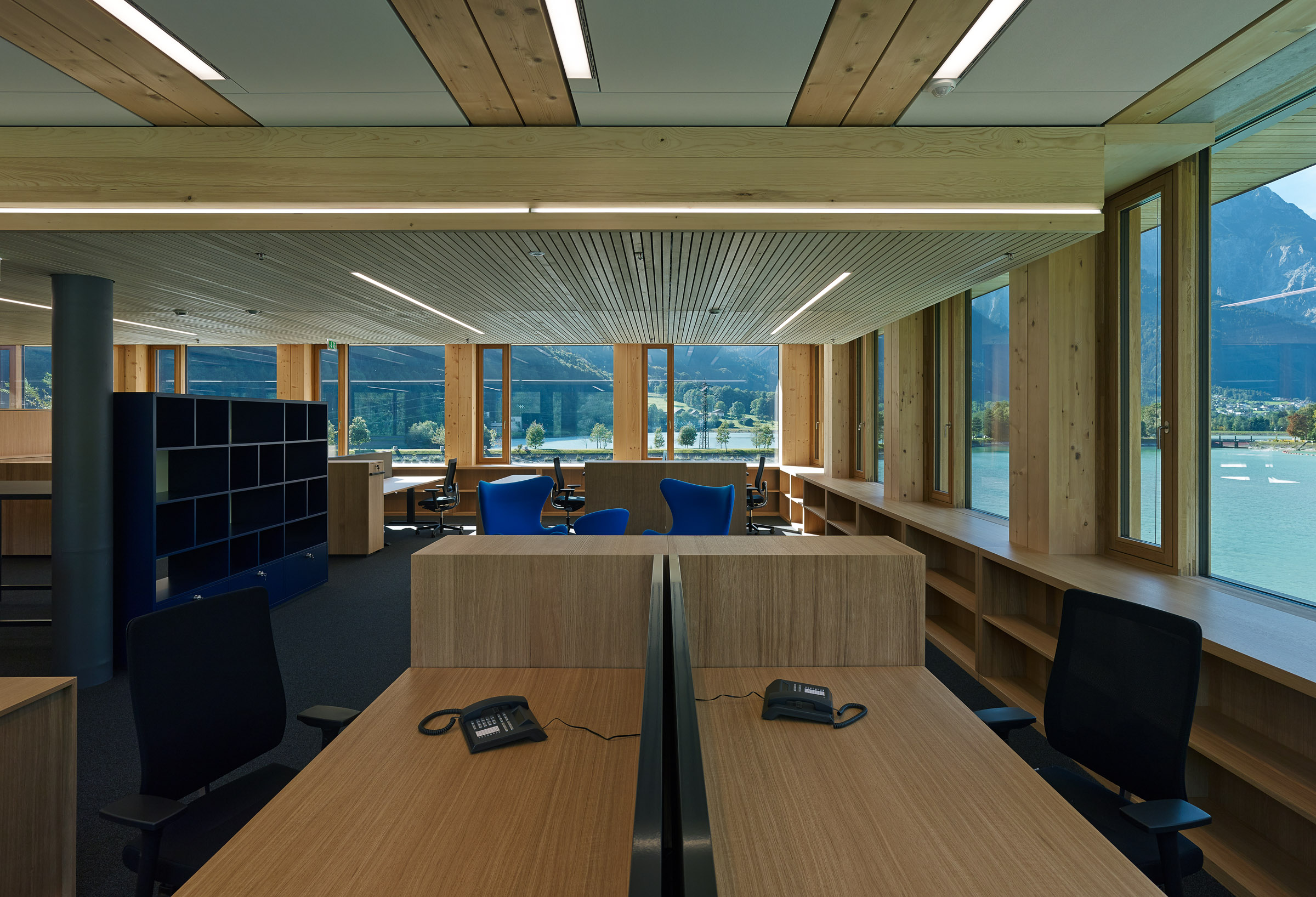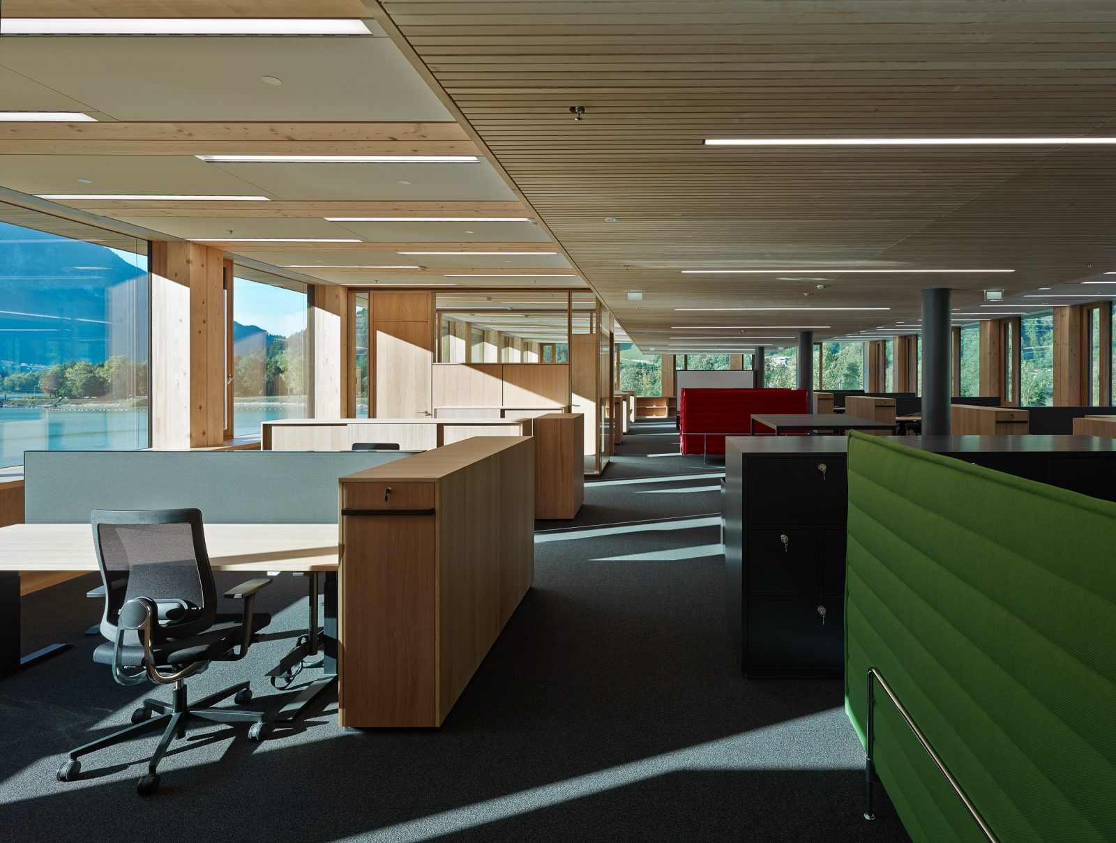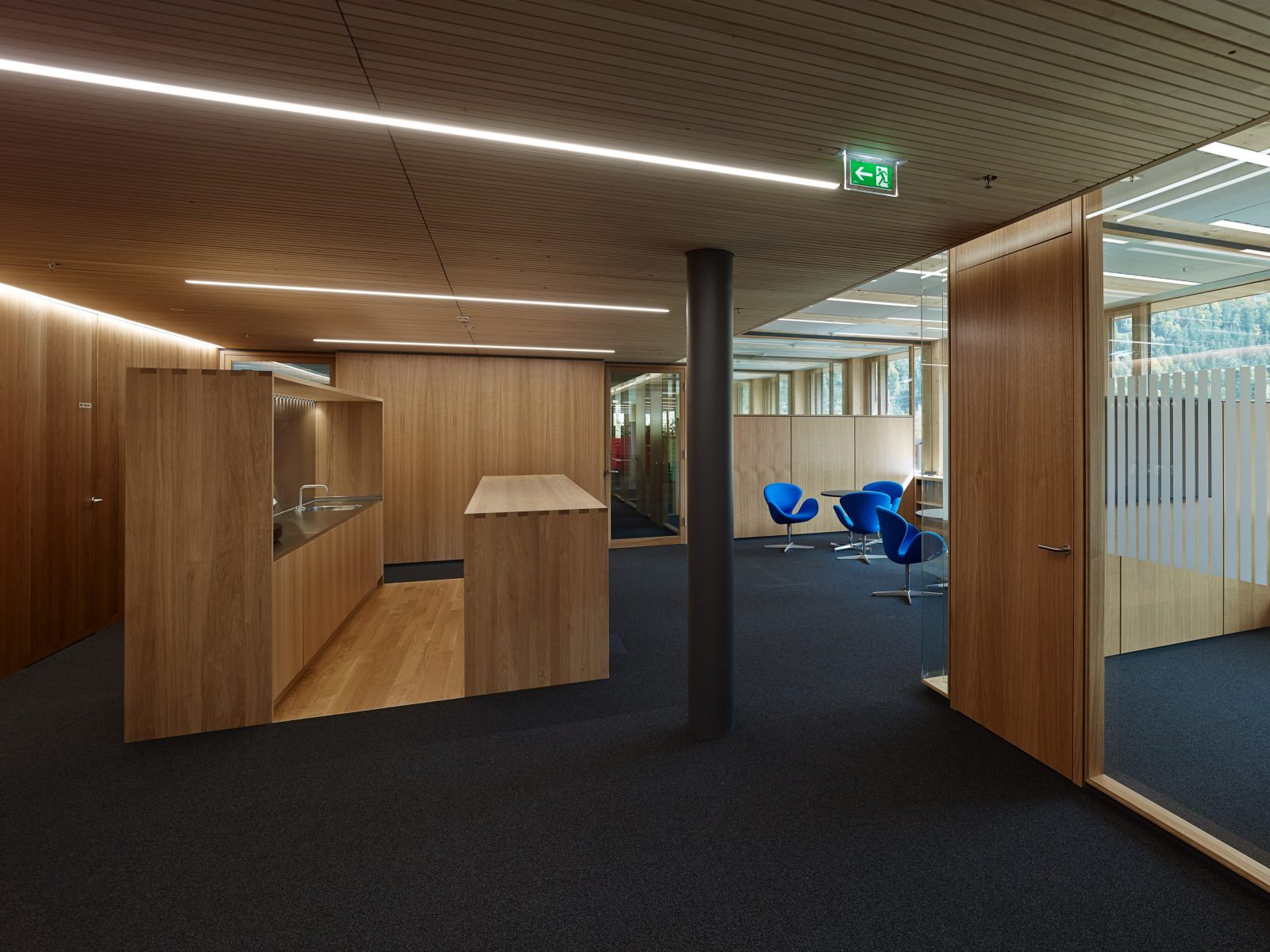 The simple shape and consistent skeleton construction, with very few reinforcement cores, is perfect for the future flexibility of the building. The timber façades are protected throughout by projecting roofs, which also allow ideal access for cleaning, thus reducing operating expenditure. It would be possible to extend the building by adding further stories. All the service installations remain accessible, and the envelope is perfectly energy-efficient, so that no thermodynamic improvements are expected to be necessary in the future.