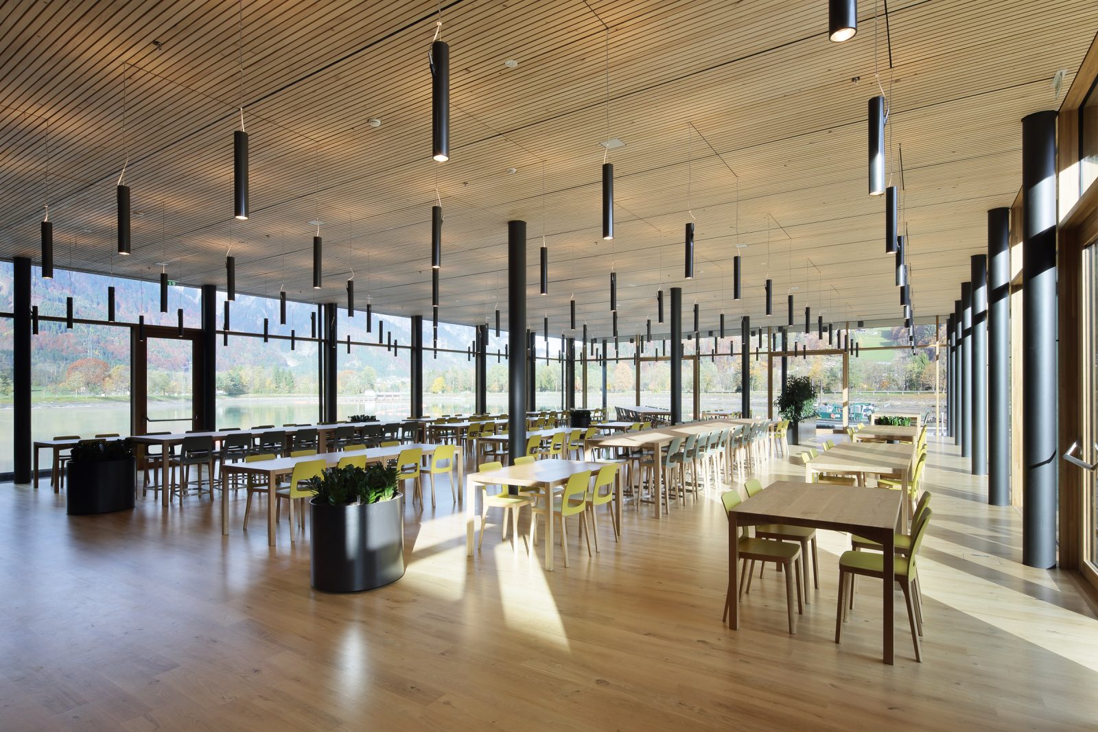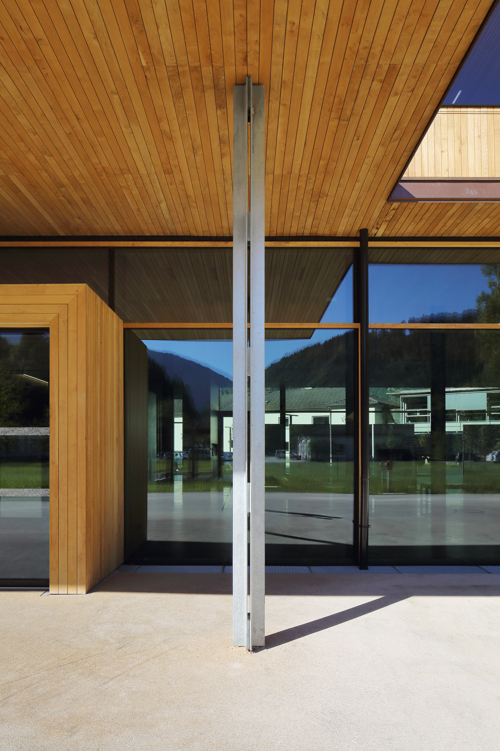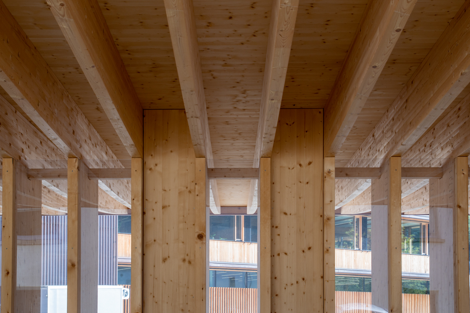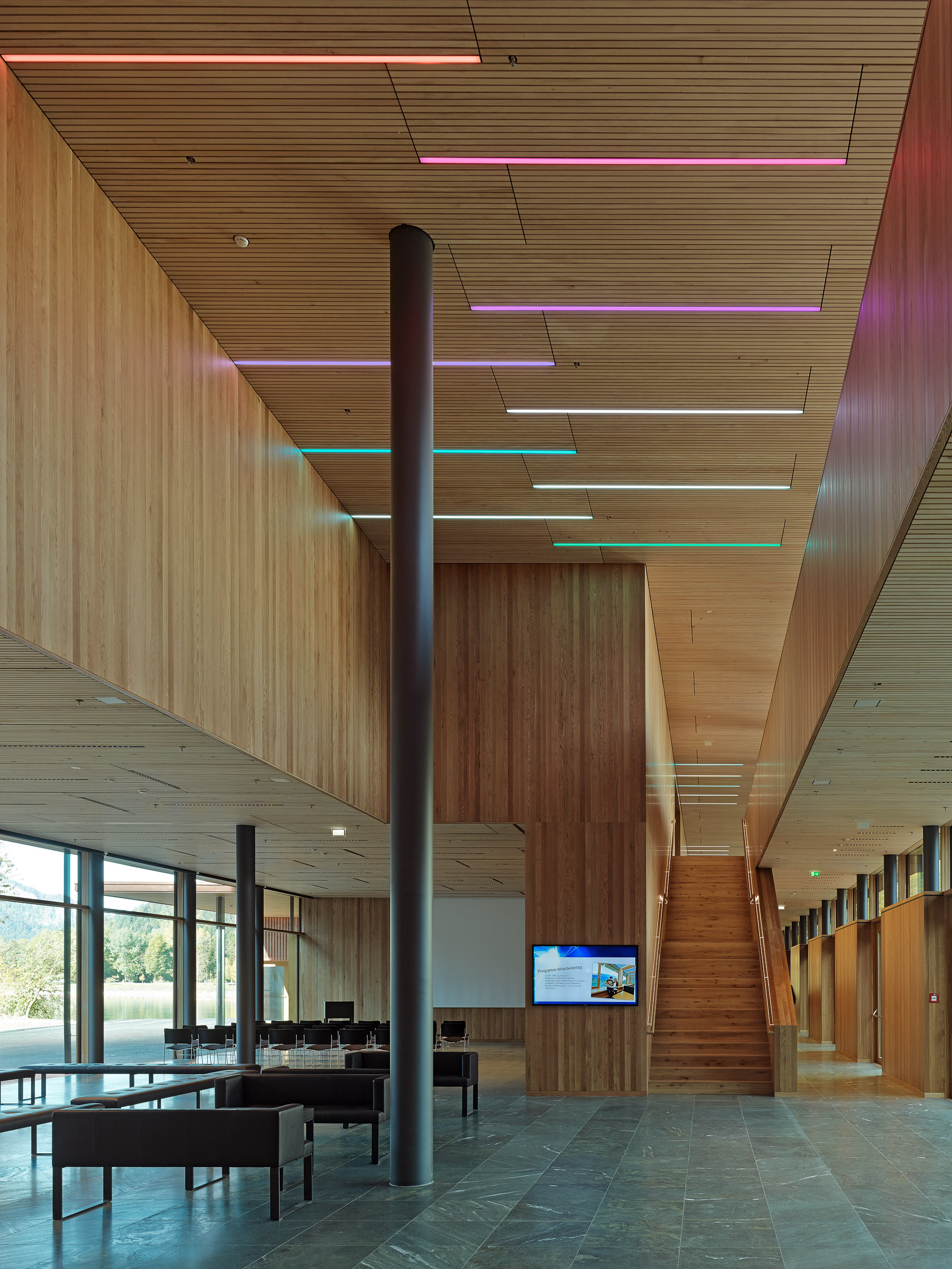The new 120 m long IZM building redefines its location with its powerful physical presence. The IZM explores the boundaries between nature and artificiality. The new site is characterised by the vertical walls of an alpine valley that is peppered with man-made features, including an artificial hydropower lake and large pre-existing factories. To define the surroundings, and to bring a sense of dramatic awe to the landscape, it was decided to create a powerful and confident new building to sit proudly on the valley floor. The long and elegant timber construction projects from the foot of the mountains onto the lake, creating an engaging spatial experience and a sense of purposefulness to the valley as a whole.