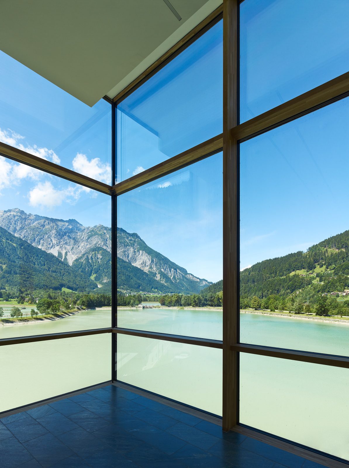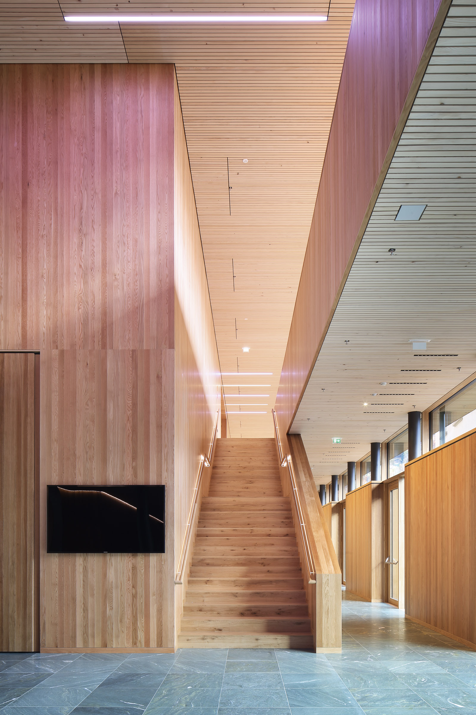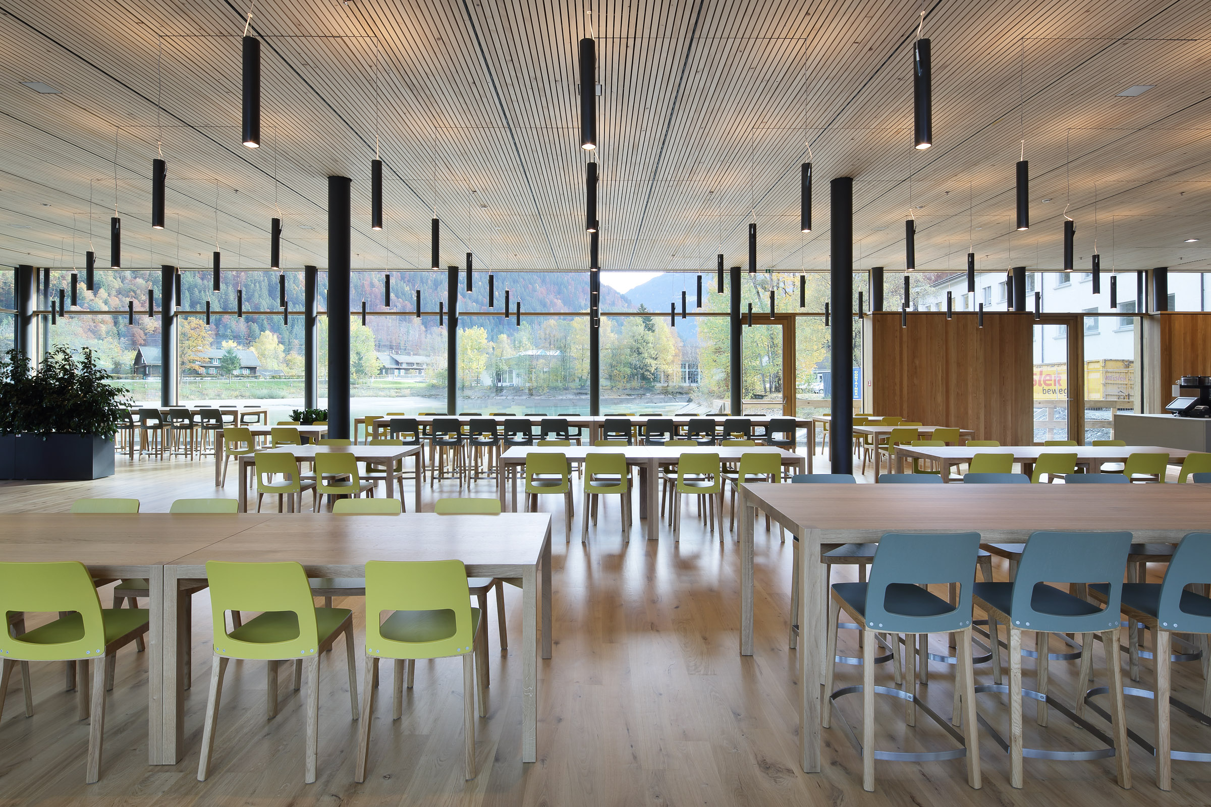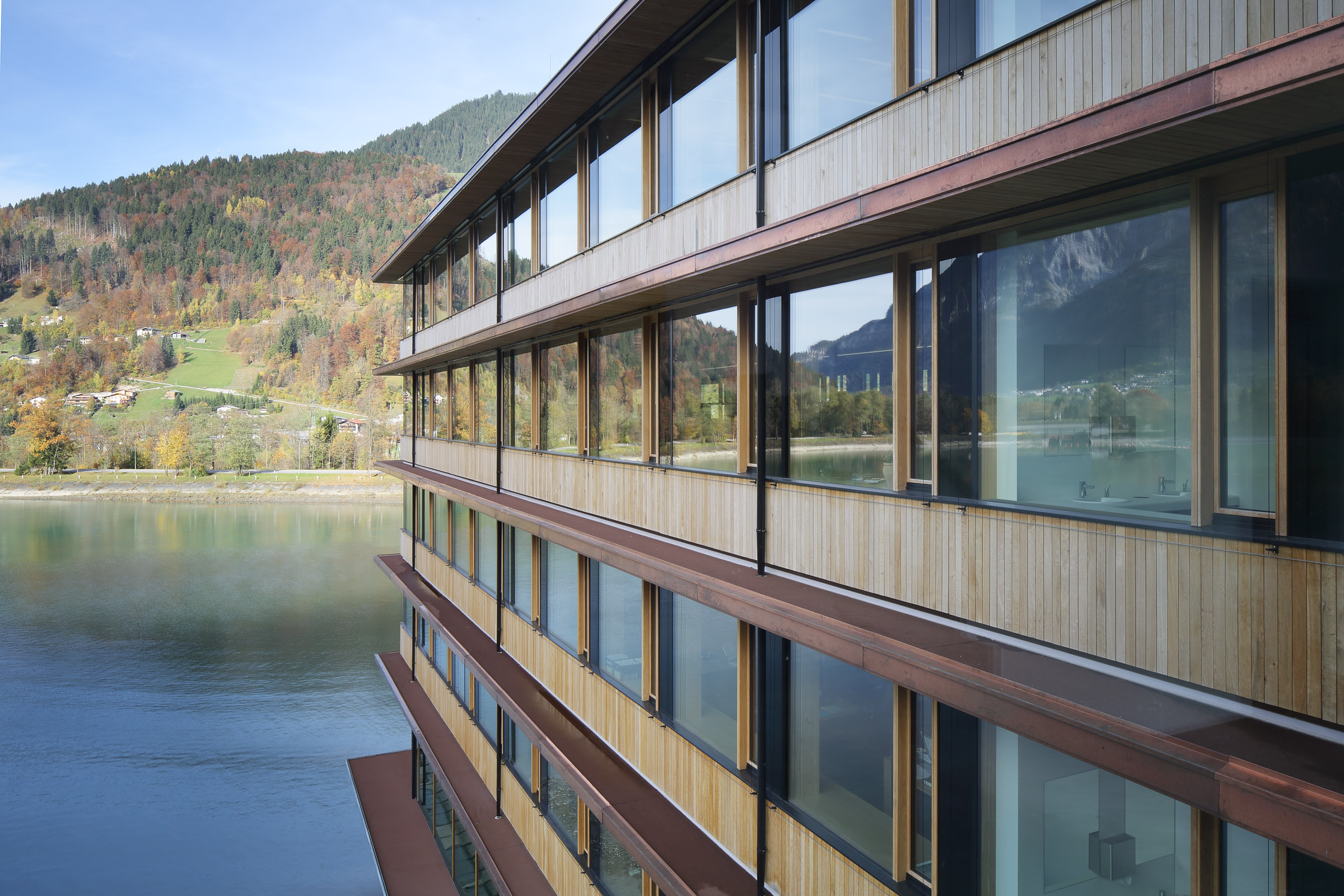 The new 120 m long IZM building redefines its location with its powerful physical presence. The IZM explores the boundaries between nature and artificiality. The new site is characterised by the vertical walls of an alpine valley that is peppered with man-made features, including an artificial hydropower lake and large pre-existing factories. To define the surroundings, and to bring a sense of dramatic awe to the landscape, it was decided to create a powerful and confident new building to sit proudly on the valley floor. The long and elegant timber construction projects from the foot of the mountains onto the lake, creating an engaging spatial experience and a sense of purposefulness to the valley as a whole.
