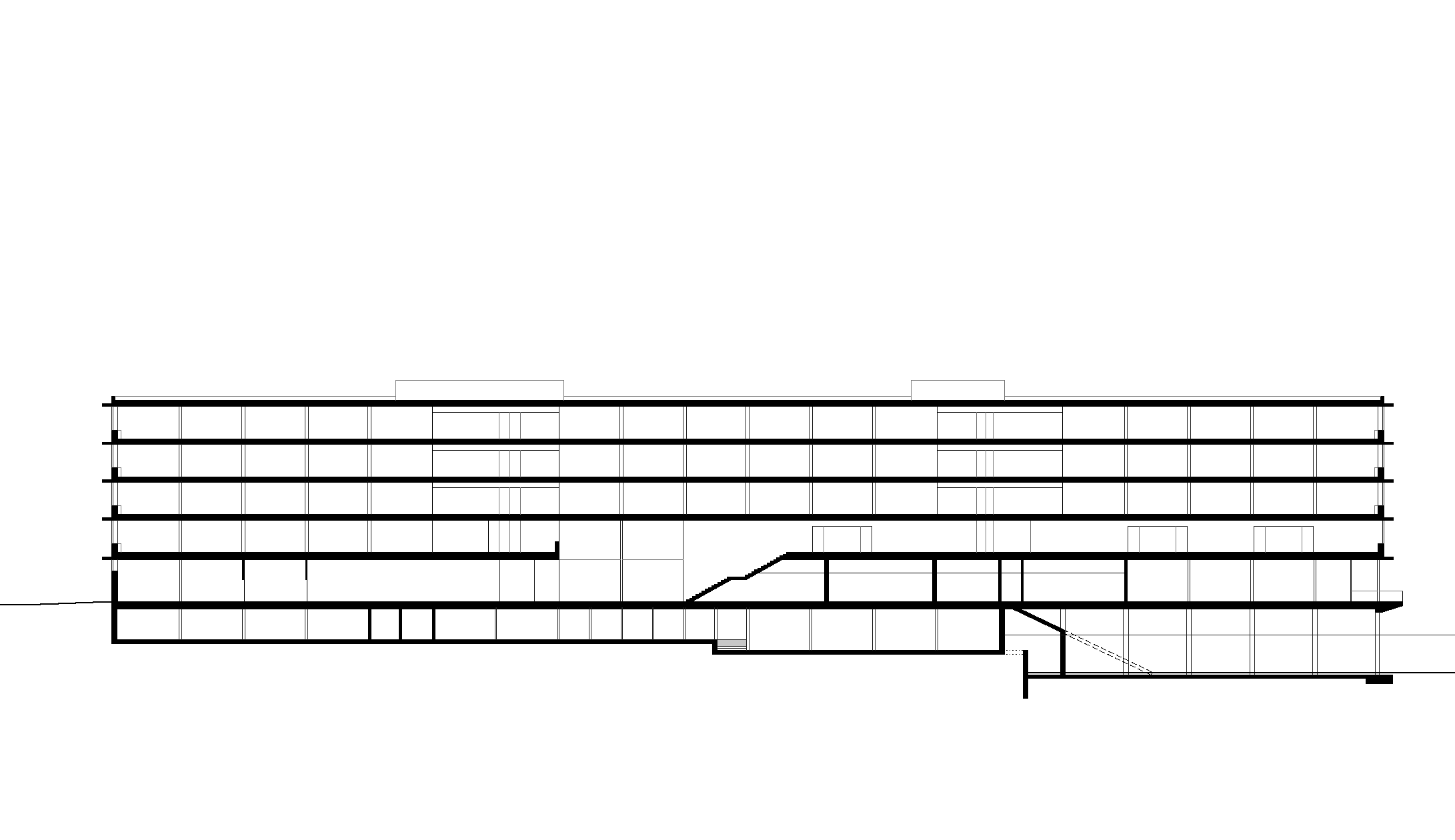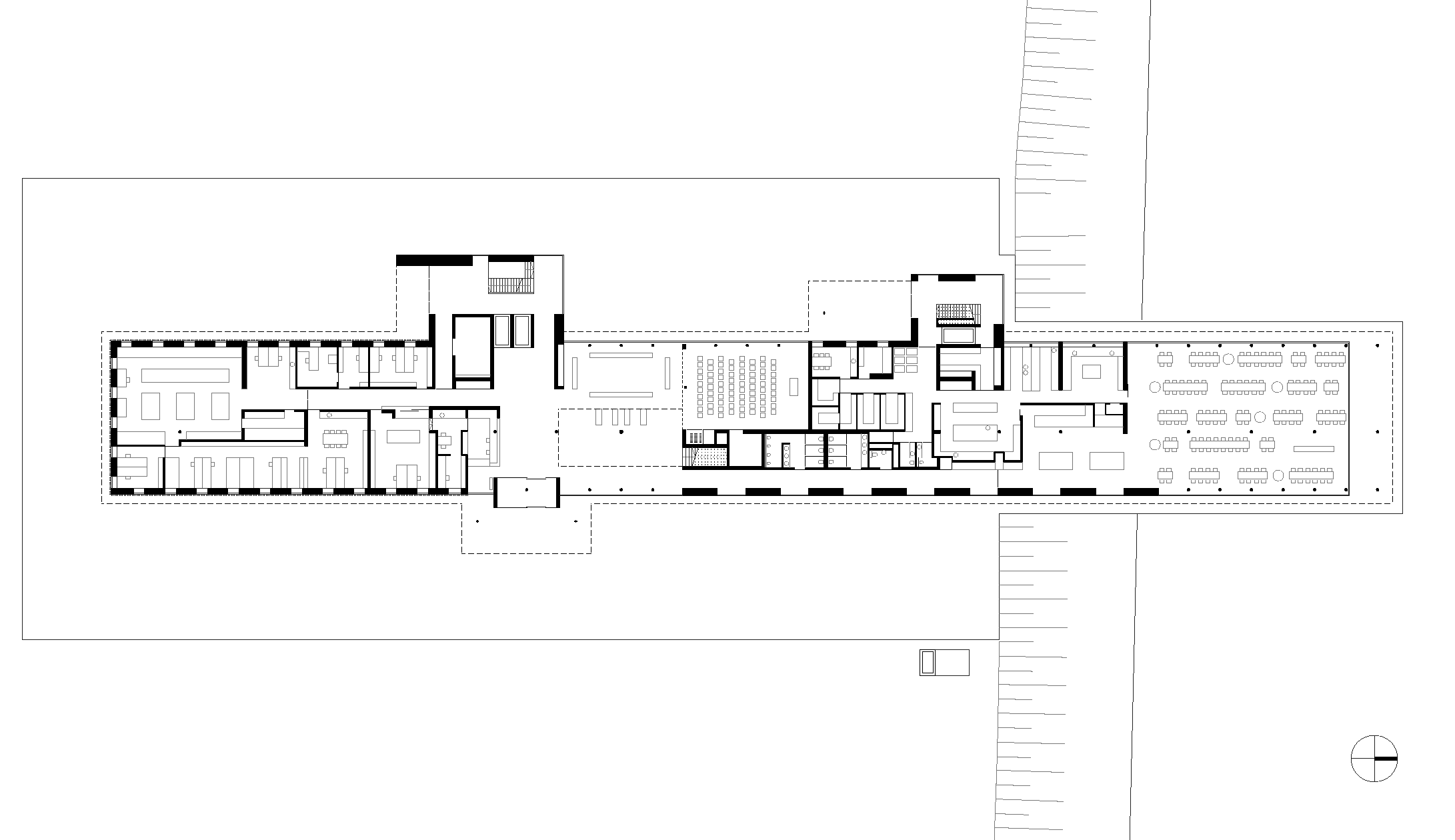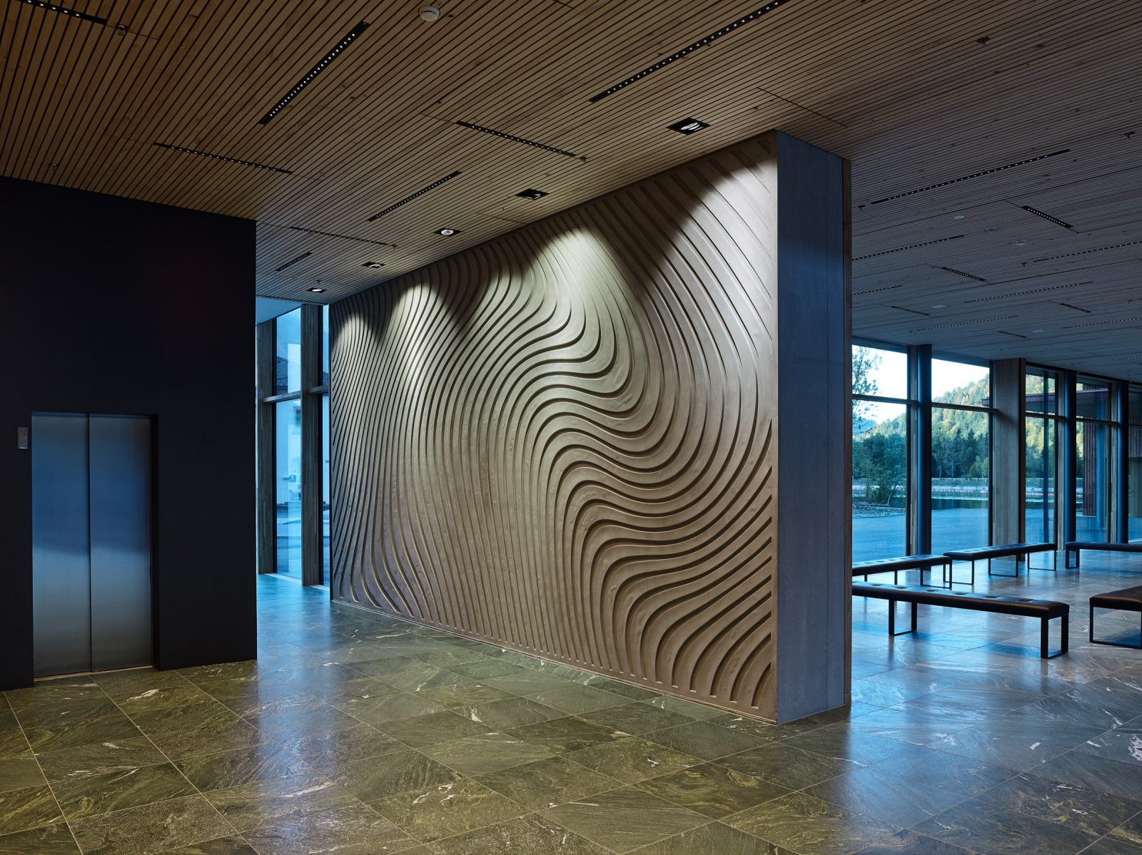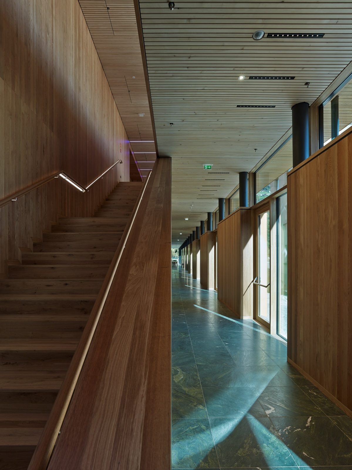 In this position, the building has a clear separation into two sides. To the east, the structure welcomes its guests; the generous canopy marks the entrance and a park creates enough space to present the building to its full extent. The façade is divided into layers of parapets, ribbon windows and canopies. The length becomes the leitmotif of the building, mimicking the valley within which it sits.