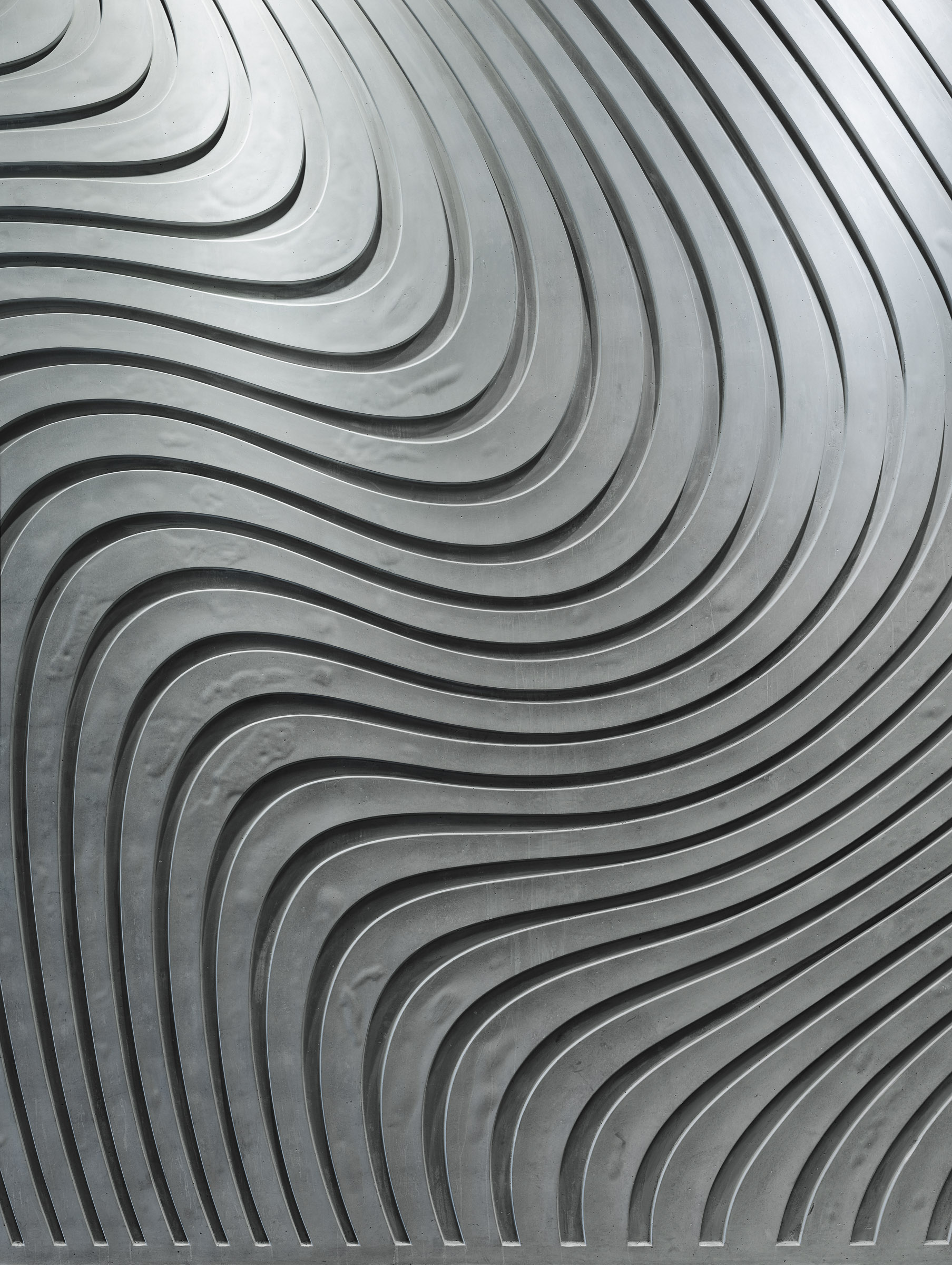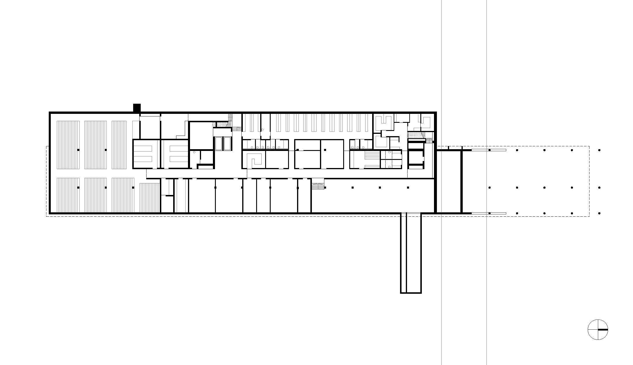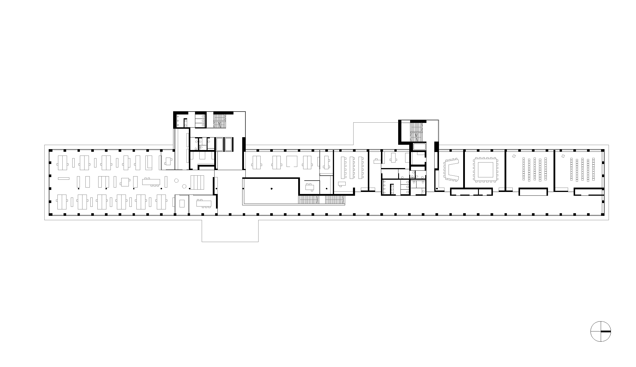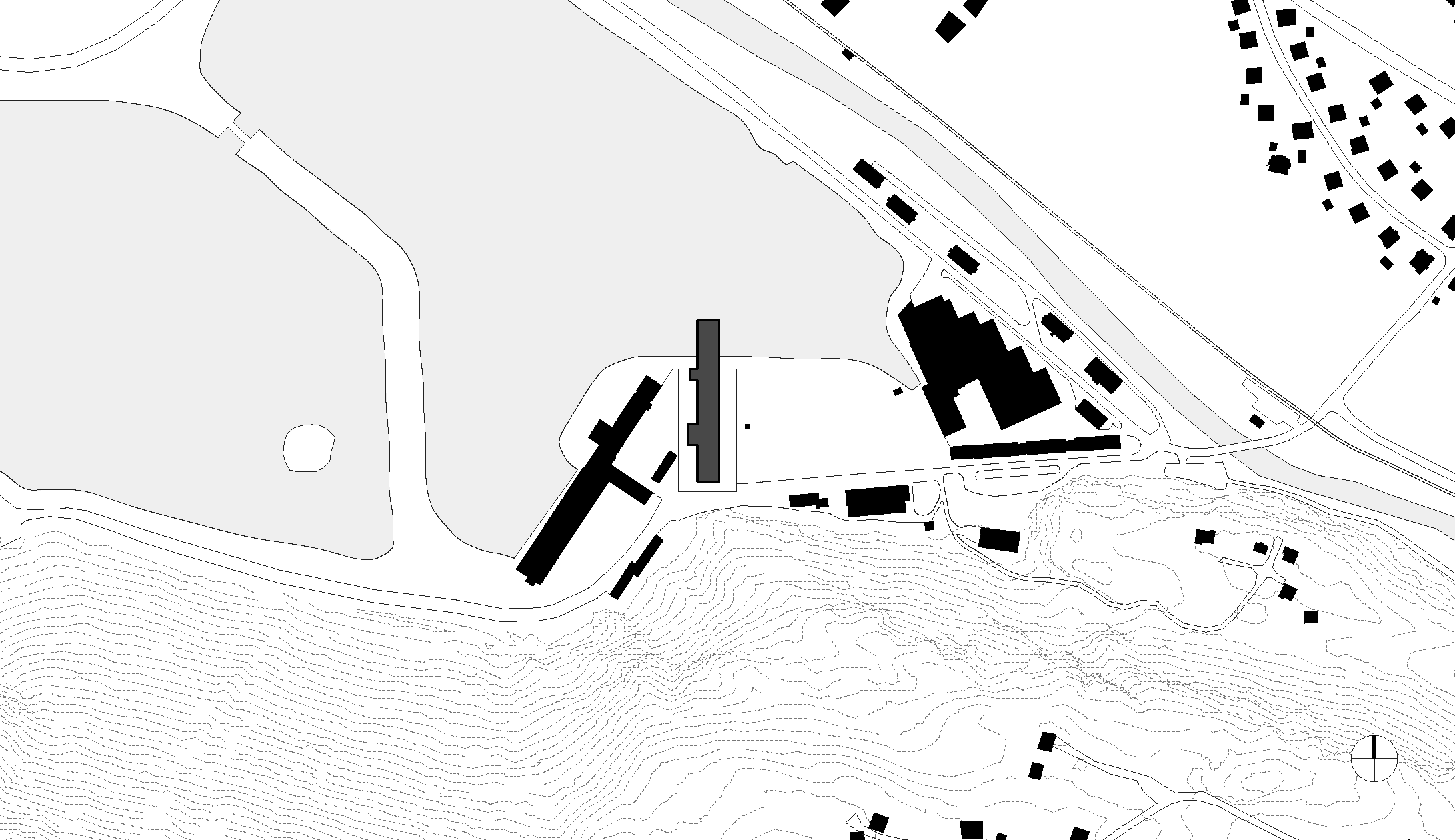 In this position, the building has a clear separation into two sides. To the east, the structure welcomes its guests; the generous canopy marks the entrance and a park creates enough space to present the building to its full extent. The façade is divided into layers of parapets, ribbon windows and canopies. The length becomes the leitmotif of the building, mimicking the valley within which it sits.