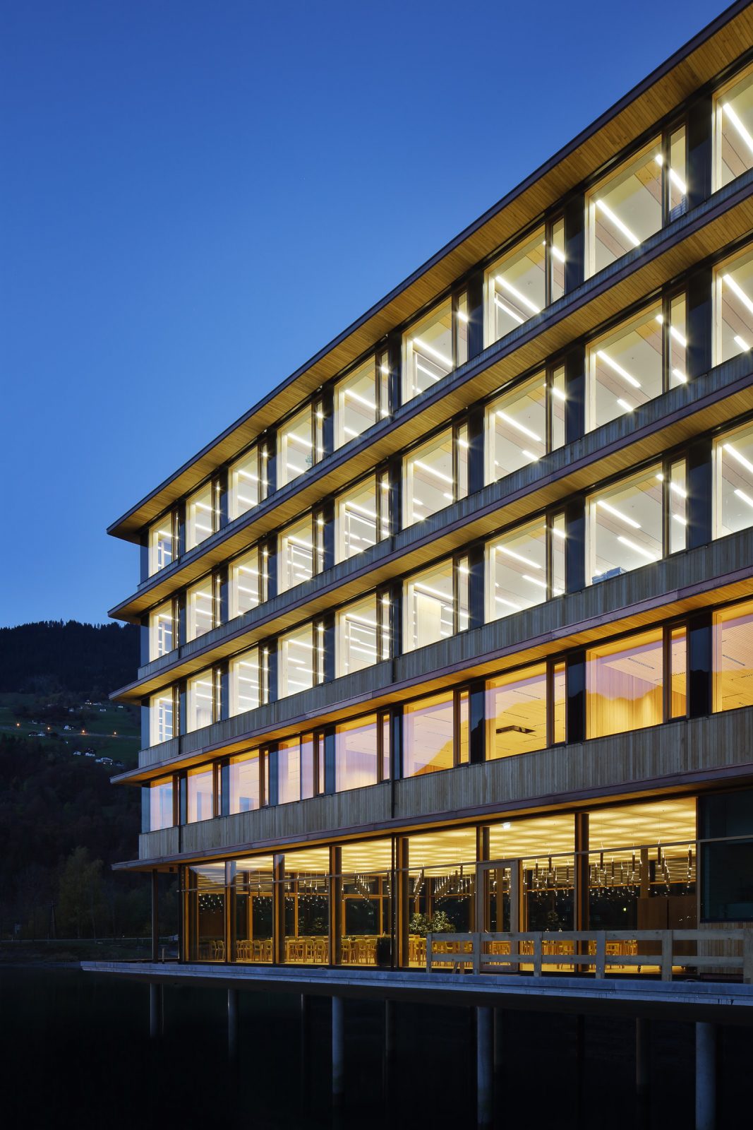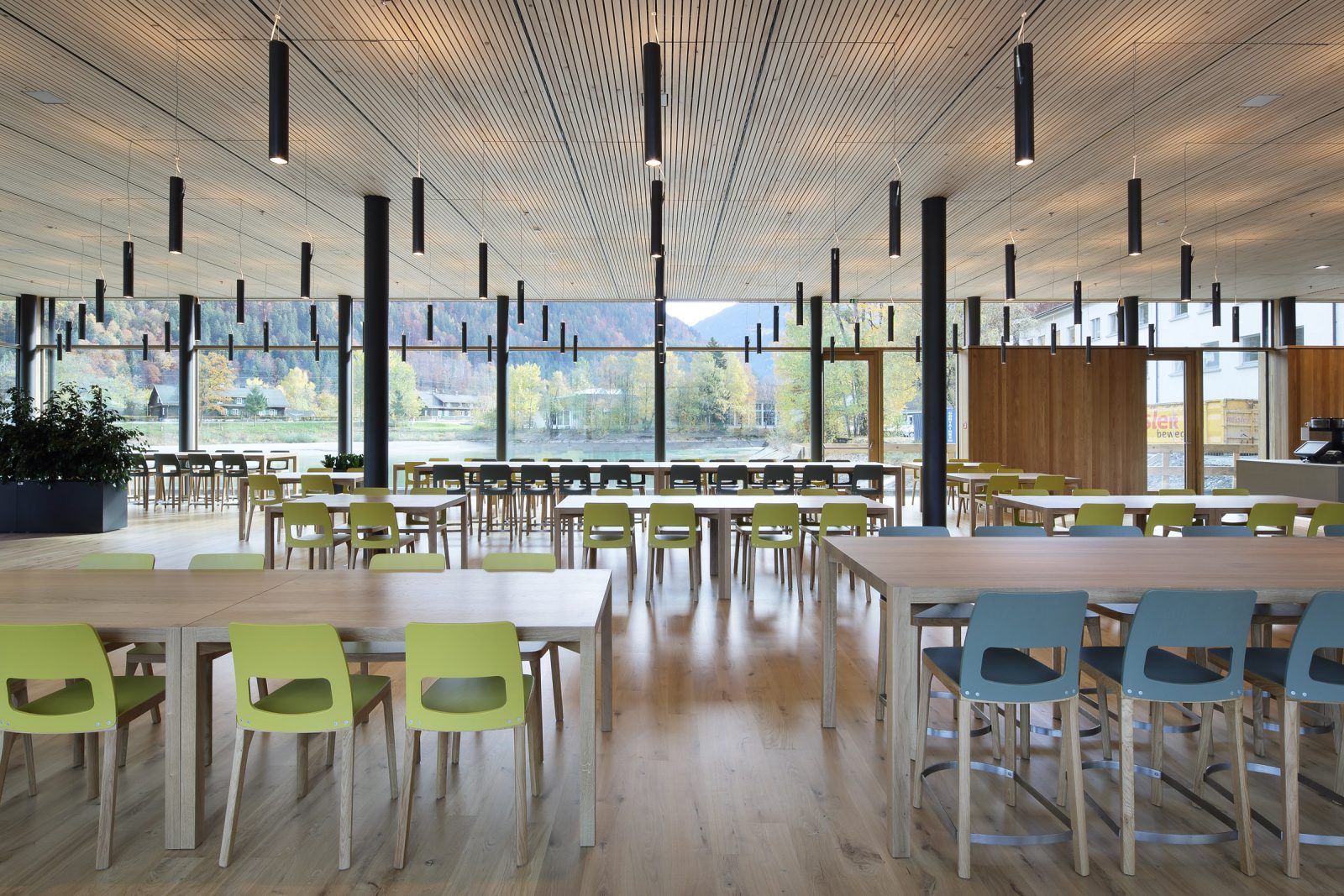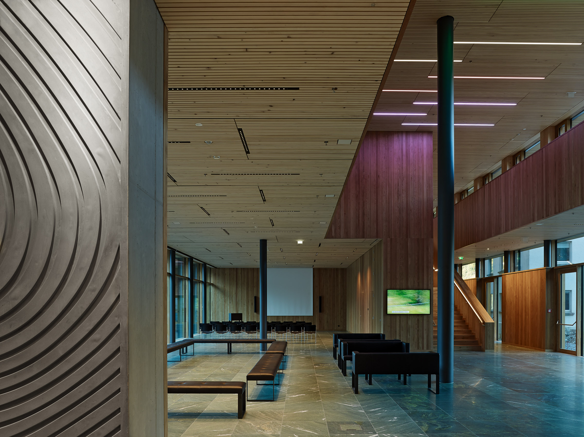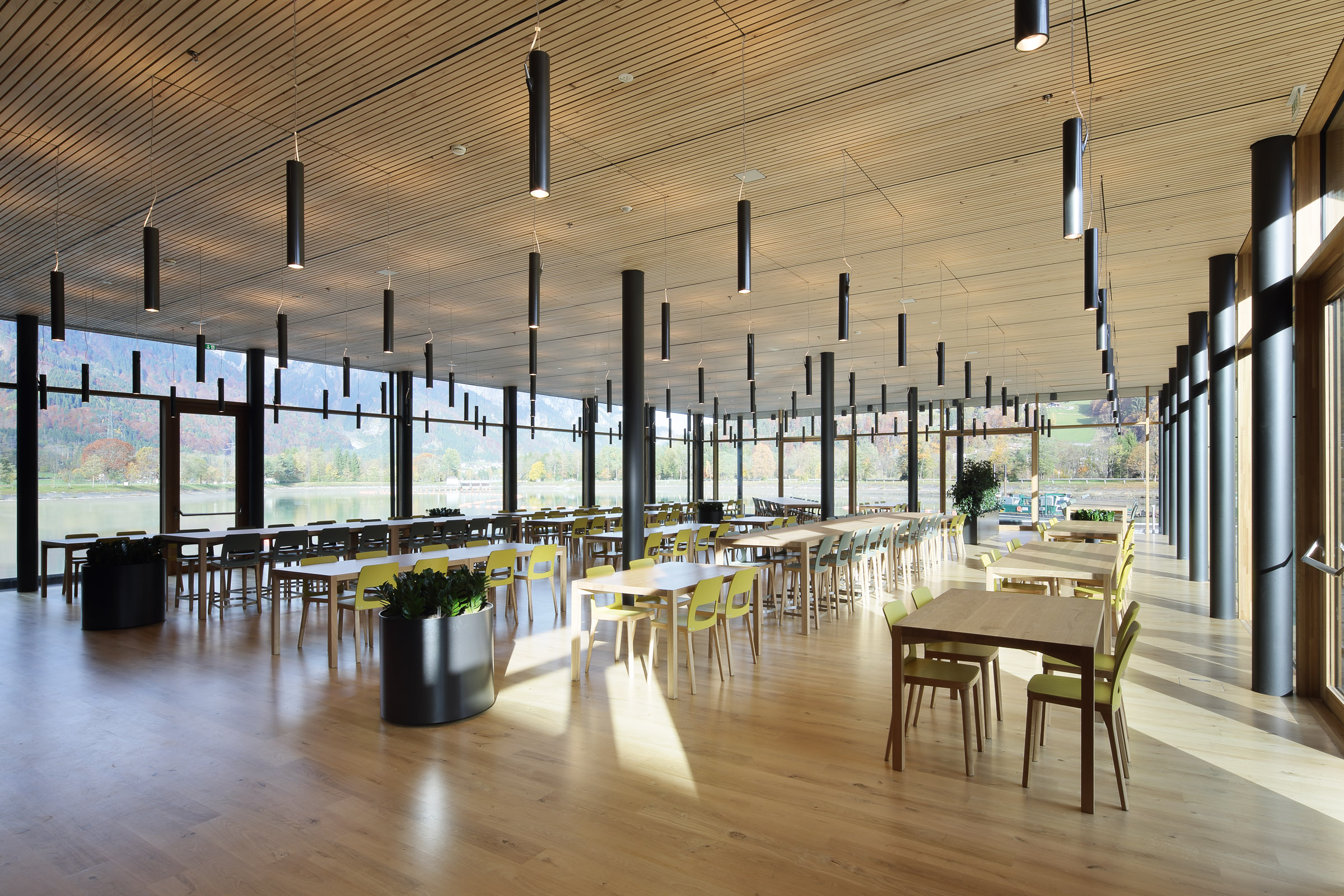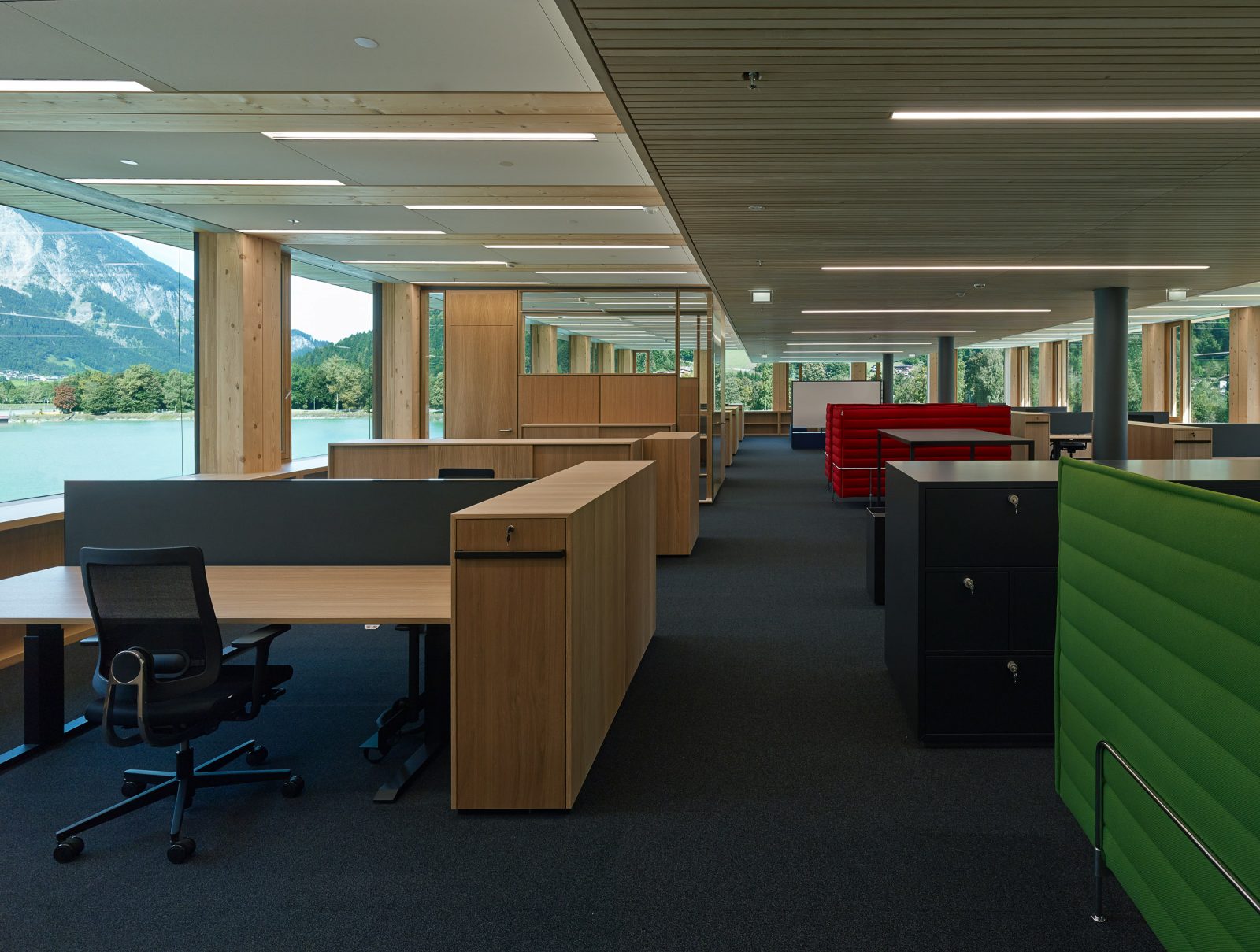 The new IZM continues to exceptional in the design and arrangement of the interior. Common areas such as the dining room, visitors’ centre and conference rooms occupy the area on the lake, thus becoming unusual and memorable places. The office concept was developed in workshops and interviews with the employees, and the end result is a space that is designed to give everyone an enjoyable, functional and inspirational working environment. The office space, for 270 people, includes break-out spaces, think-tanks, meeting areas, reading centres and on each floor, a kitchenette.
