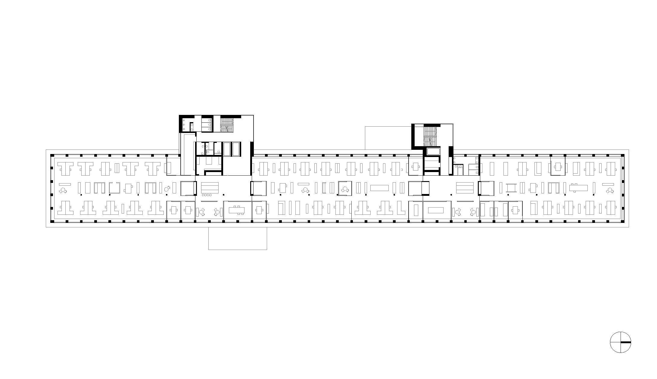 The shape of the IZM is defined by two specifications: the static structure of the building system with the prefabricated ribbed ceilings, and the goal to create enjoyable and functional conditions for all 270 workplaces. The depth of the construction was limited and as a result, the length of the building grew to 120 meters in length. The shape was also defined by the design, because the prefabricated panels deliver their optimum advantages when in a cubic formation. The clear-cut wooden structure could only be accommodated on the perimeter of the lake, extending over the edge of the basin and onto the water’s surface.