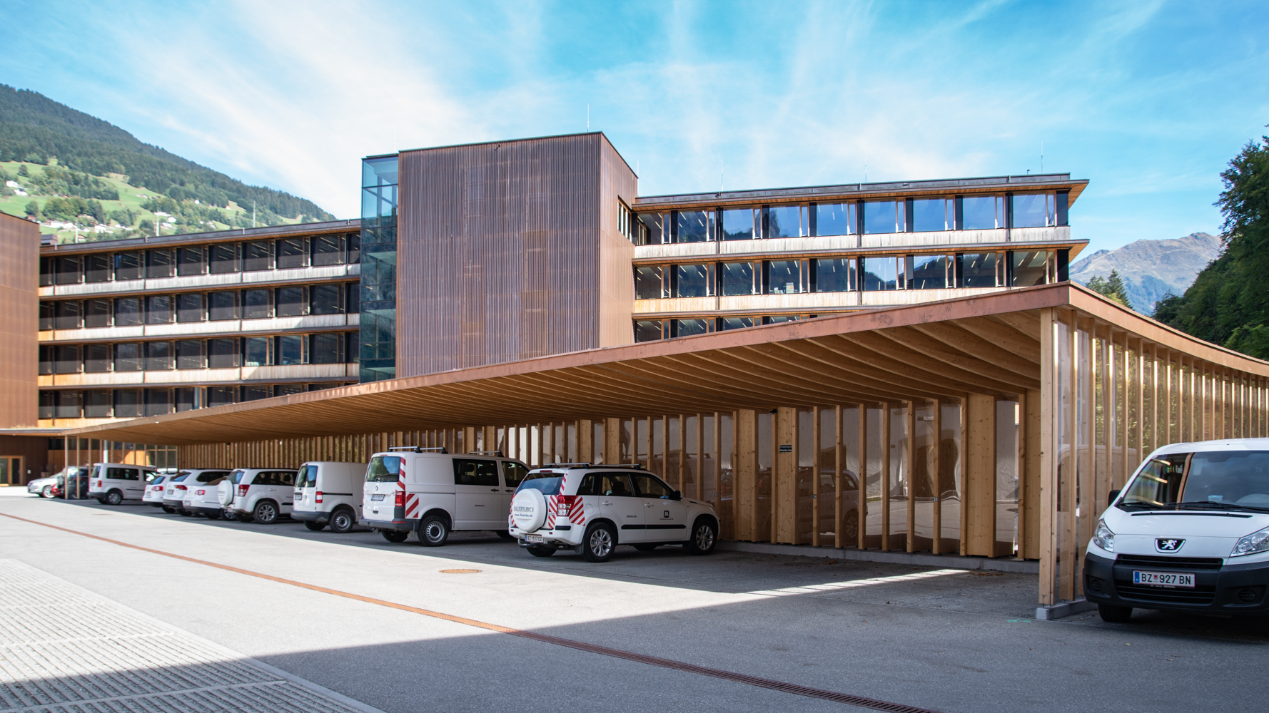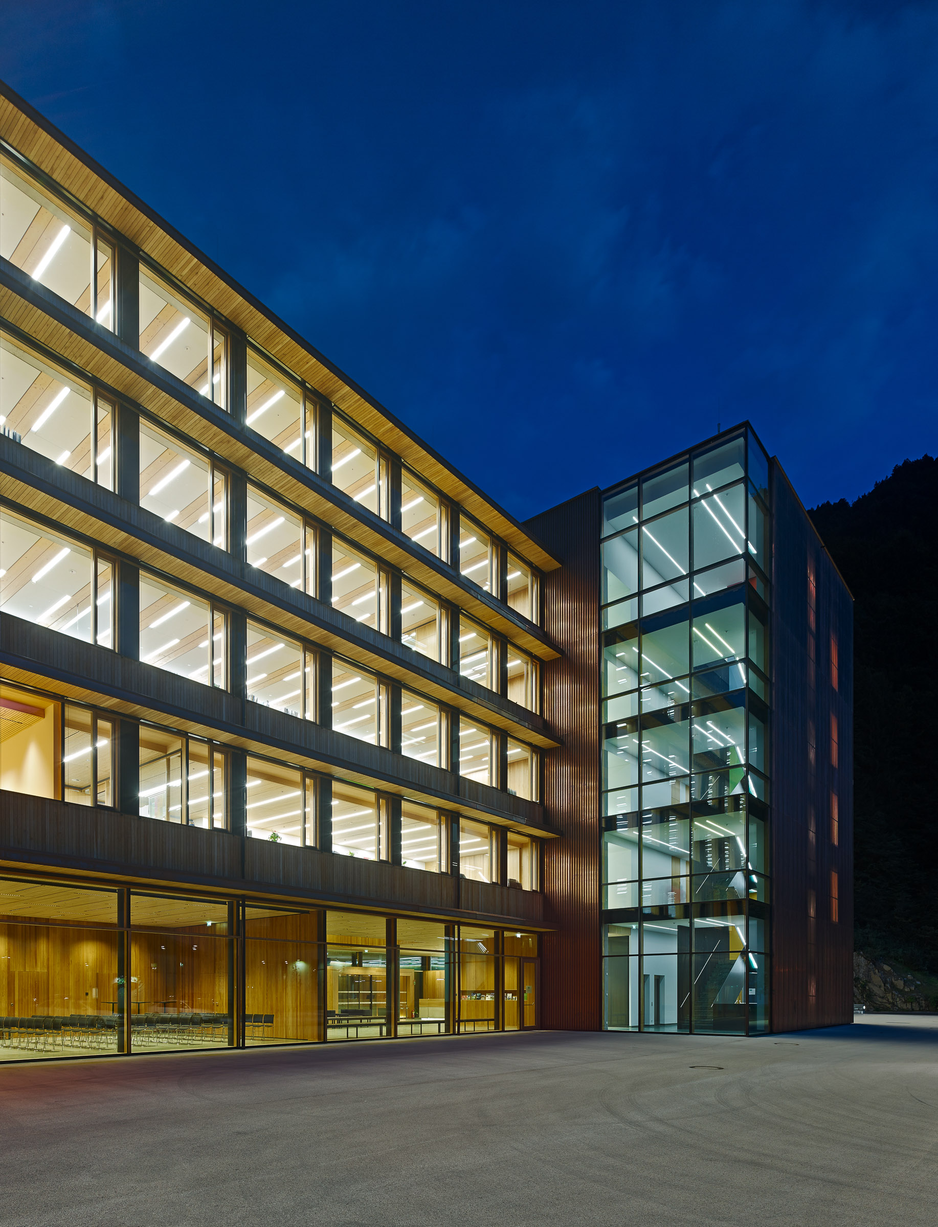 The Illwerke Zentrum Montafon (IZM) in Rodund is the new administration building of the Vorarlberg power company, and an outstanding timber construction. When it was completed, with over 10,000 m² of usable space, it was the largest wooden office building in Europe. The wooden structure, above the concrete base, was put together in just 6 weeks and is the first application of the LCT (Lifecycle Tower) on the open market.