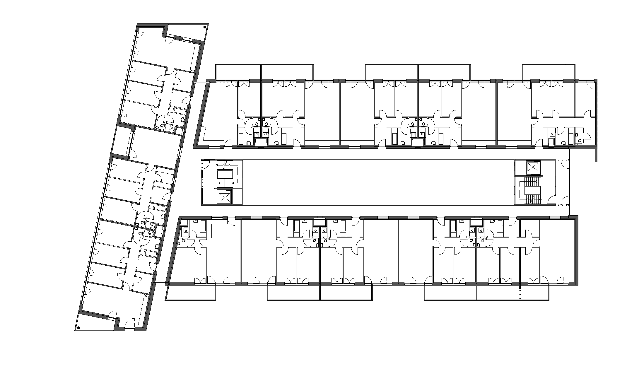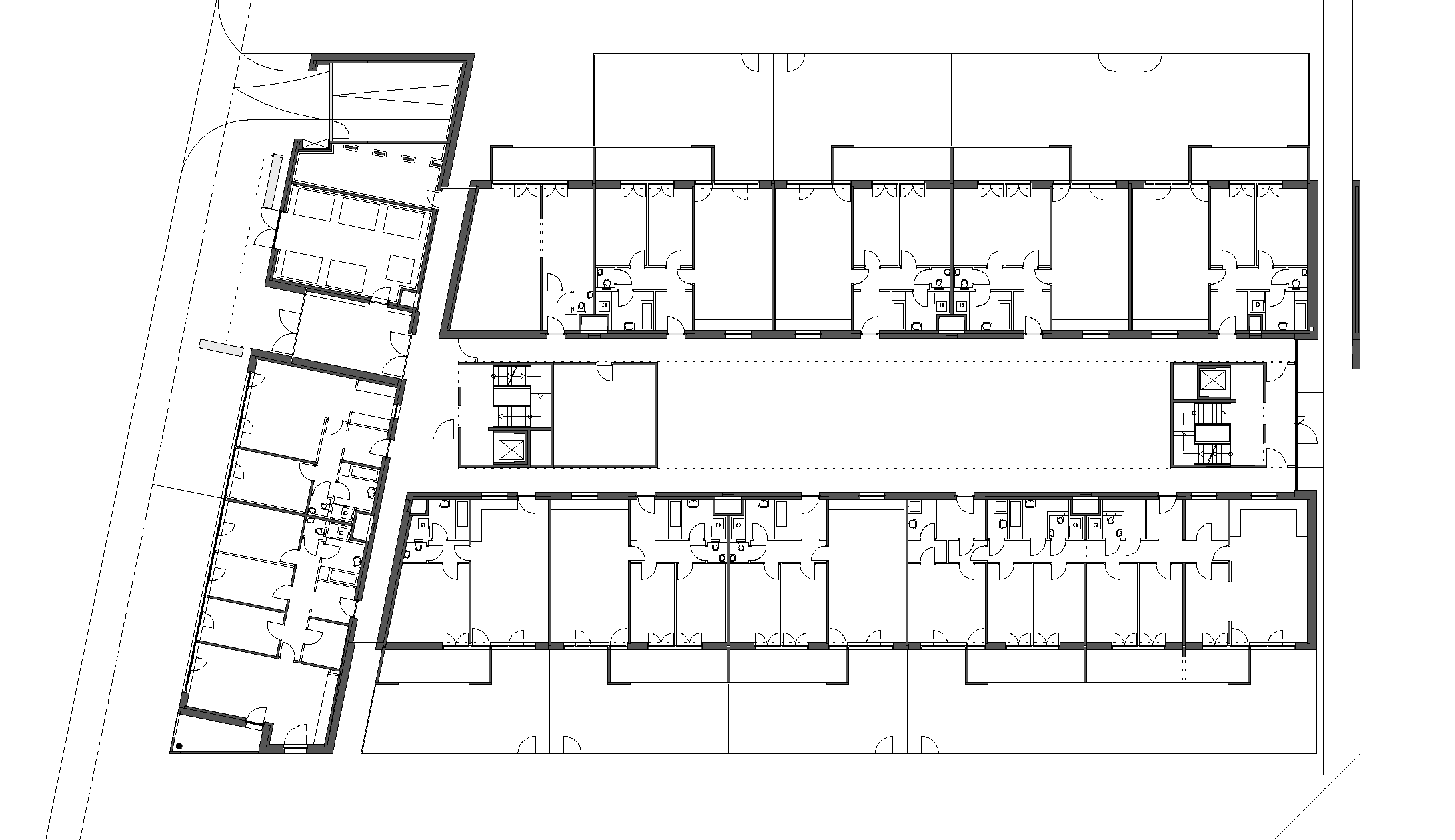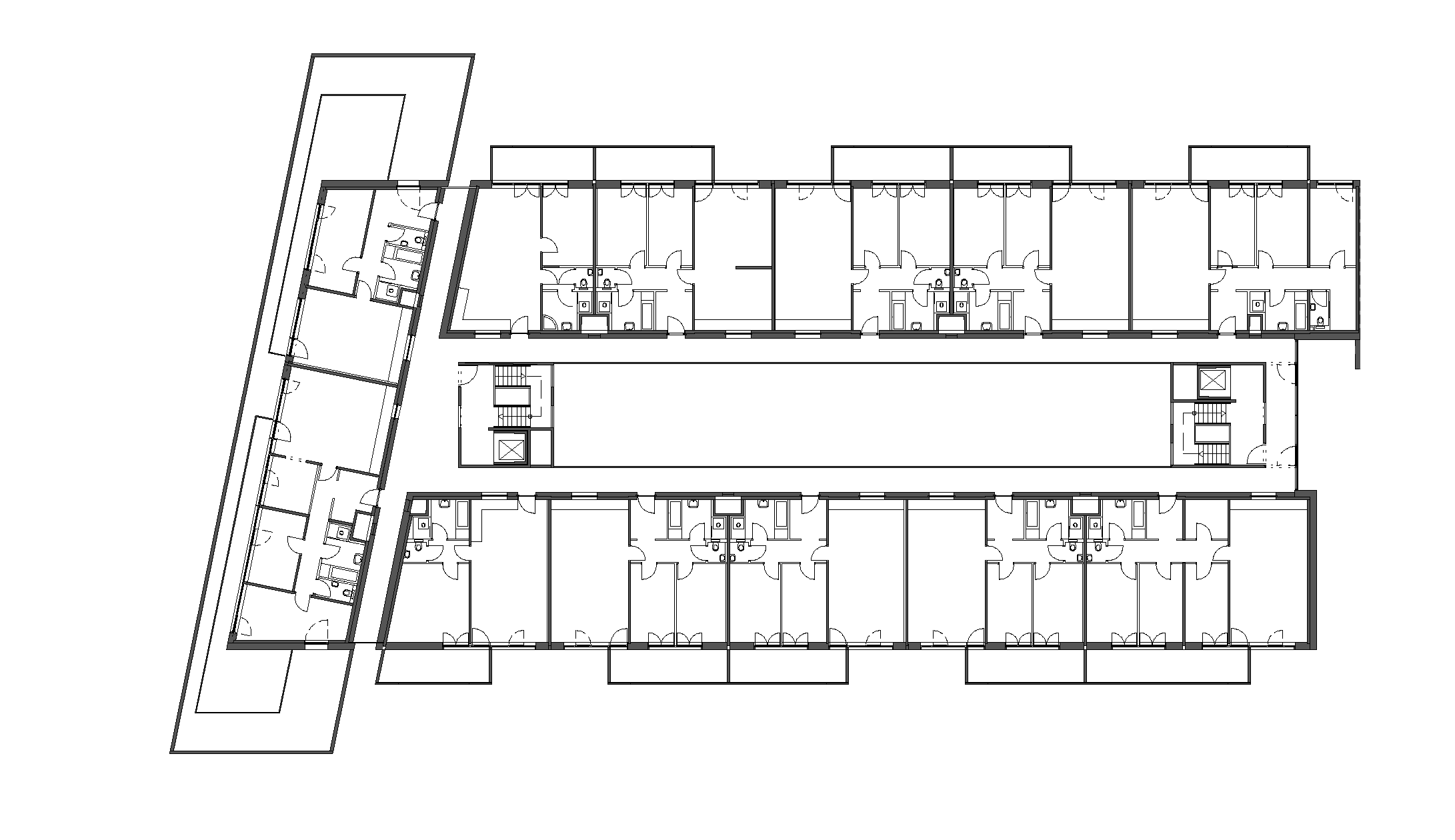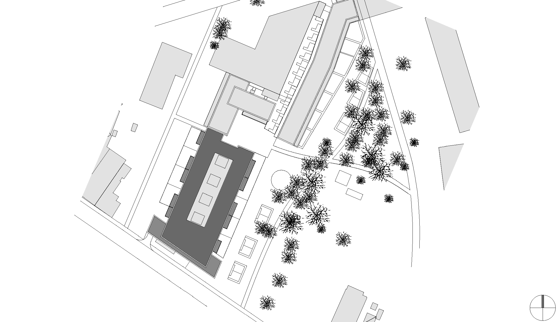 A compact, central development with a “twisted” south line that responds to the specific the site on Kammelweg. This type of building, with its attractive central hall and communal areas on all levels, allows an extremely rational and cost-effective development. While the ground-floor apartments have each assigned a garden portion, the upper floor apartments are furnished with greened loggias or balconies. The penthouses have roof terraces. This type of central development enables an extremely compact design with an optimised ratio between the building envelope and living areas.
