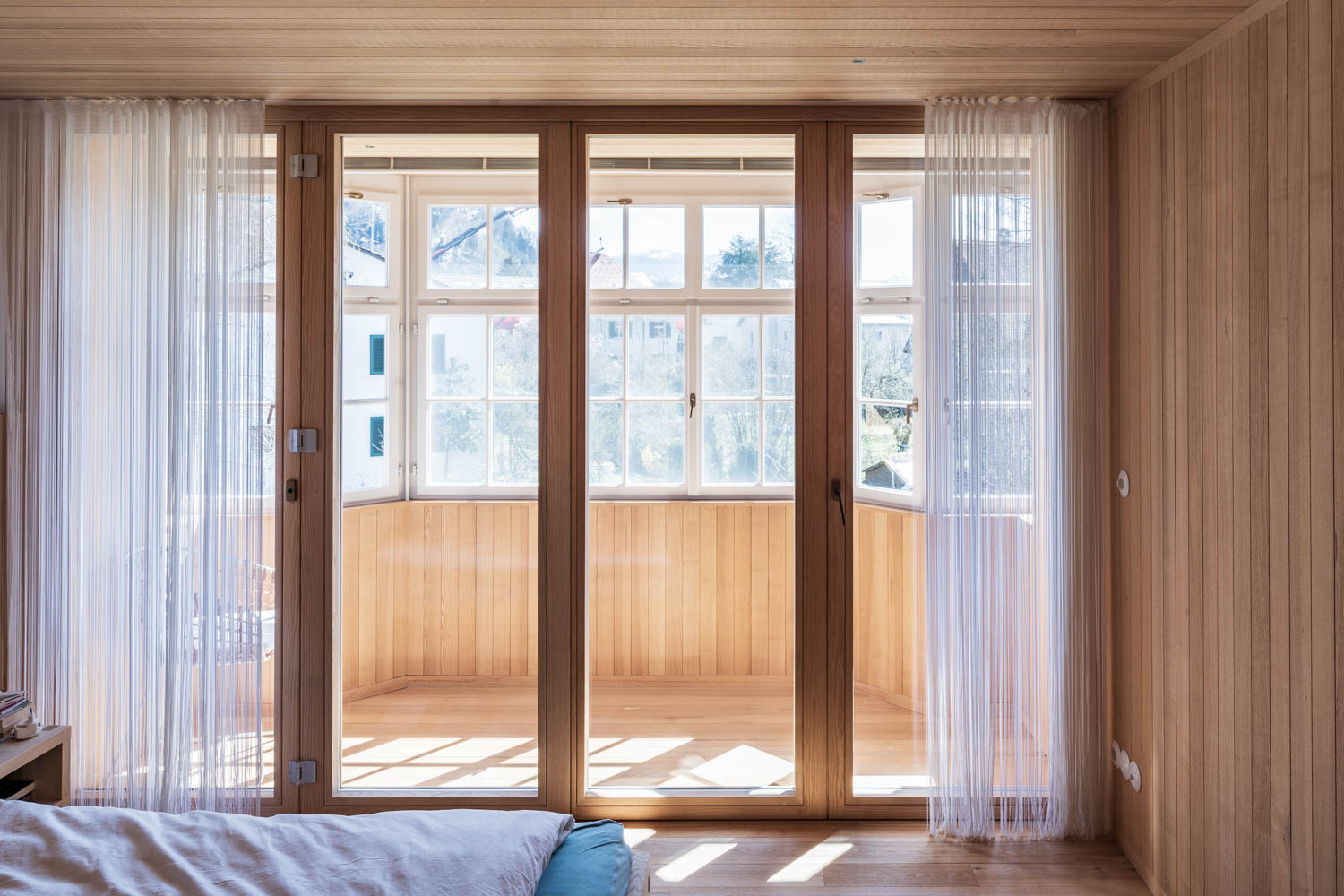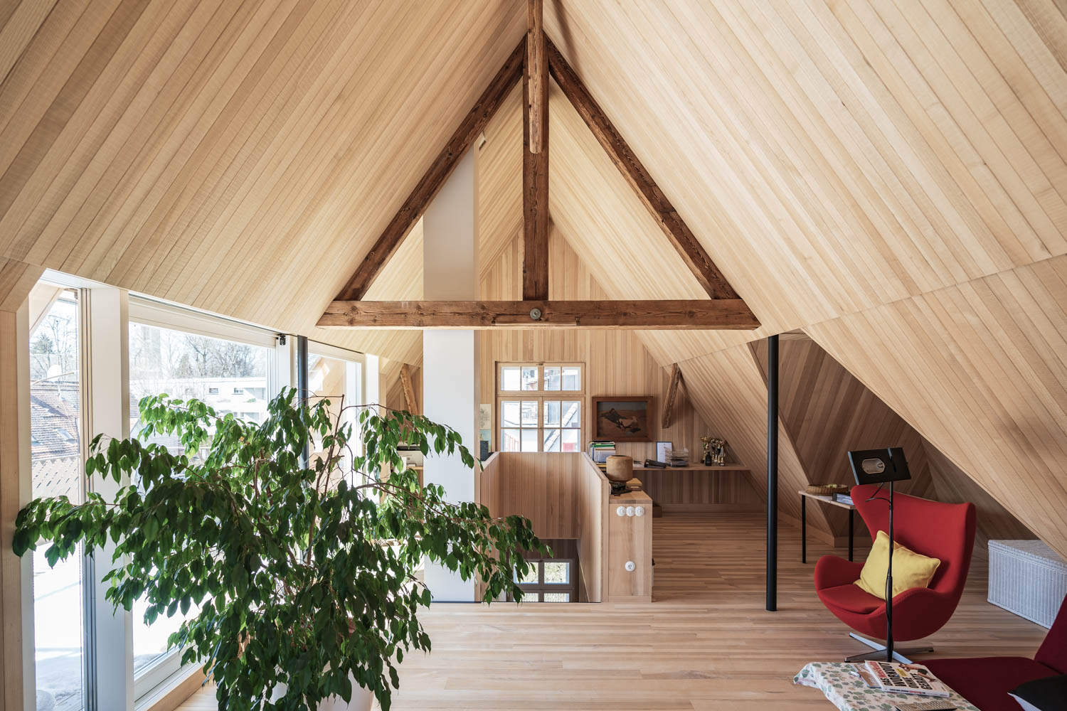 The wall elements and the roof have been thermally optimised using fibreboard and the interior with rough-sawn ash wood panelling, the floors and ceilings are also covered with this material. By maintaining the historical gems an identity-forming part of the cityscape is preserved, which once represented modernity.