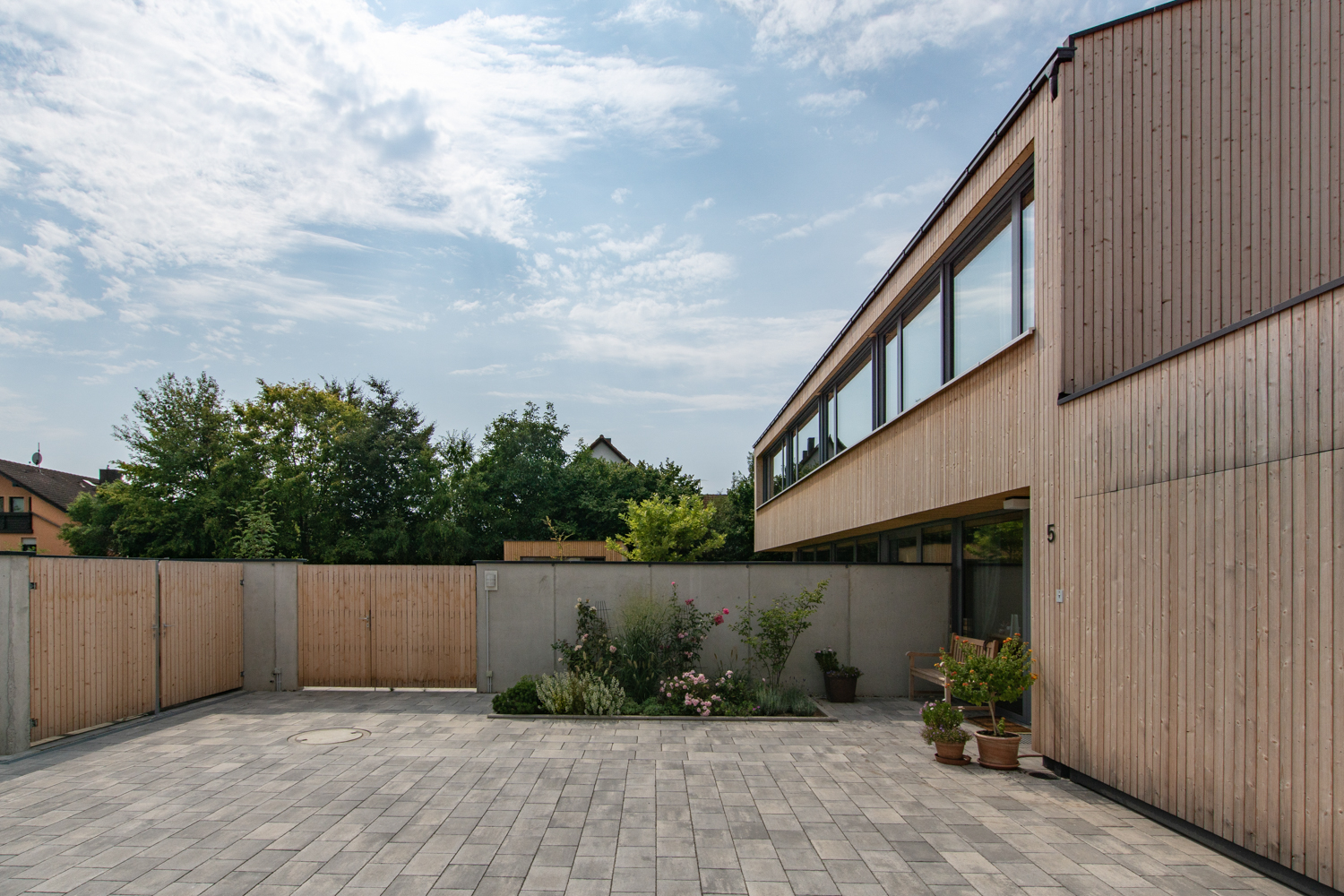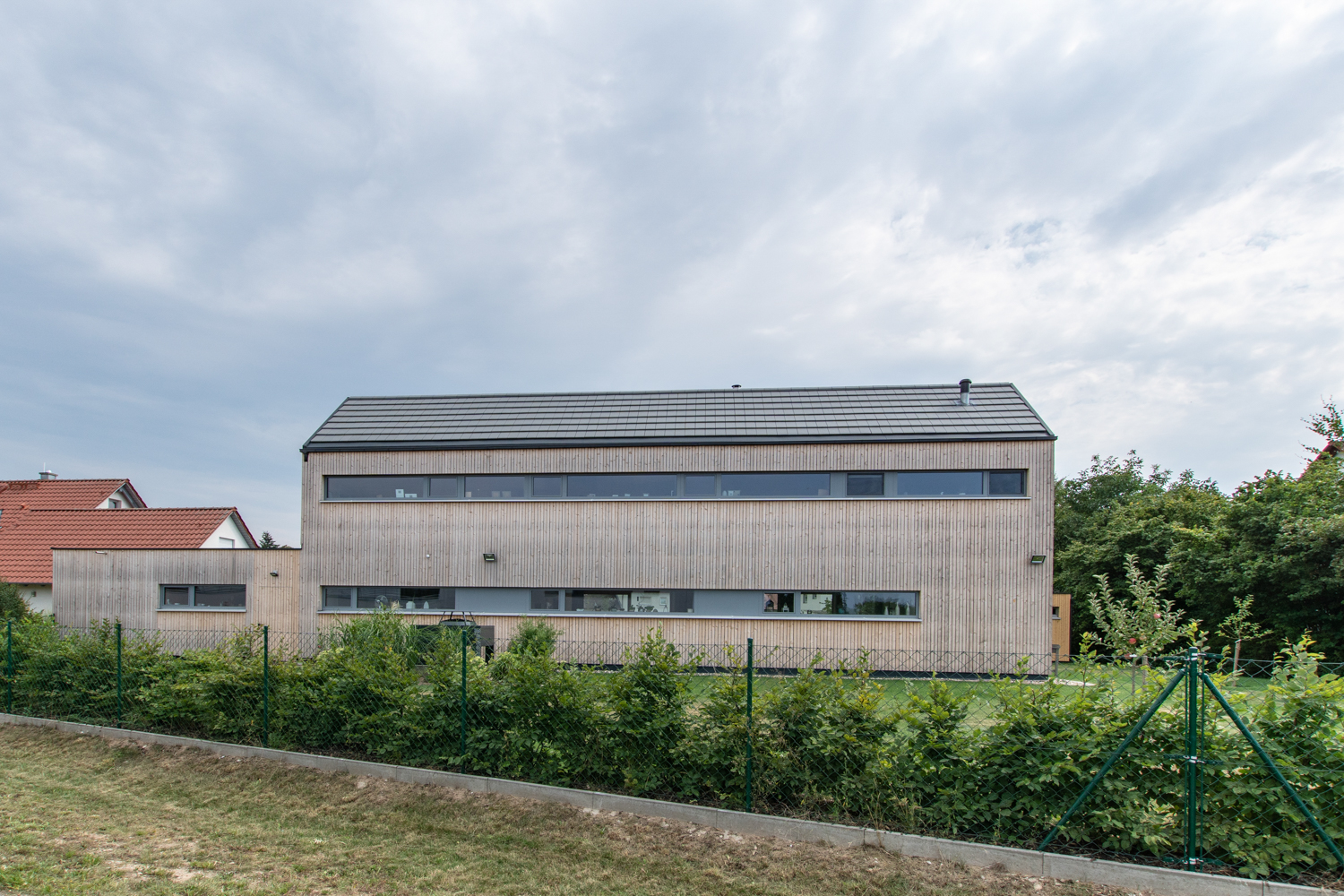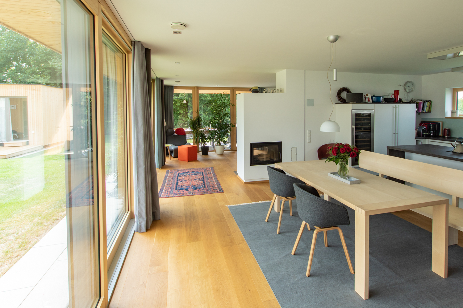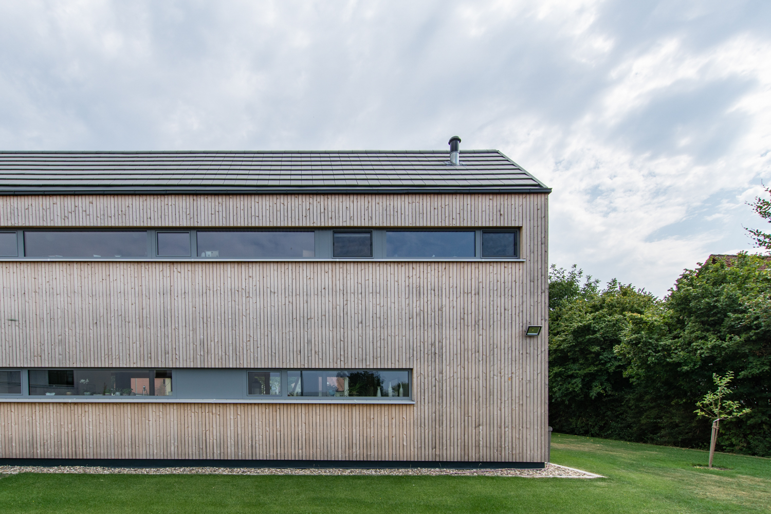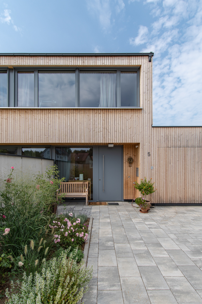 As visitors on holiday to Bregenzerwald, thrilled by the Vorarlberg architecture, the family of construction developers wanted a carefully thought out house built from timber. It should also find its place in the context of their local community in Upper Franconia.The result is a tailor-made building volume whose rooms blend into each other, alternating from dense to generous. The living and sleeping areas open onto the sun filled garden planted with vegetation. On the north side the wide view onto the landscape is played out through ribbon windows. Regional craftsmen worked on the construction site, the high-quality interior construction with flush-mounted floor-frame doors and wall-mounted beetles made of silver fir, was entrusted to a local carpenter.