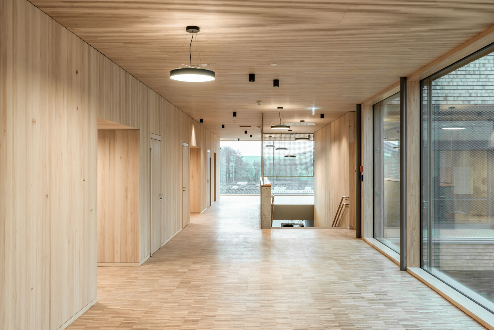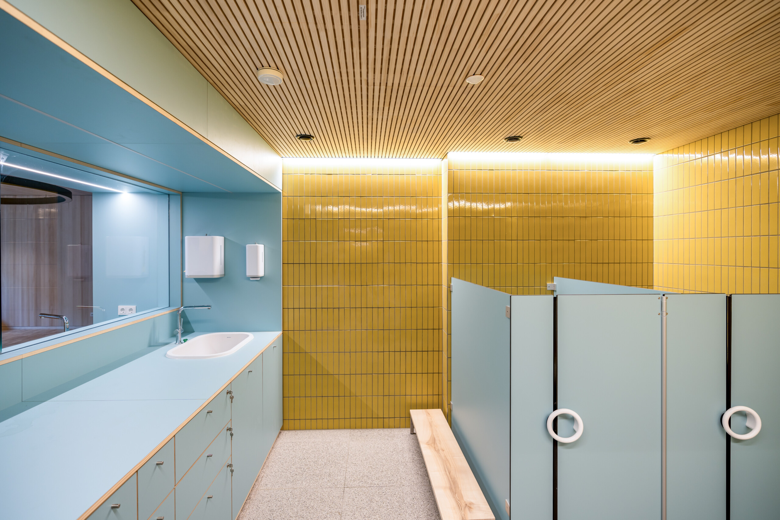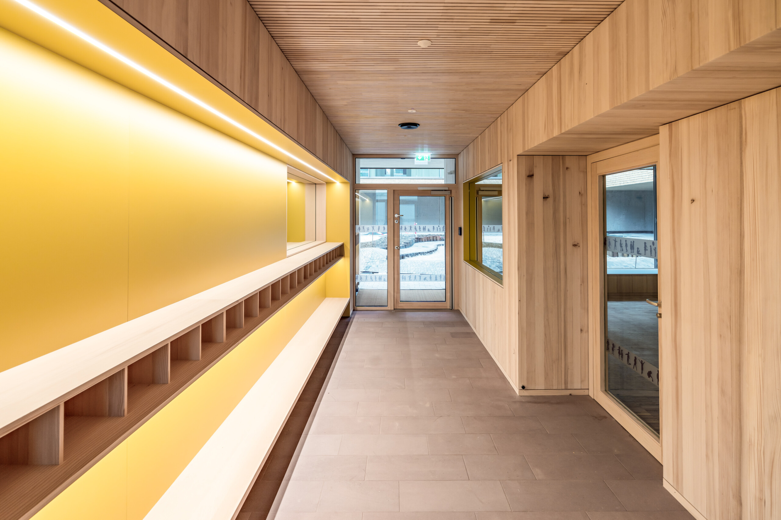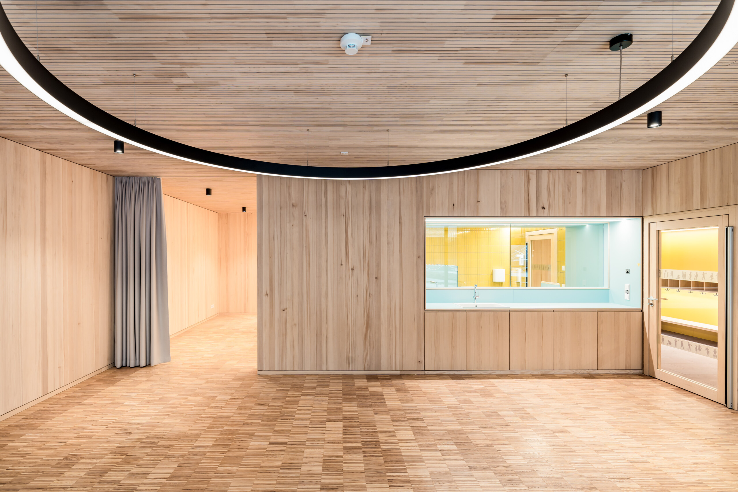 To support both the physical and emotional well-being of the children, the interiors have been designed with a warm, natural atmosphere and gentle colour accents. Parquet flooring and lightly brushed fir panelling offer tactile qualities that engage the senses.