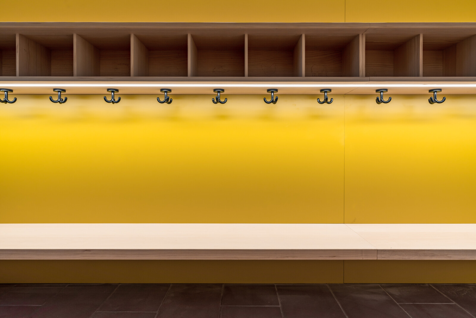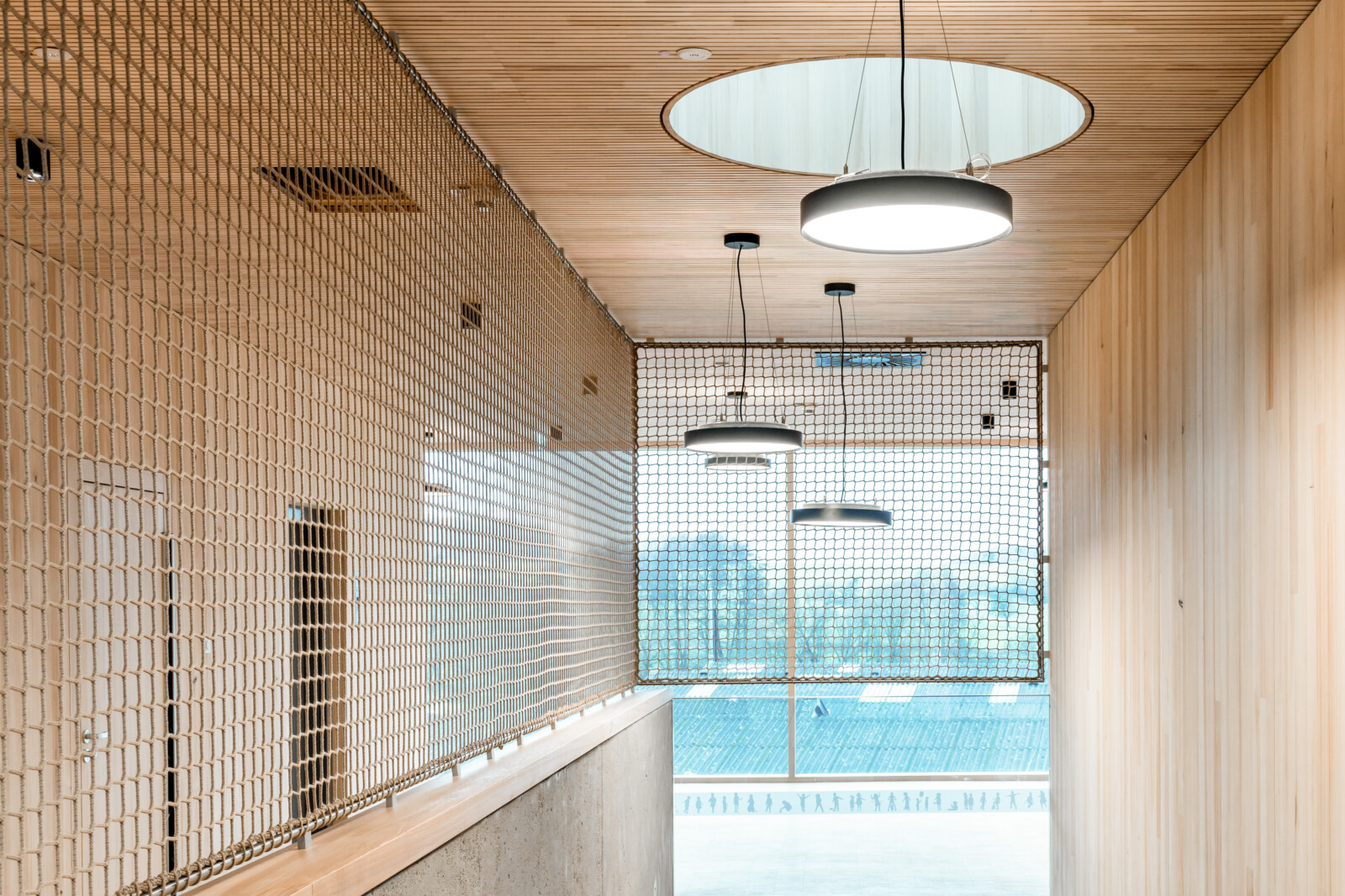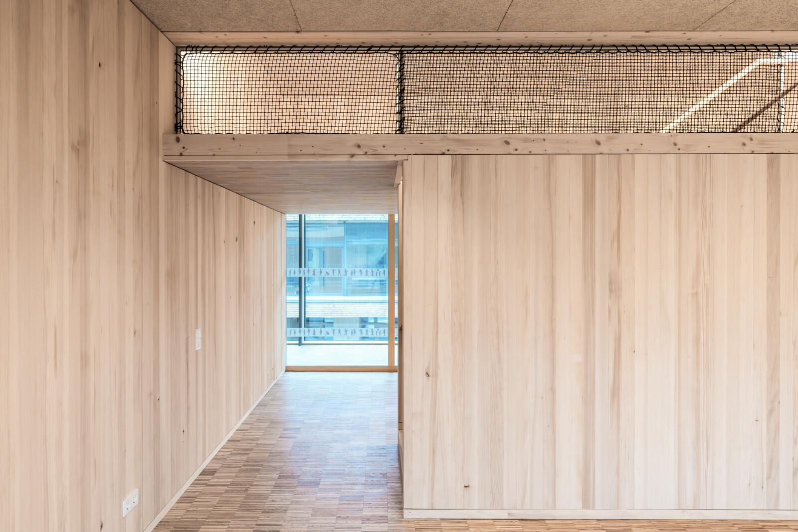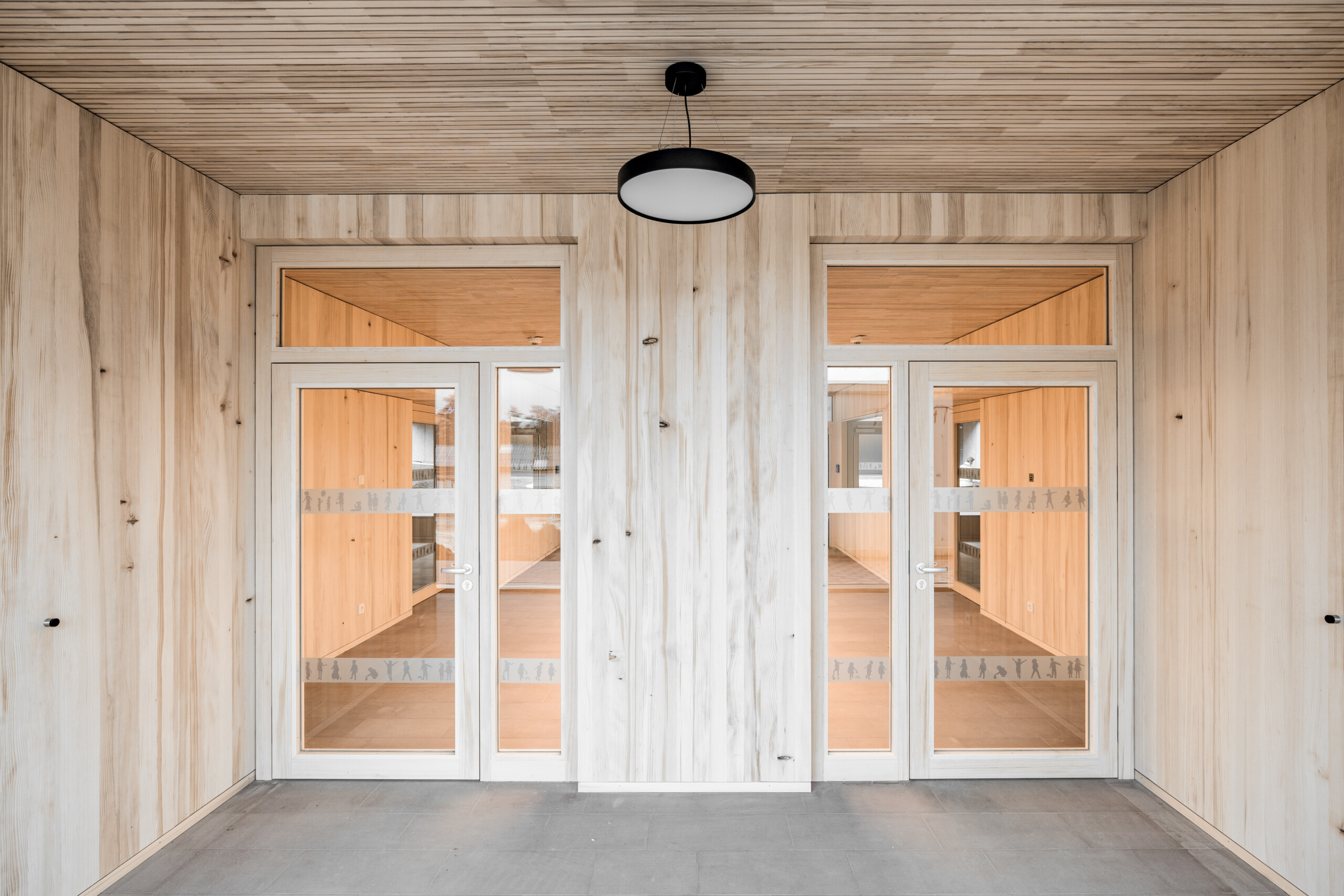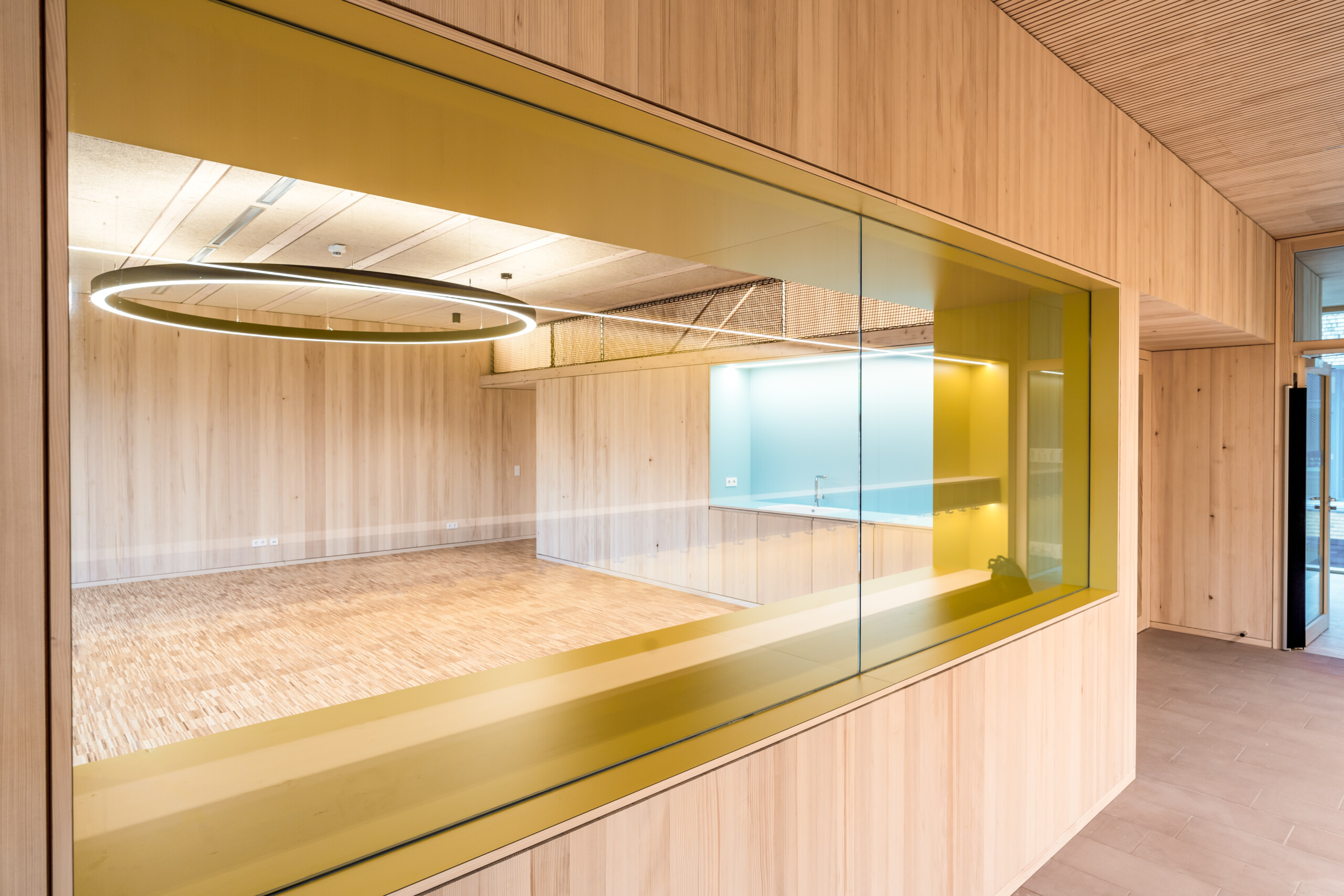To support both the physical and emotional well-being of the children, the interiors have been designed with a warm, natural atmosphere and gentle colour accents. Parquet flooring and lightly brushed fir panelling offer tactile qualities that engage the senses.