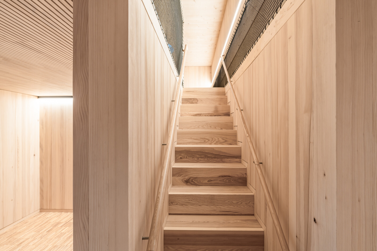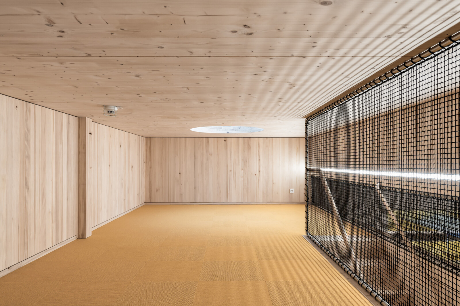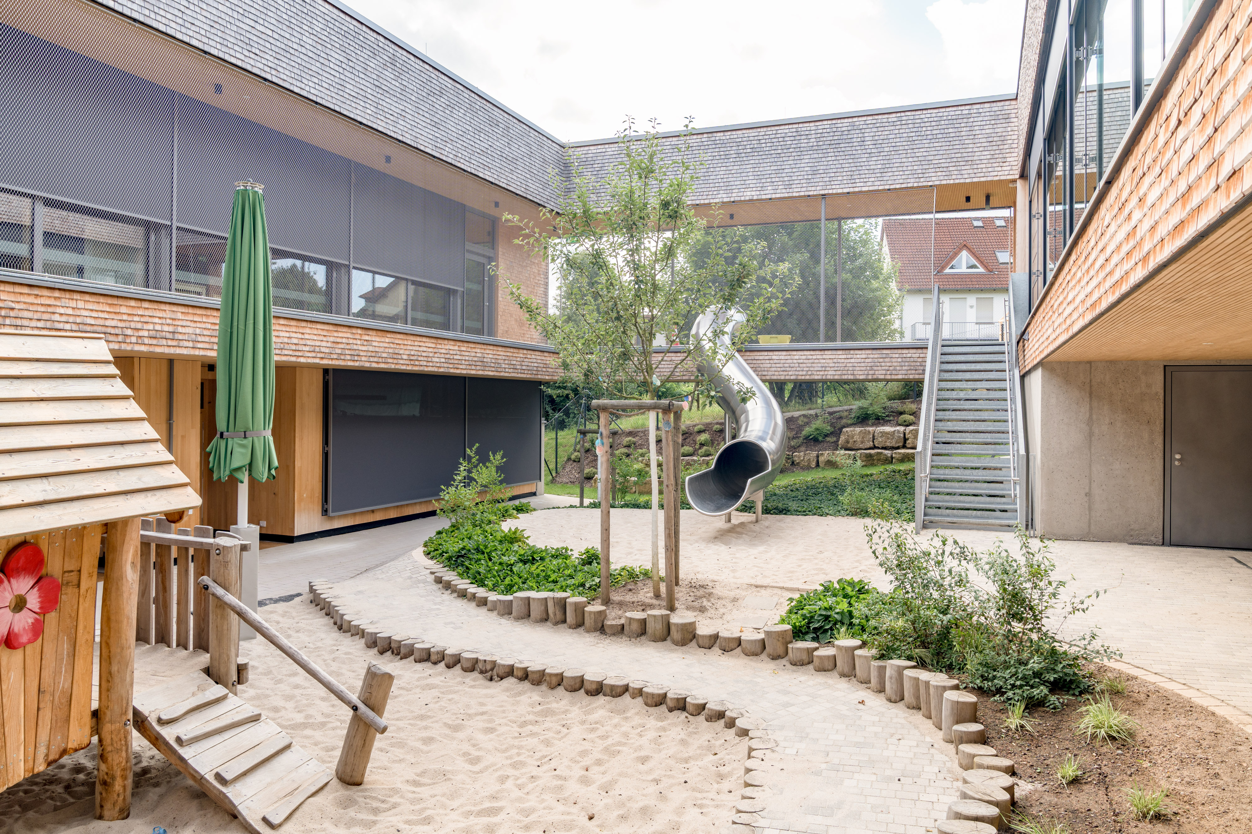 A two-flight staircase leads to the upper floor, which stretches along the hillside as a modular timber structure clad in finely detailed wooden shingles. Here, three group rooms for older children are oriented towards the afternoon sun. Play levels with reduced ceiling height offer spaces for retreat and comfort. A wrap-around loggia, with views and a slide leading down into the vibrant heart of the complex, encourages shared play and activity. As in the U3 (under-three) area below, each unit is equipped with its own cloakroom, changing facilities and sanitary rooms, ensuring a smooth and calm daily routine.