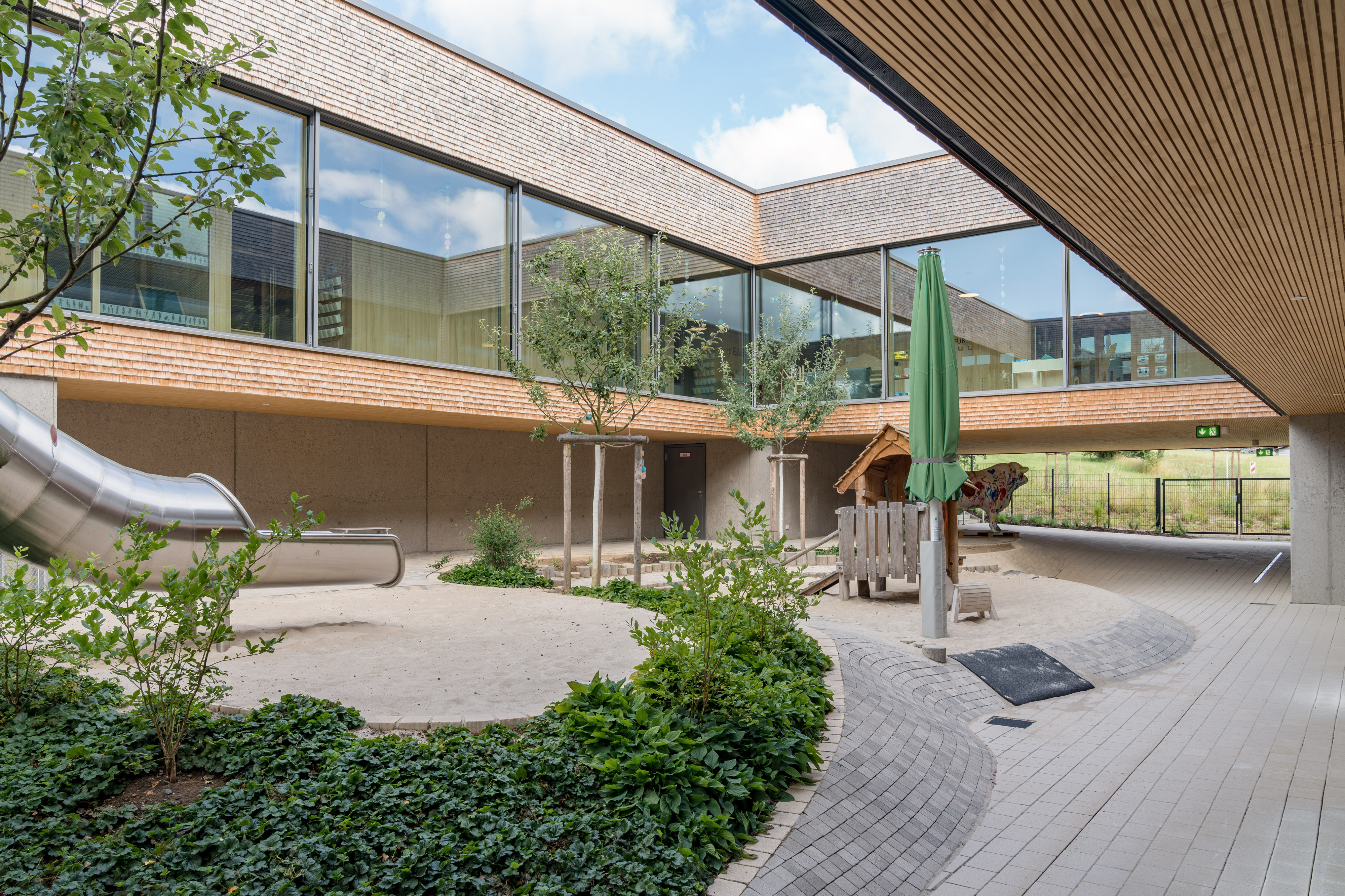 The gently sloping north-facing hillside presented both challenges and opportunities. The building takes shape as a distinctive standalone structure organised around a central atrium, which forms a generously proportioned play garden. Thoughtful integration into the terrain allows all group rooms to face south while maintaining ground-level access to outdoor spaces on both floors.