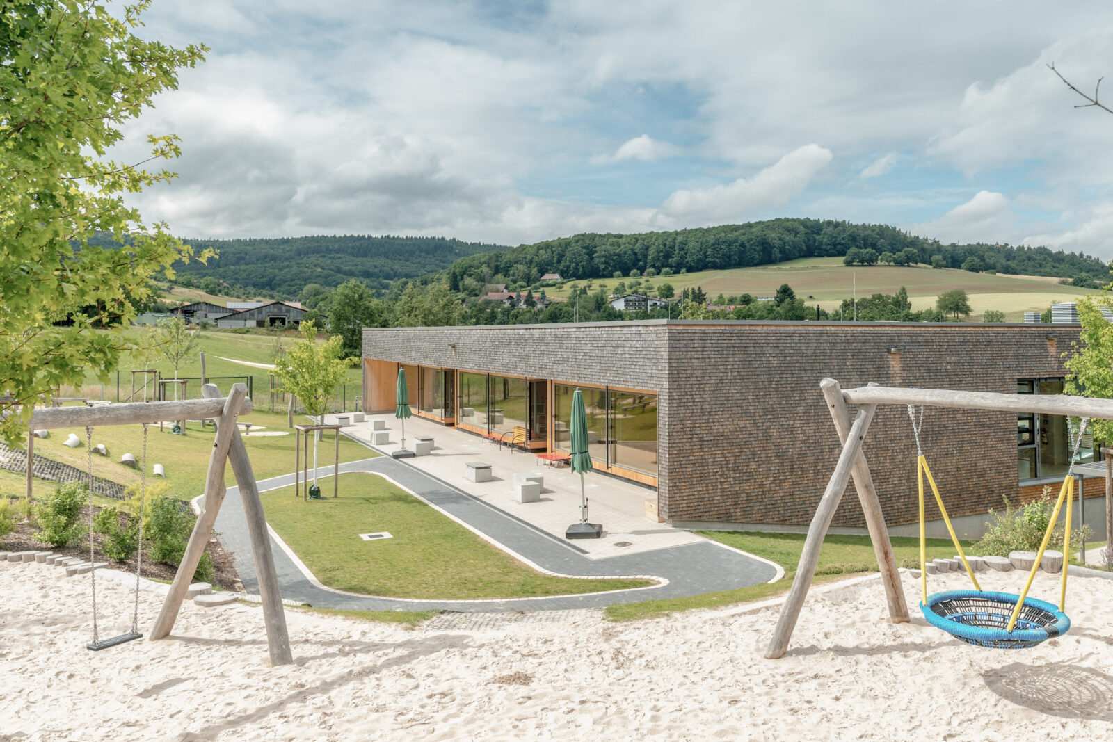 This landscape could easily have sprung from the pages of a Tolkien tale. Nestled within the soft contours of the Odenwald hills, the southern Hessian municipality of Reichelsheim extends at the foot of the Gothic Reichenberg Castle. A sunlit plot at the north-western edge of the settlement was selected as the site for the new day nursery—surrounded by orchard meadows scattered with woodland and the alder-lined wetlands of the Eberbach stream.