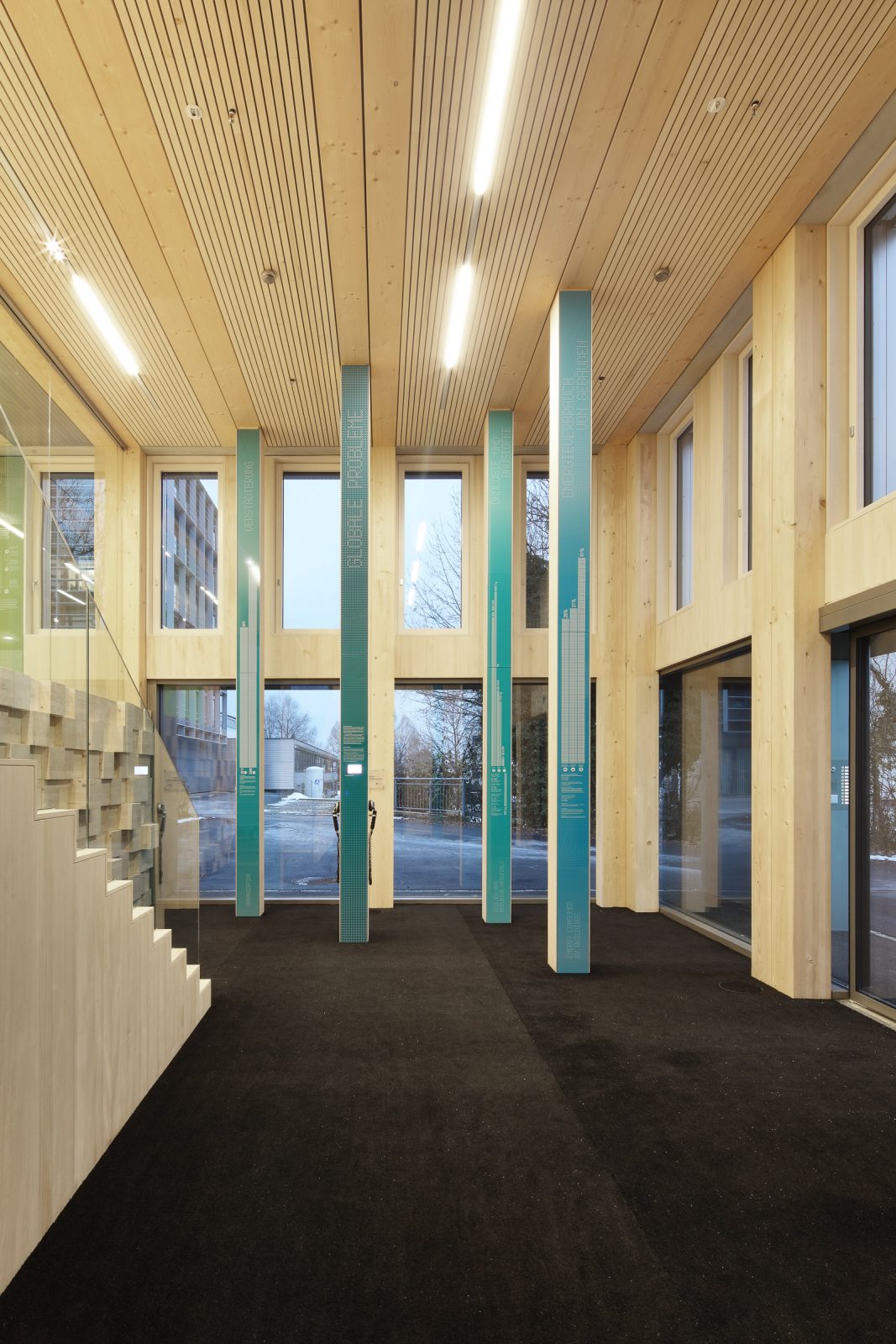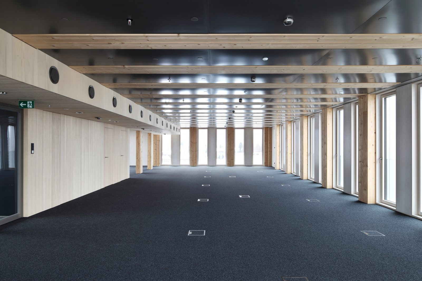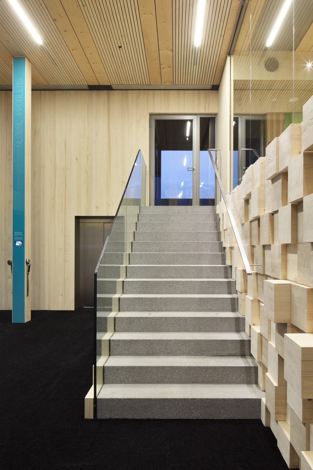 The building consists of a reinforced staircase core, bordering on one-side to the office space. Contrary to the original proposal to build the staircase core in wood, statutory provisions of fire prevention meant that the staircase had to be made in concrete.