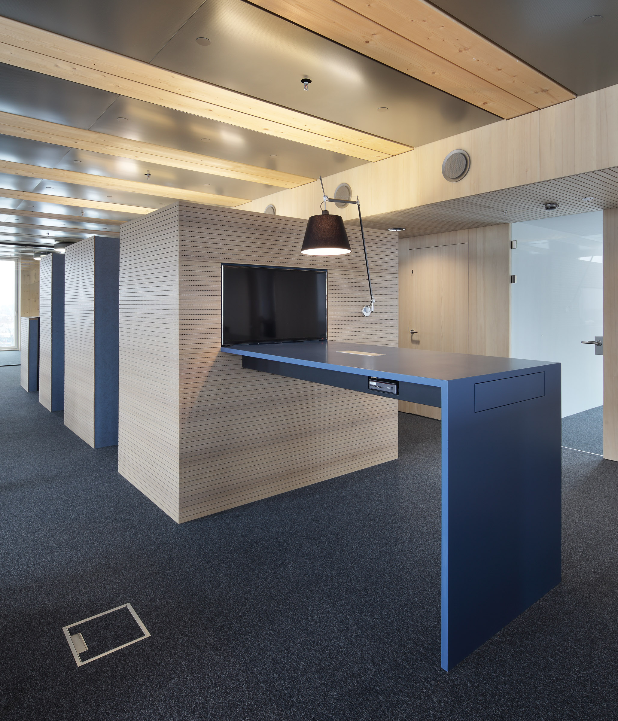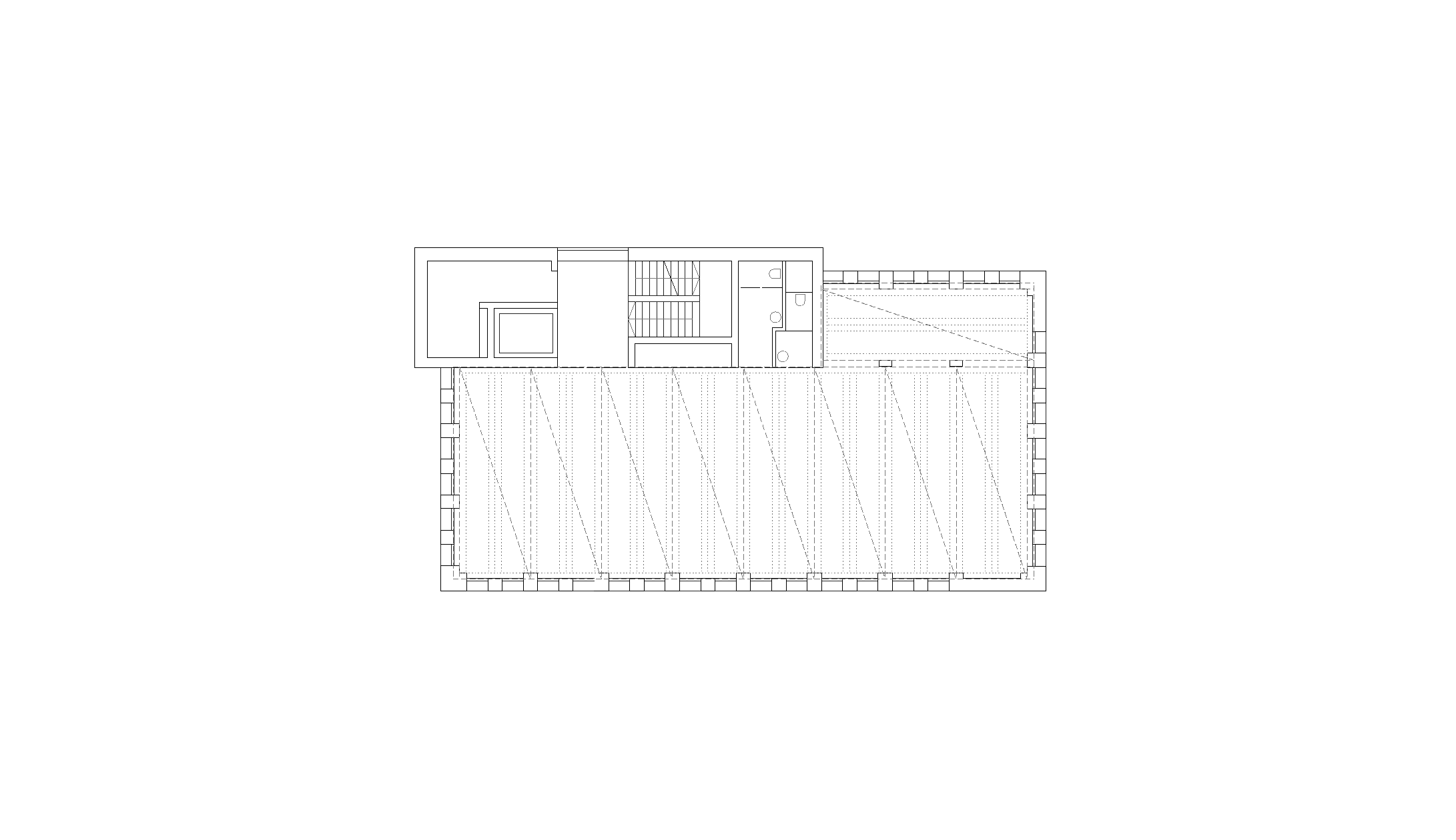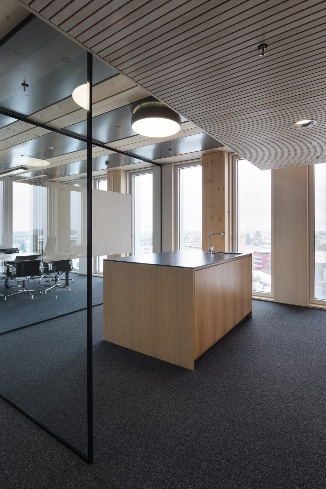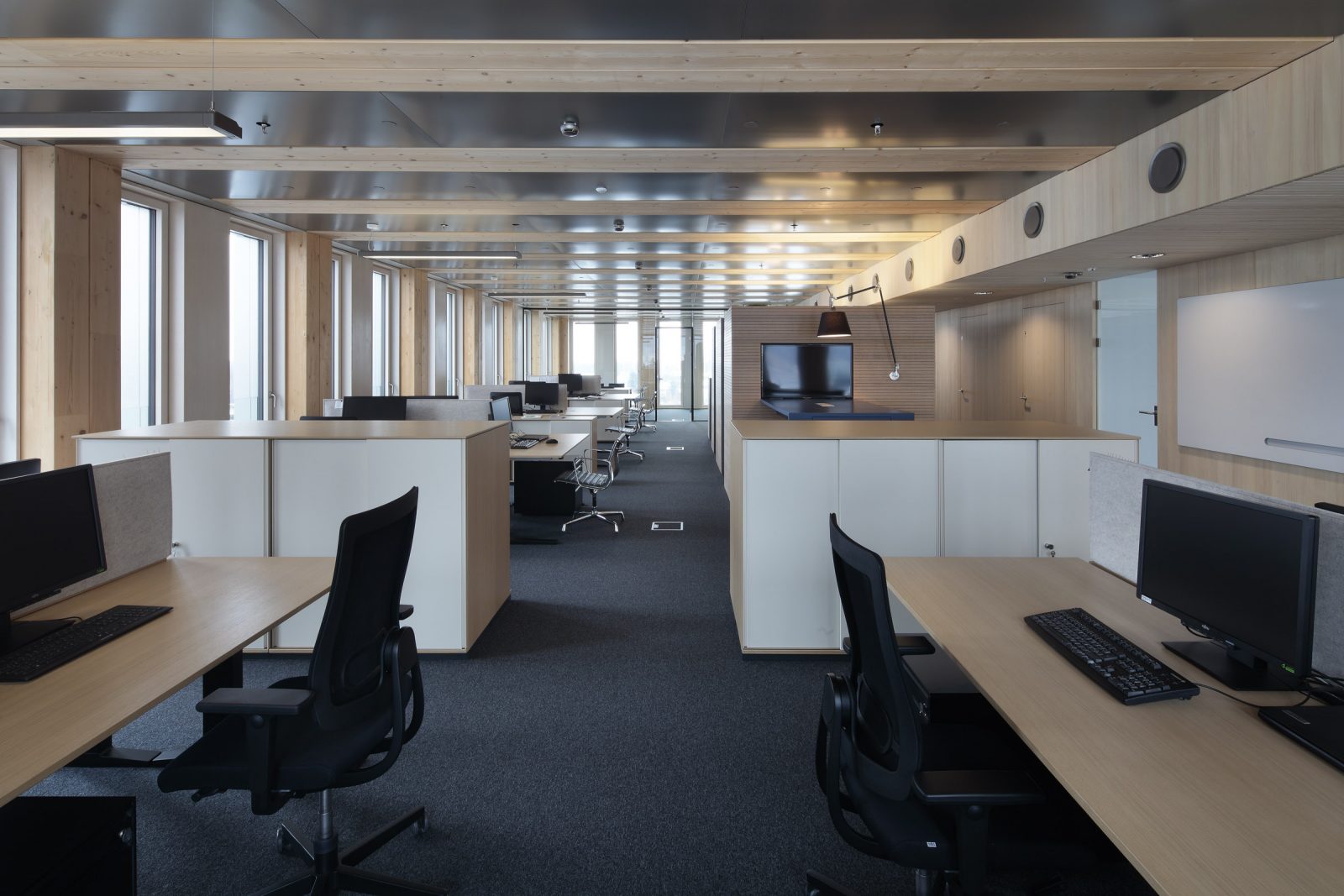 The building consists of a reinforced staircase core, bordering on one-side to the office space. Contrary to the original proposal to build the staircase core in wood, statutory provisions of fire prevention meant that the staircase had to be made in concrete.