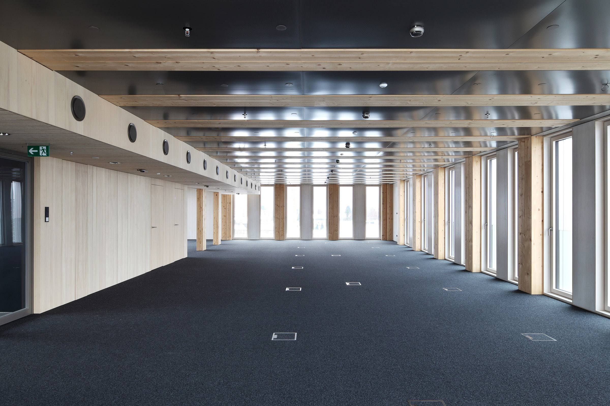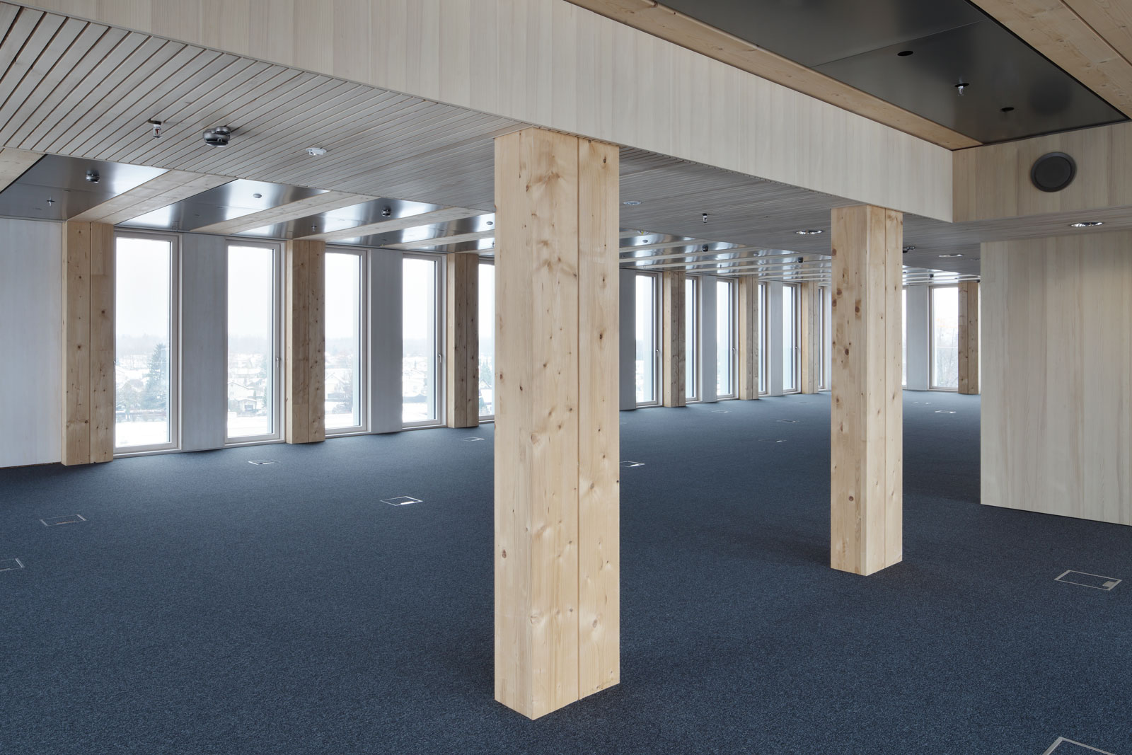 The connection between concrete and laminated timber construction is not made via complicated binding agents, but rather with screws and notches. A lintel beam of concrete contributes considerably to the distribution of the enormous forces from the load bearing façade. The cross-grained wood of the double bearings stands directly on the concrete; the connecting arbour is grouted to the pre-fabricated segment on site. This lintel beam facilitates the necessary separation of the construction in terms of fire protection for every floor.