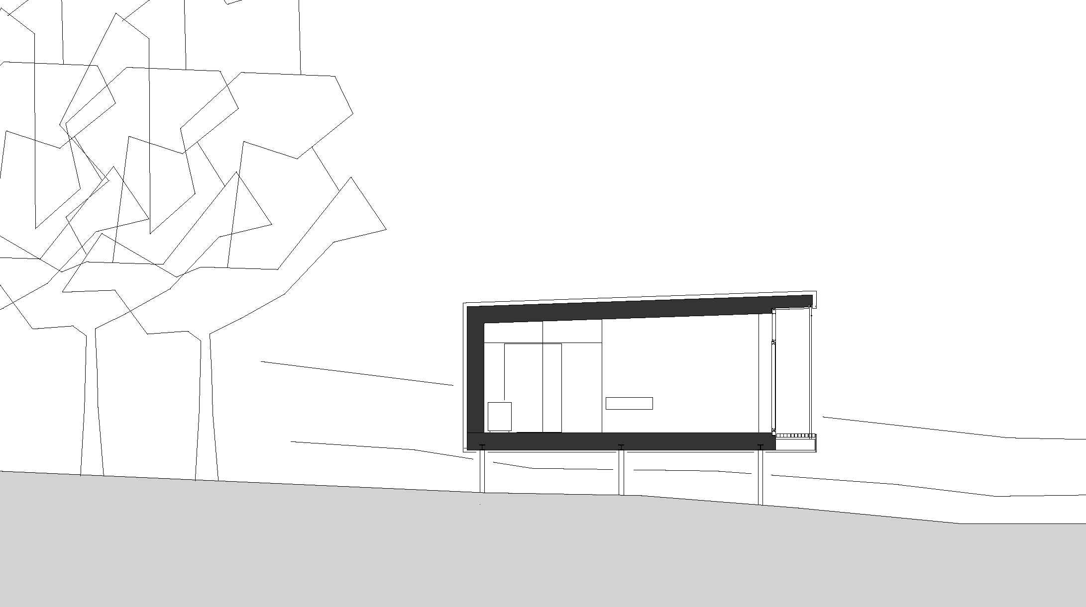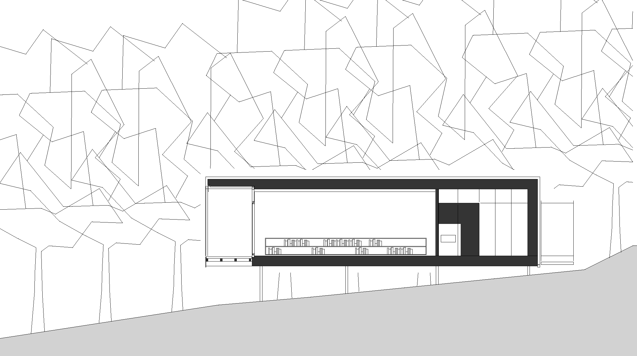 A skin of rubber tracks winds around this material skeleton as a protective weather cover. Due to the hillside location and the proximity to the residential street the building stands above the earth and the ground runs underneath it.