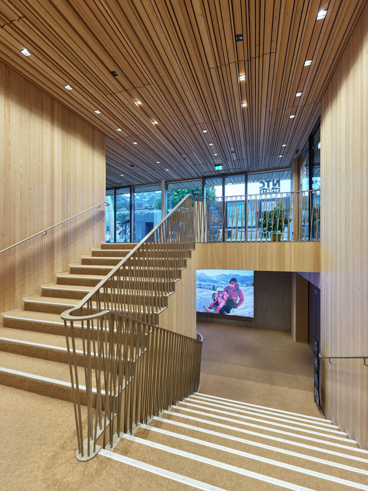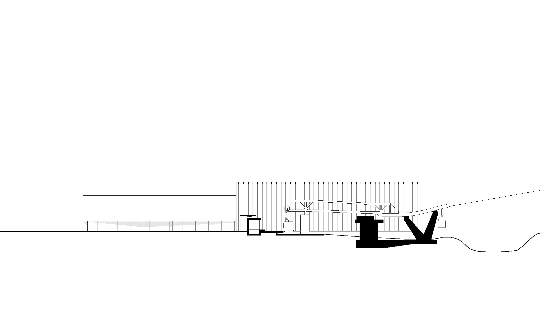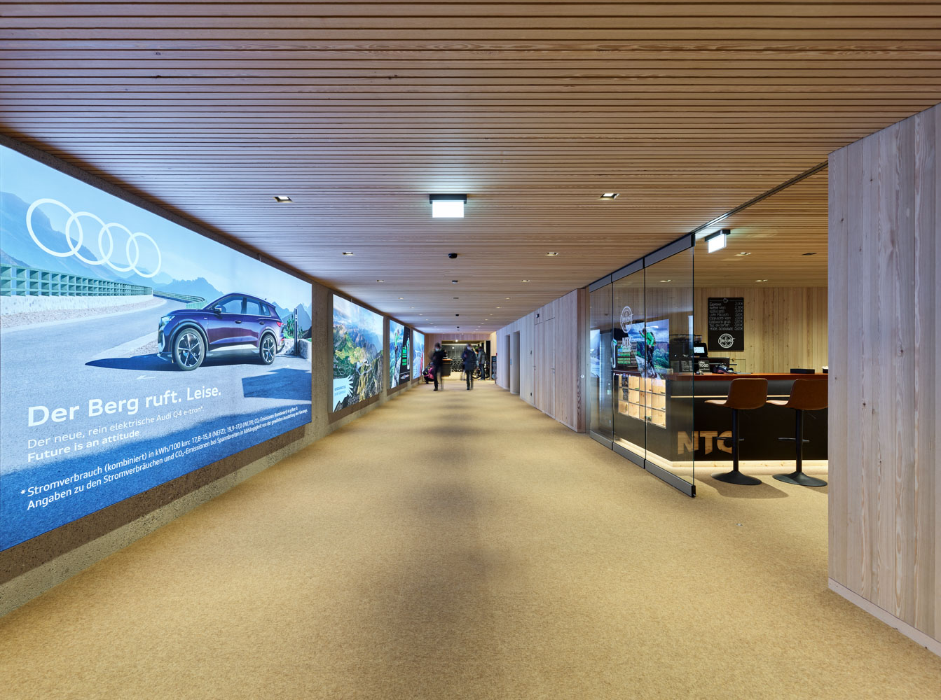The covered cash desk area and the entrances to the shop, the toilet facilities and the ski depot are clearly laid out and compactly located near the Cable Car station on the valley floor, to which the administration building is directly connected, in order to ensure smooth to ensure smooth operations. This part of the ensemble was built in a mixed construction; the ceilings and the access core are made of reinforced concrete, while the shell consists of timber elements. Like the façade of the service building, it is clad with untreated rough-sawn larch wood.