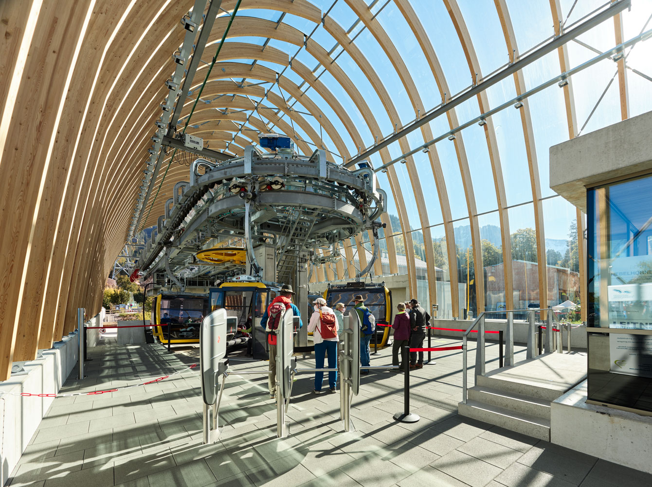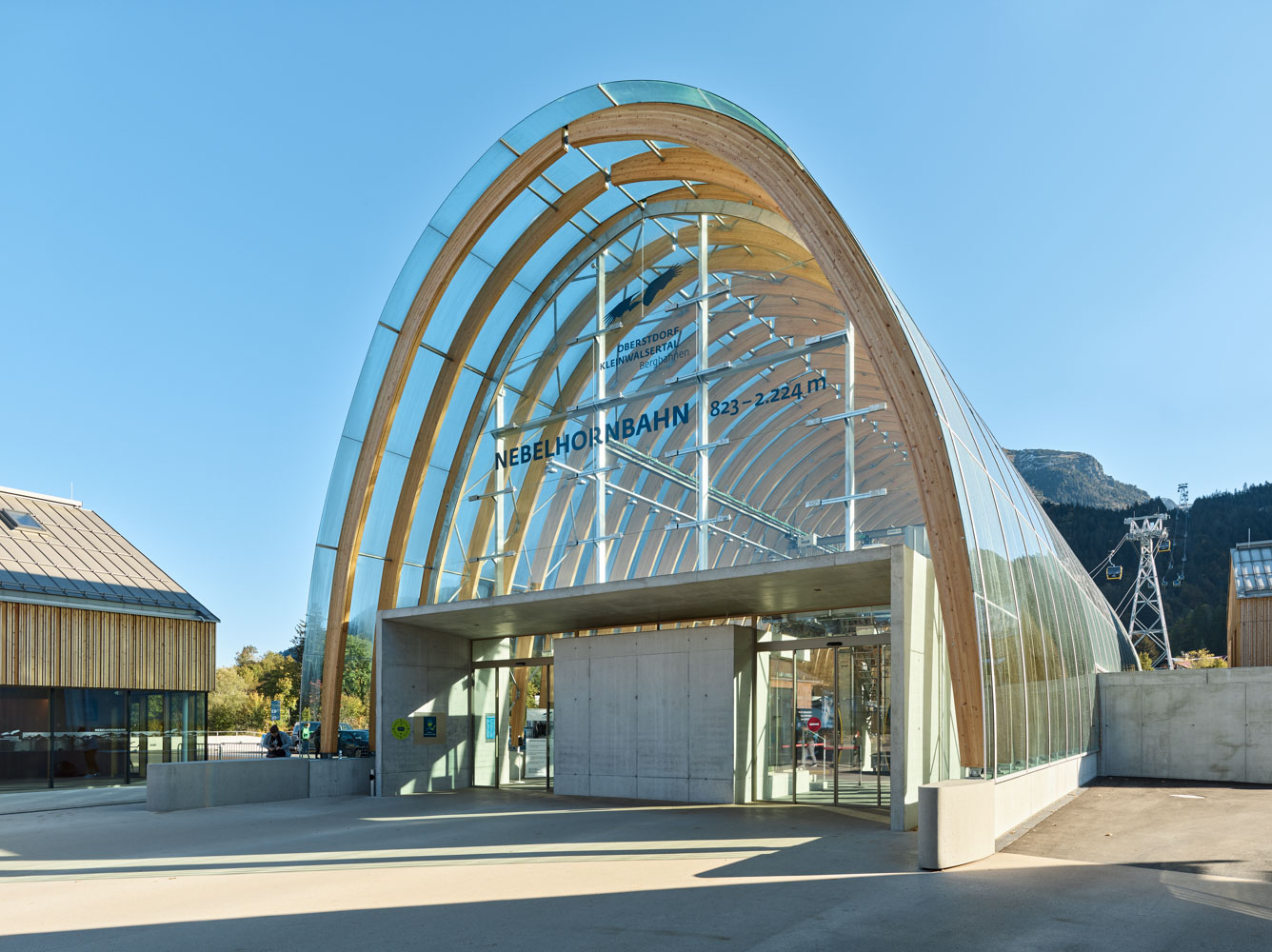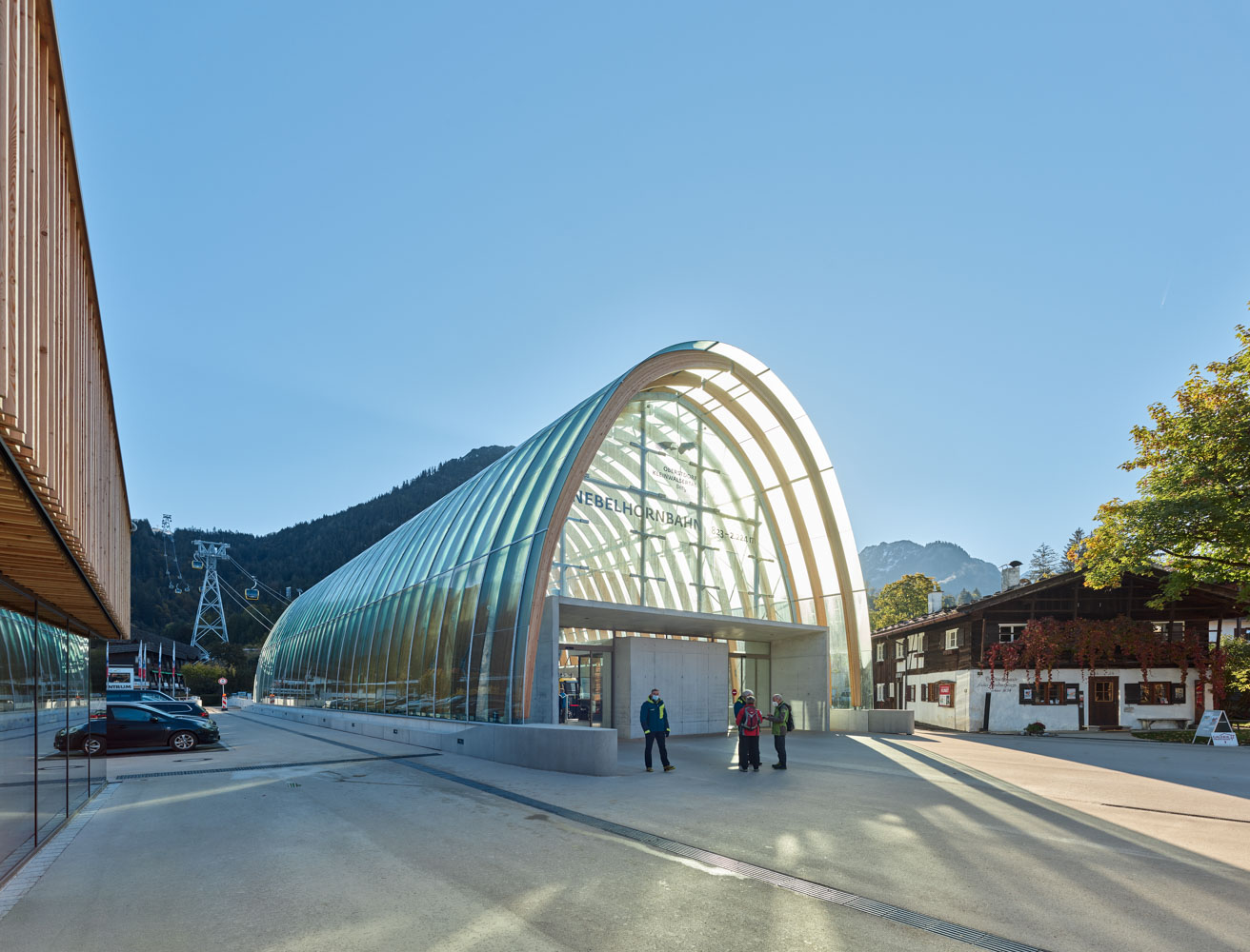 The Cable Car station is interpreted as a natural part of Oberstdorf’s public space. It serves as a central point of contact for visitors. Reducing the architecture to its pure function underlines its significance as a direct interface between the local area and the alpine landscape. A regular row of timber parabolas, encased in curved laminated safety glass, creates a shimmering transparent volume that radiates lightness and openness. Depending on the direction of travel, the structure is perceived as a gateway to the mountains or to the valley.