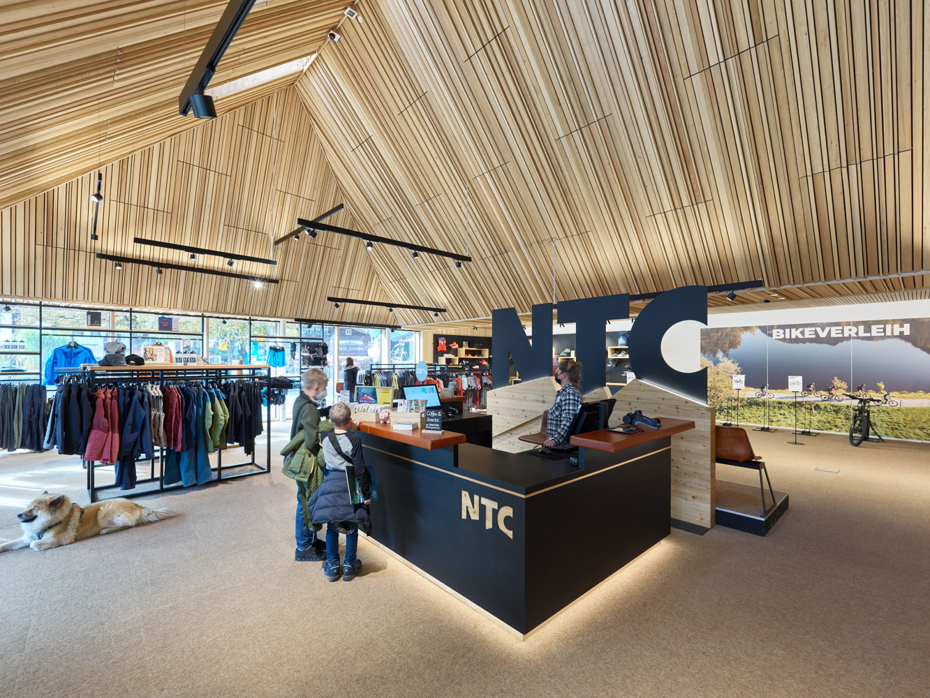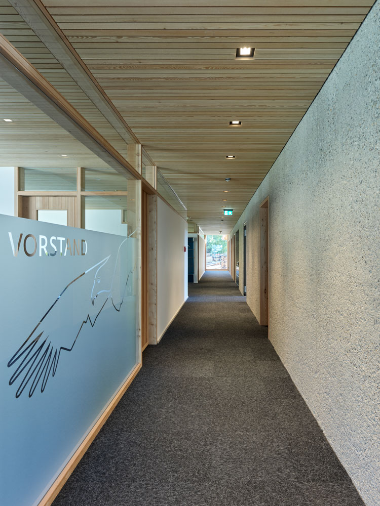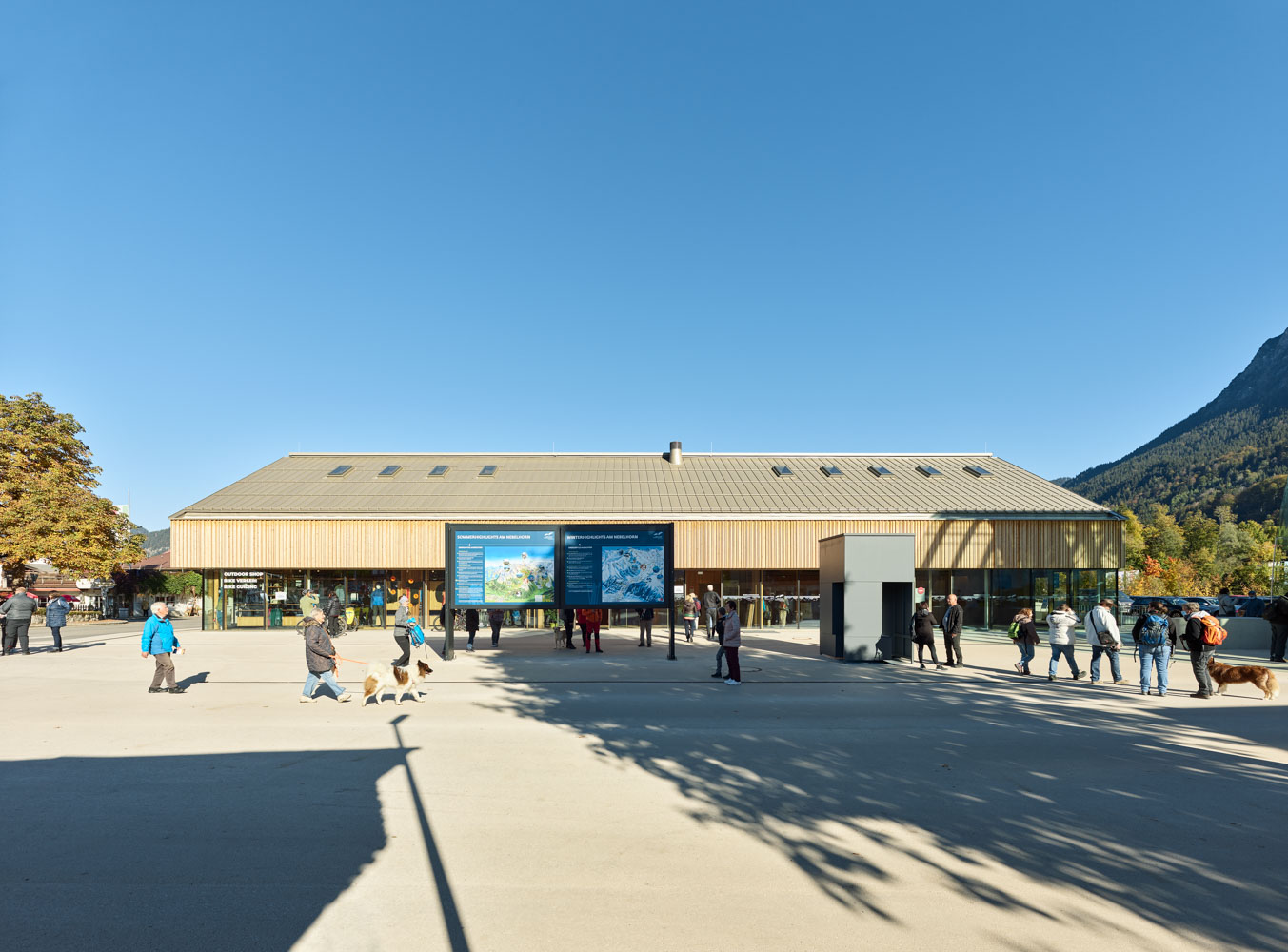 The elongated service centre is essentially a purely timber construction and its striking shape frames the street space and defines the street space through its prominent placement at the crossroads. It separates the motorised traffic and the parking areas from a generously proportioned square as a direct extension of the pedestrian zone, which enables passers-by to find their way around.