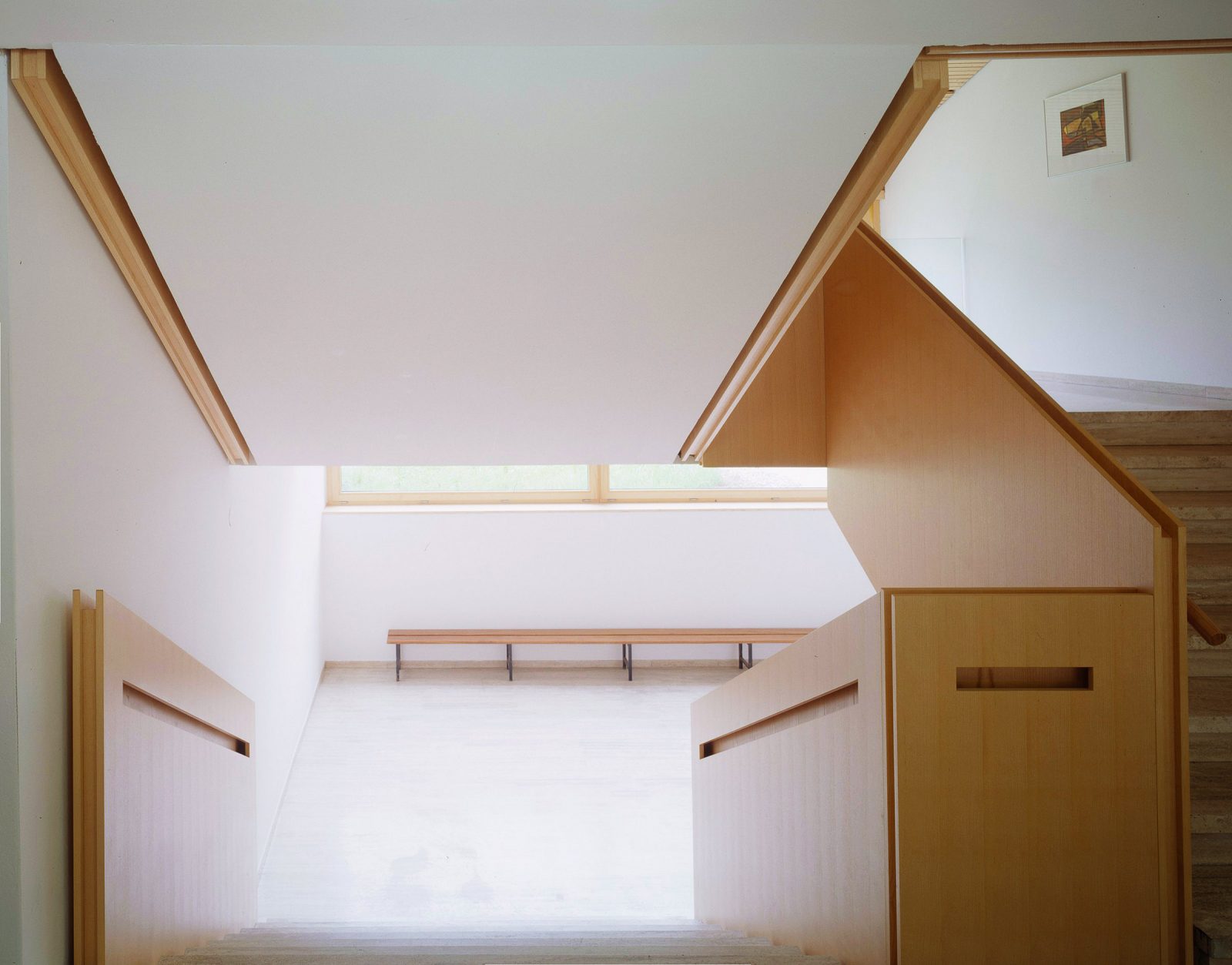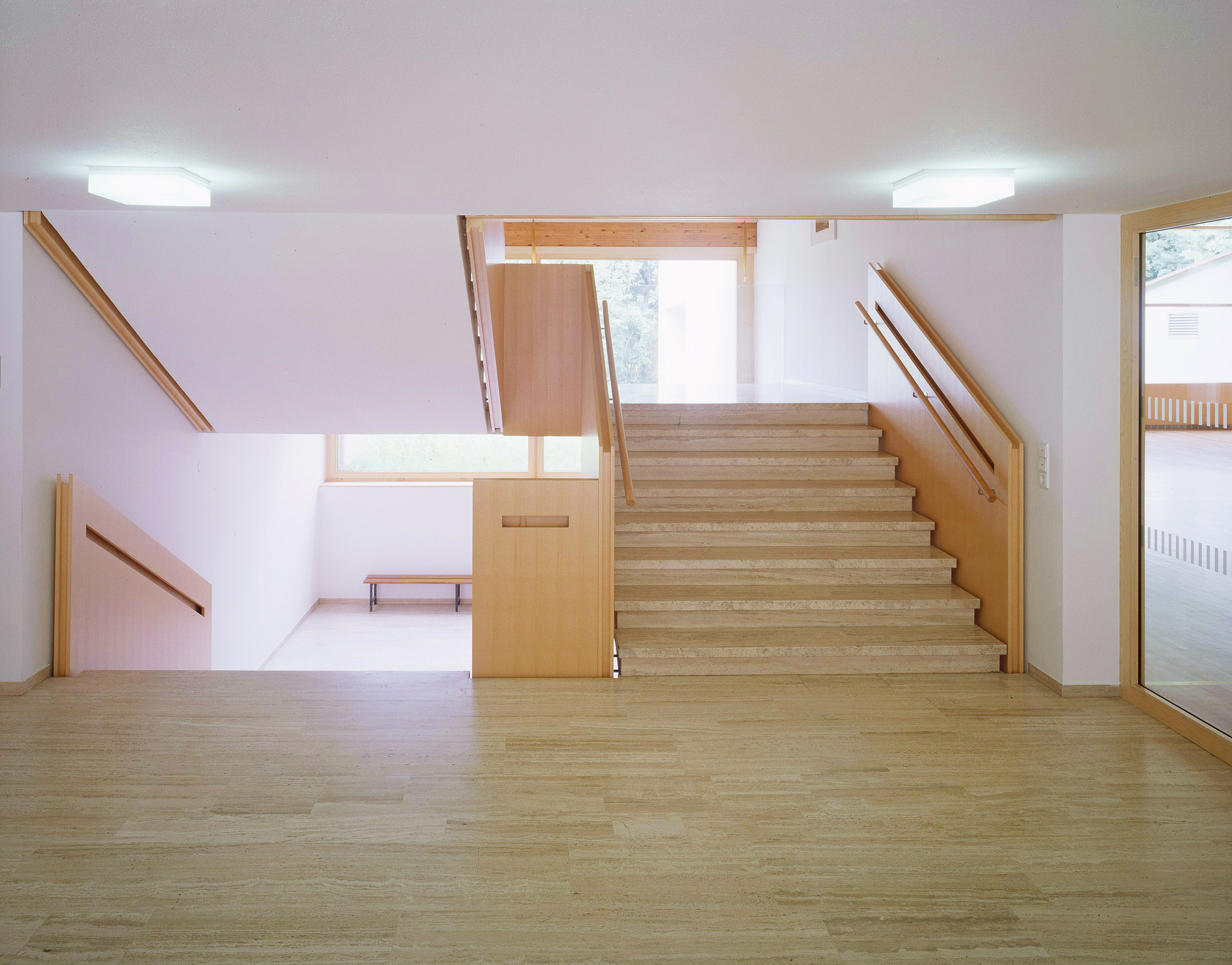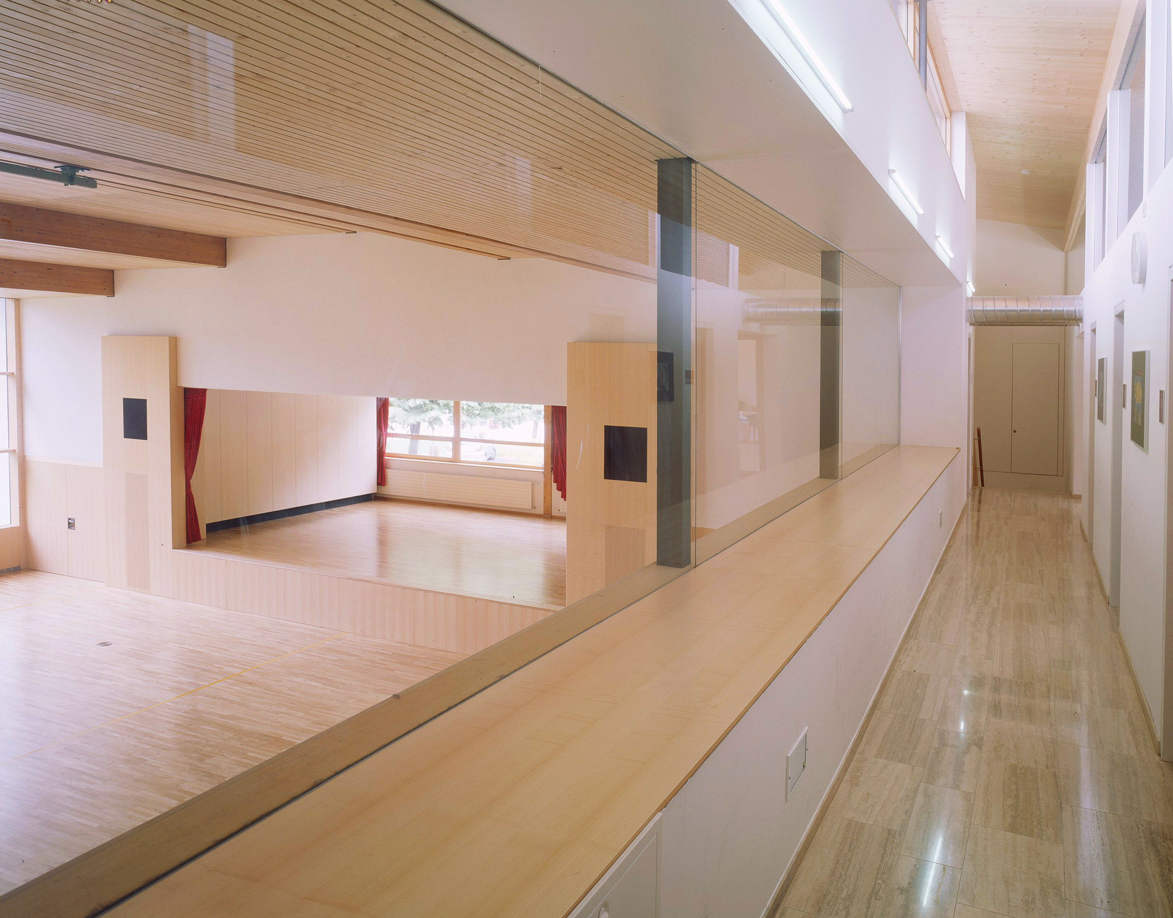 Together with the church and the municipal office, this building, from 1968 forms a trio which defines the centre of this town in Bregenzerwald. Designed by Jakob Albrecht, the structure incorporates a school, kindergarten and a multi-purpose hall under a functionally effective composition of staggered saddle and single-pitched roofs.