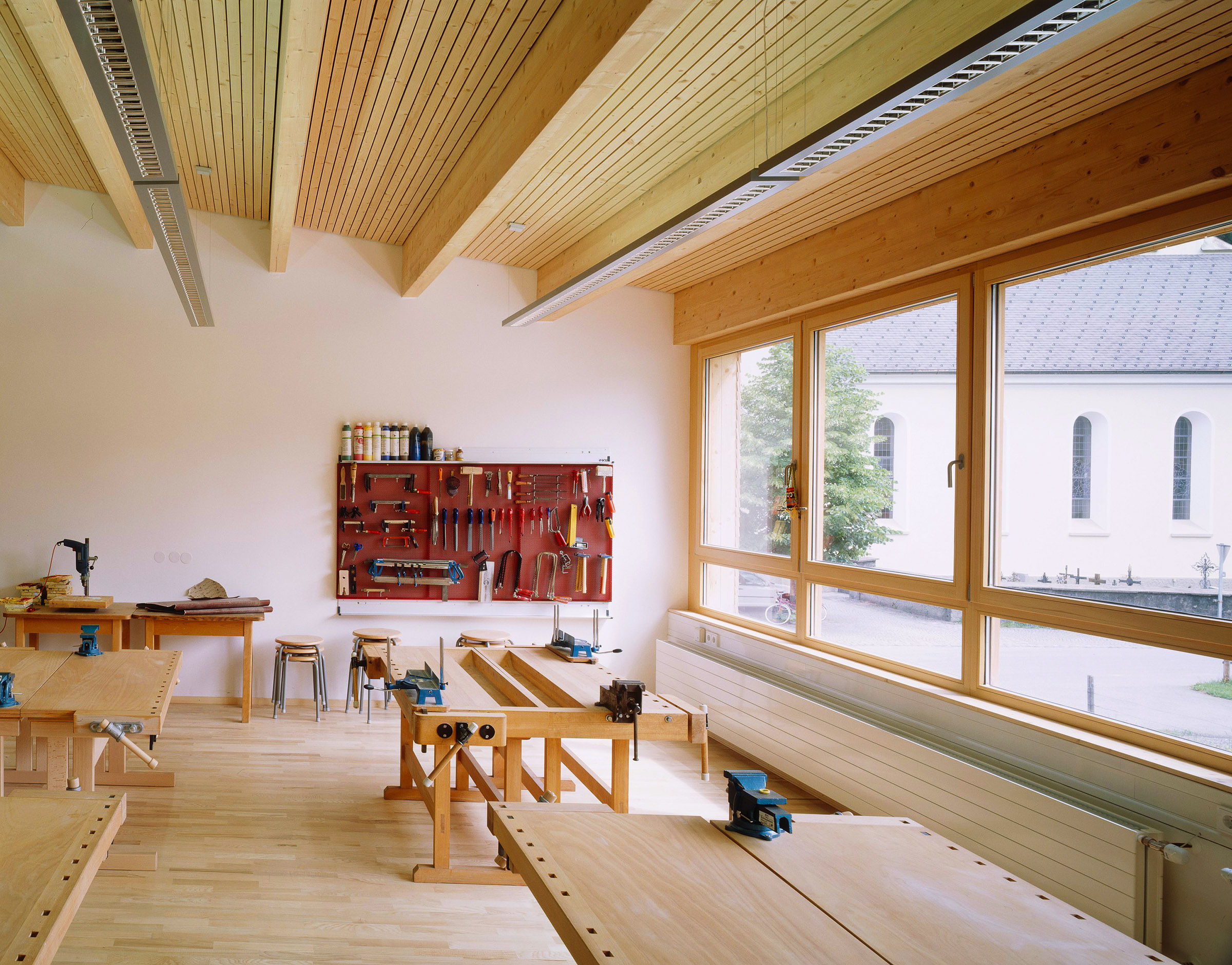 The building has been technically and functionally upgraded to be state of the art. The building envelope, the roof, facade and windows, together with the mechanical systems have been retrofitted and the interior fittings, including the furniture, have been replaced. The upper floor, which houses the school, was extended on the north side, providing space for a new workshop, as well as for the toilet and shower facilities with changing rooms of the gymnasium and event space.