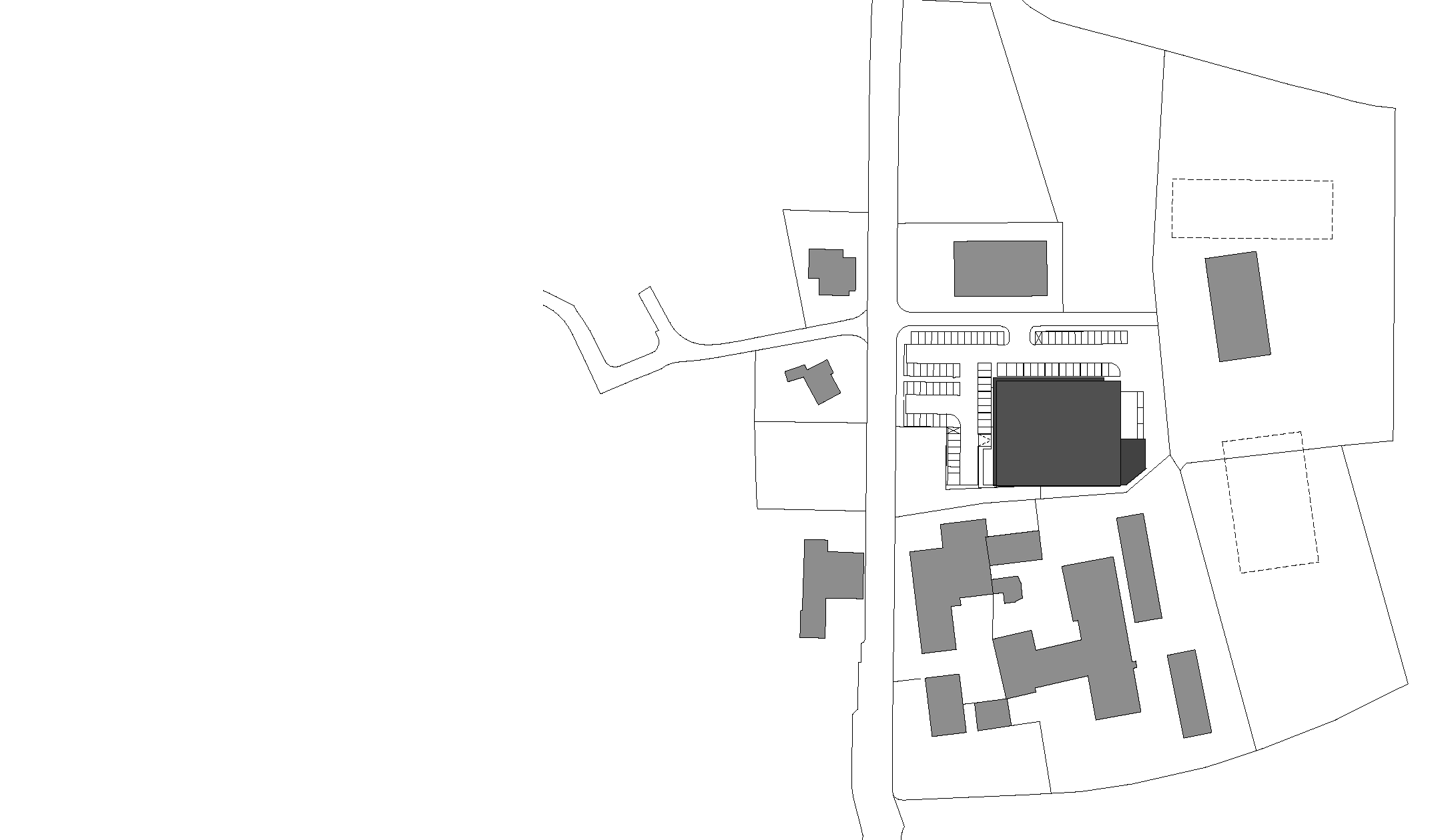 It was necessary to dissolve the ridged volume of the building, and once the covered space required was calculated, we designed an overhanging feature that became a design highlight, and an element of the facade structure. While the actual insulated outer shell is clad in either aluminium or glazing, the protruding roof overhangs are designed as lightweight, translucent, transparent shrouding that is back-lit at night. This allows the store to get the necessary attention because it is set back from the road.