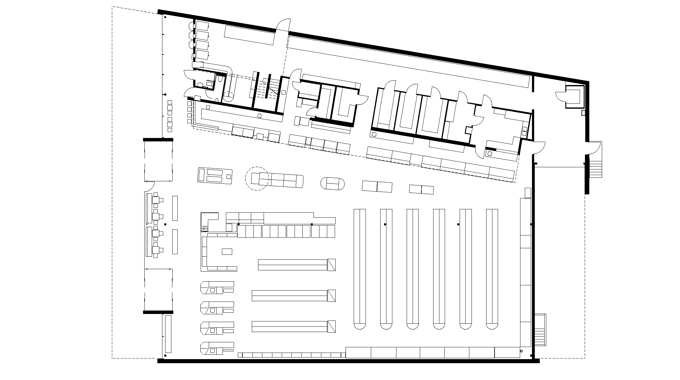 To continue the atmosphere of the bright spruce ceiling, the main girders, which have a width of up to 72 cm, have also been integrated into the ceiling. For installation purposes, a few lower sheathing strips were omitted and closed with three-layer boards after completion of the pipework. The lighting is suspended from the ceiling and directed at the shopping area.