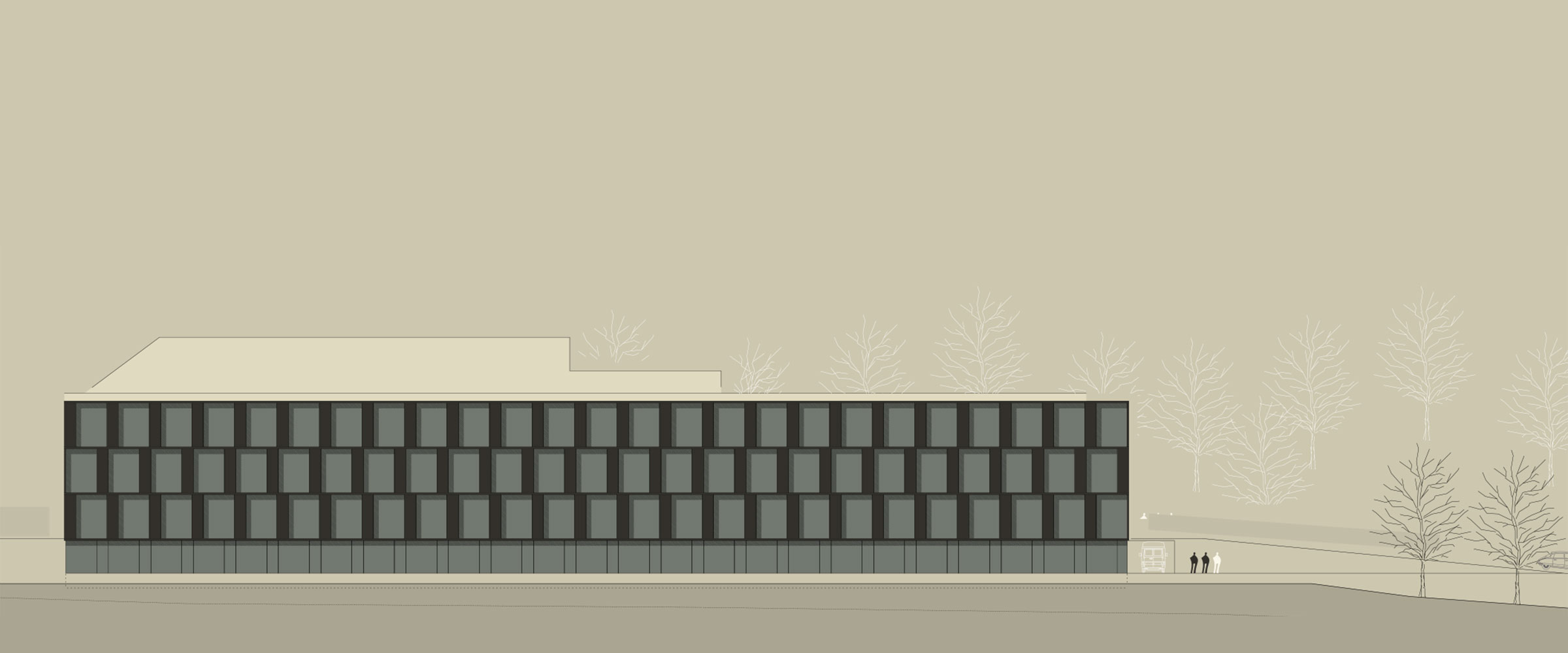 The Pryxis building is constructed above the basement floor in timber, the ceiling above the ground floor is designed as a composite ceiling. The roof, on the other hand, is to be formed in a comb-like structure, in which the squat timber cross-sections rest on undercarriages. The stiffening of the building is done by the formation of ceiling and roof windows.